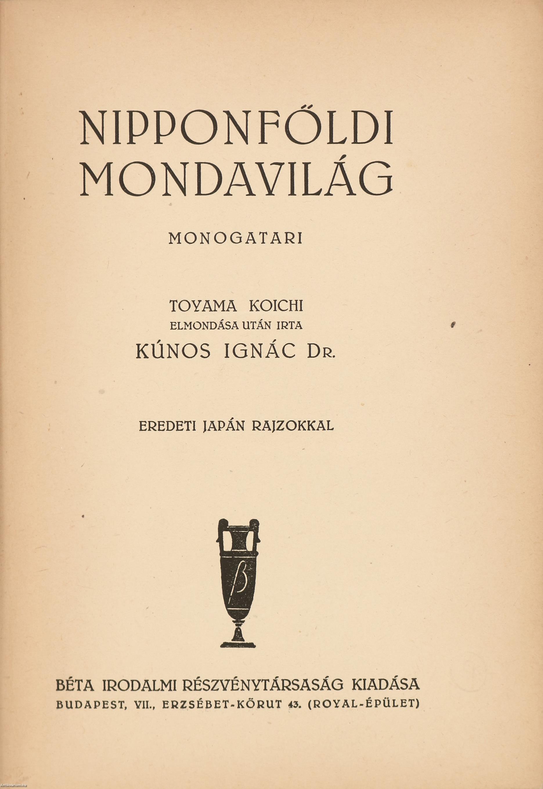 Első kiadás. Nipponföldi mondavilág. Monogatari. Toyama Koichi elmondása után írta: Dr. Kúnos Ignác.