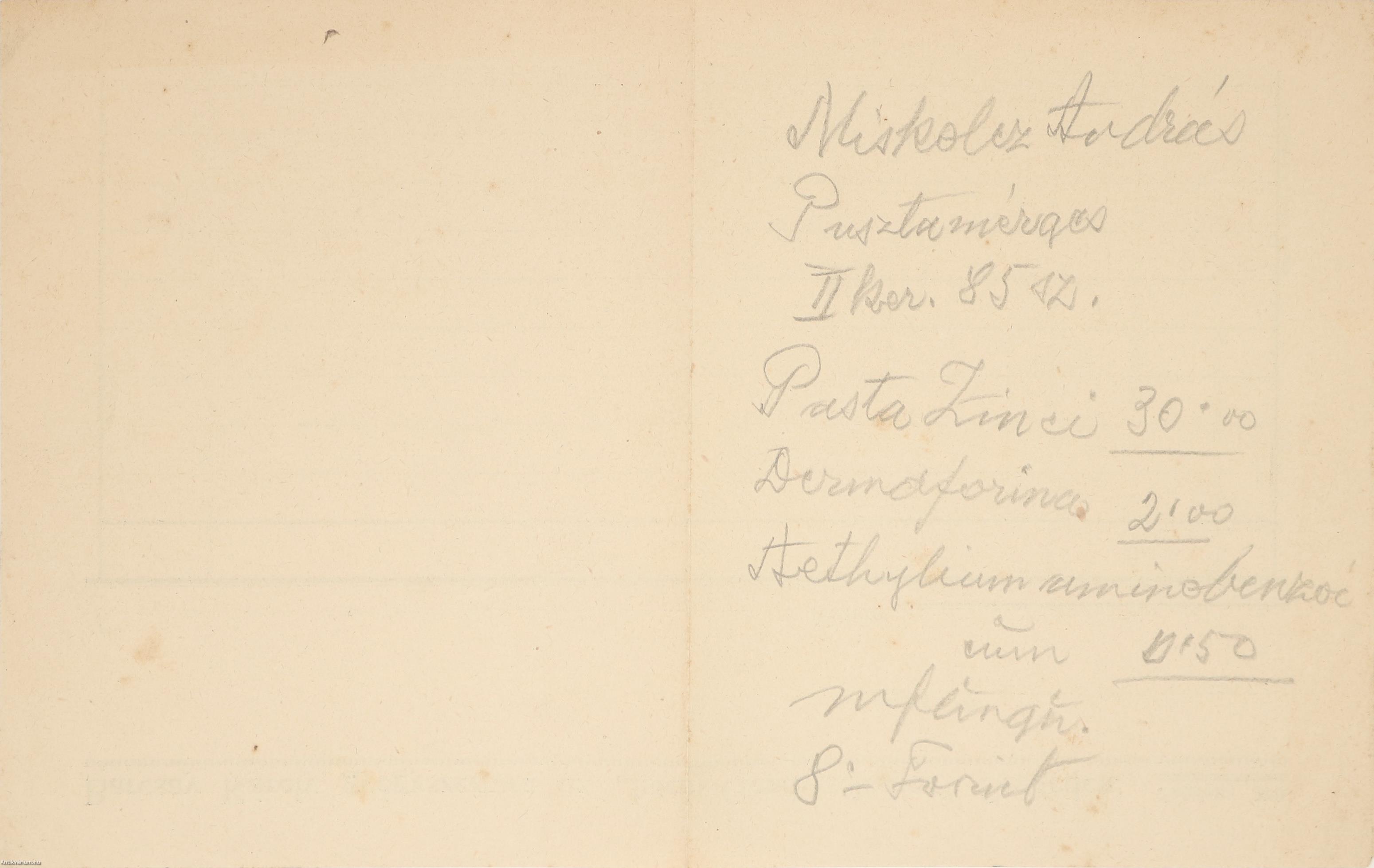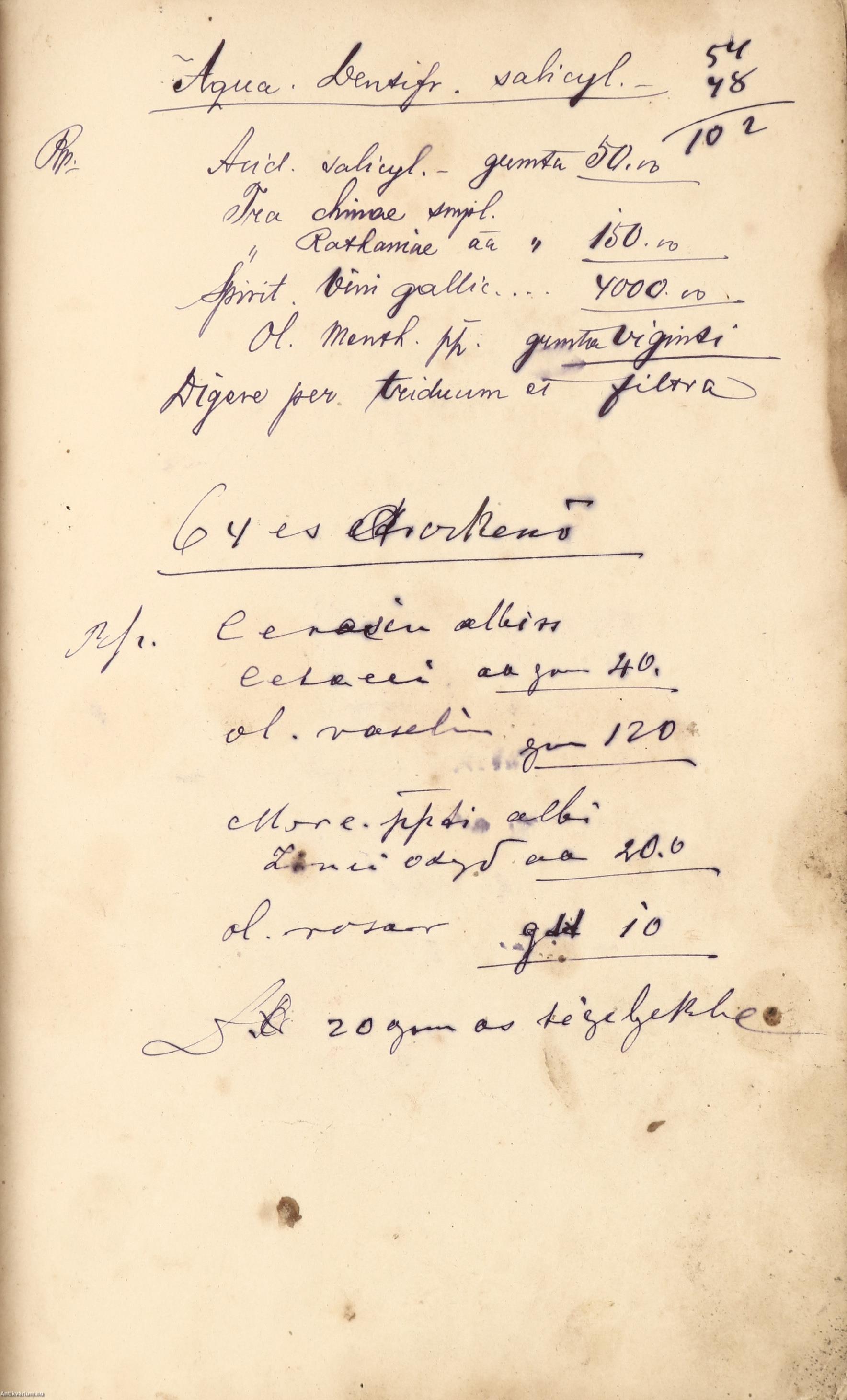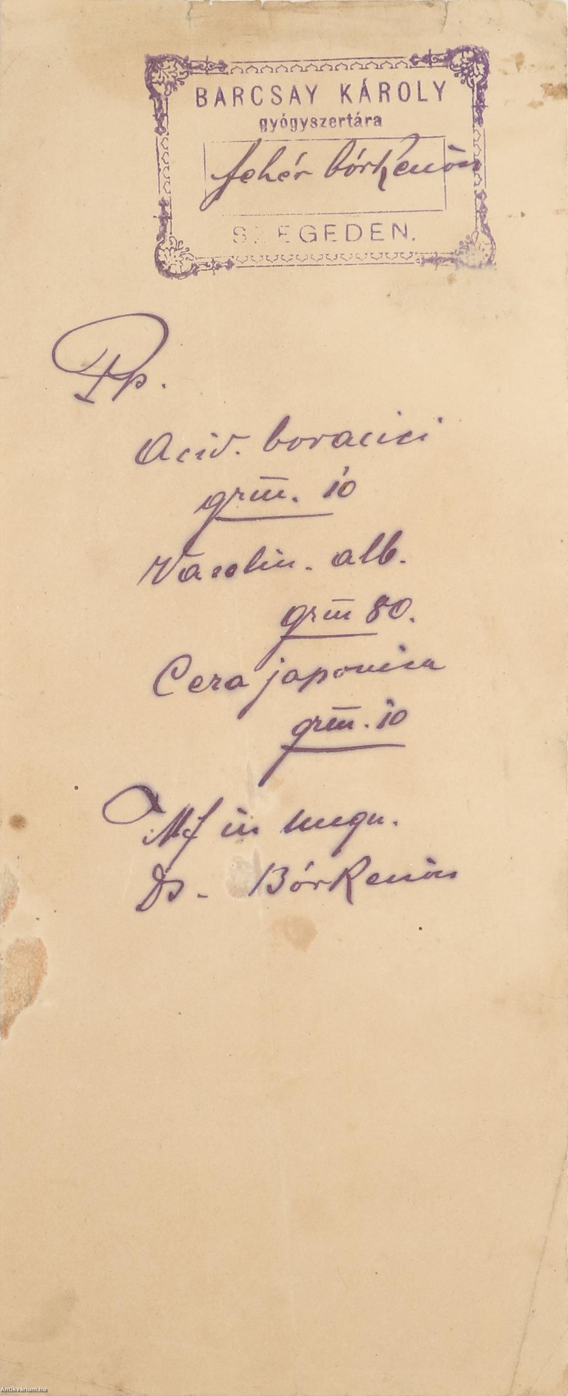 - 2. ceruzával írt receptúra Barcsay Károly "Isteni Gondviseléshez" címzett szegedi gyógyszertárának nyomtatott, kitöltetlen megrendelőlapjának hátoldalán.
