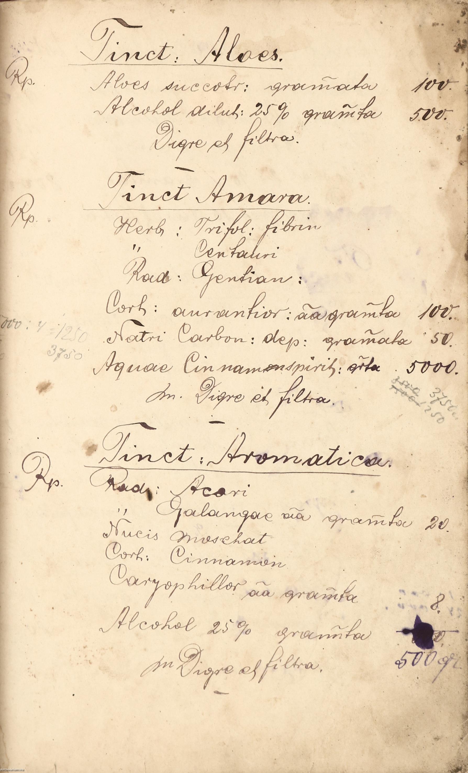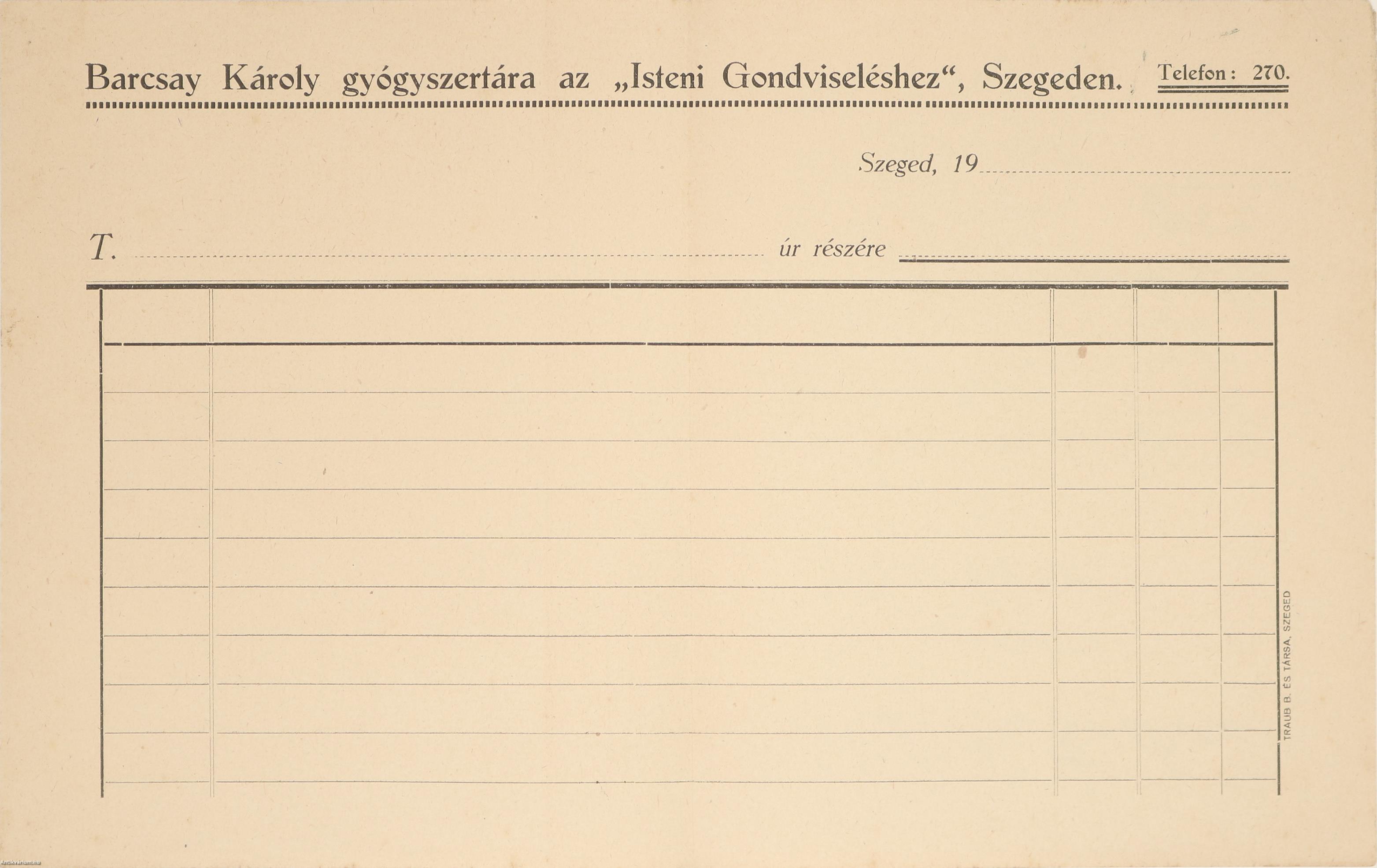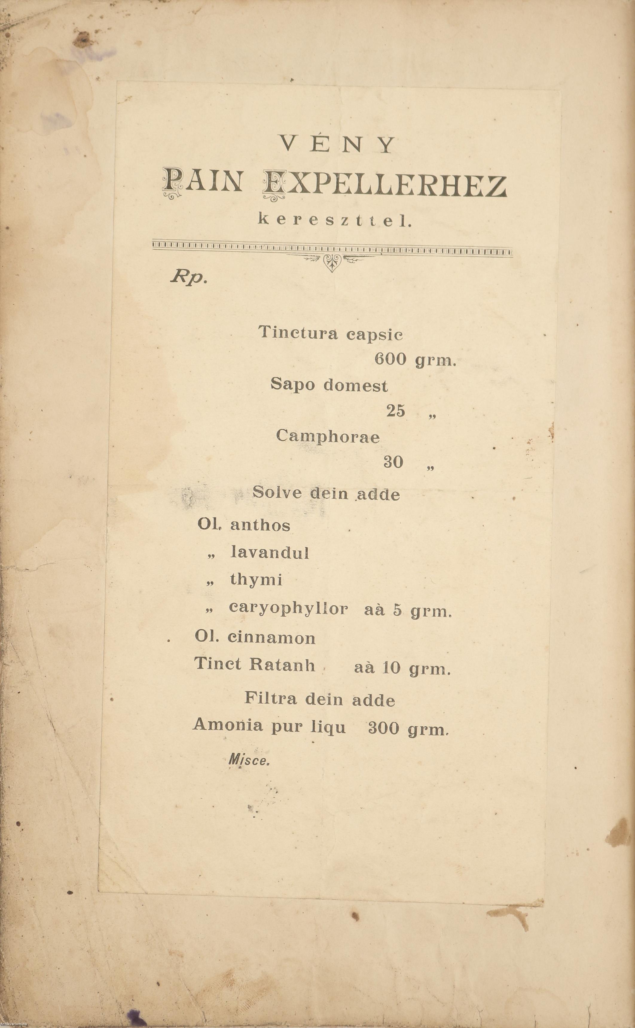 - 2. ceruzával írt receptúra Barcsay Károly "Isteni Gondviseléshez" címzett szegedi gyógyszertárának nyomtatott, kitöltetlen megrendelőlapjának hátoldalán.