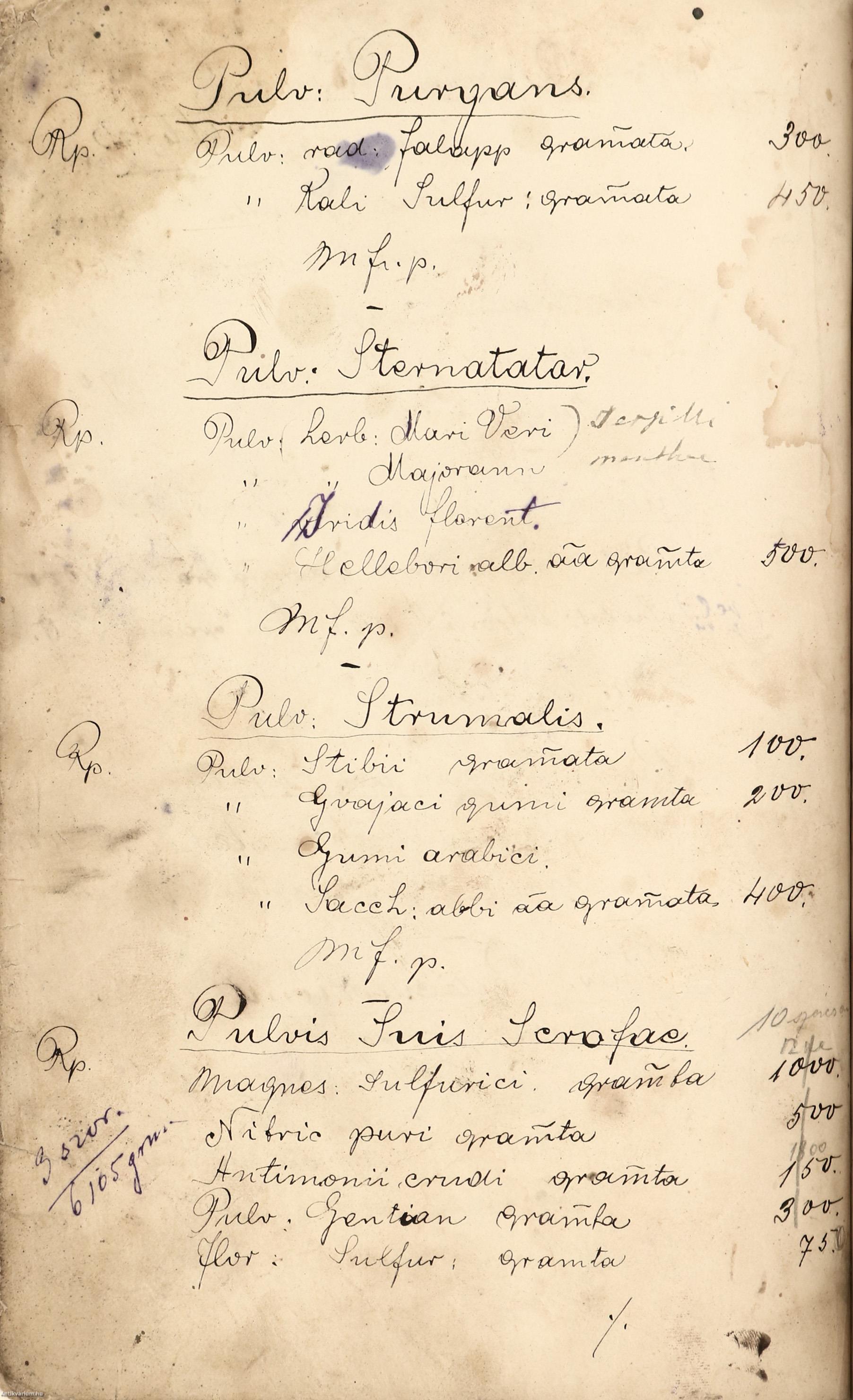 Gyógyszerészi hagyatékból származó, egyedi, kéziratos receptúragyűjtemény.