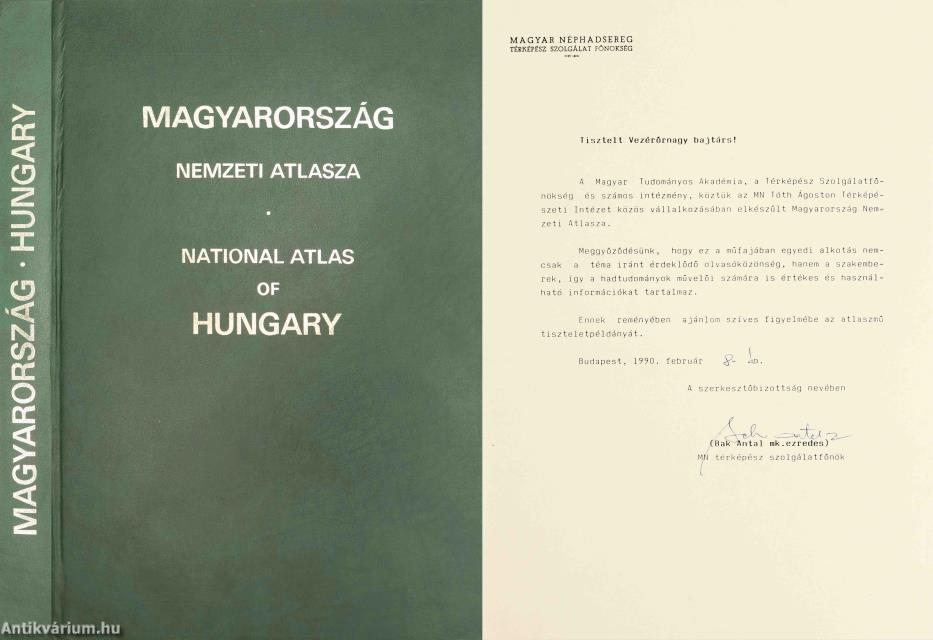 Pécsi Márton: Magyarország Nemzeti Atlasza (Melléklet: Bak Antal mk. ezredes által aláírt levéllel.)