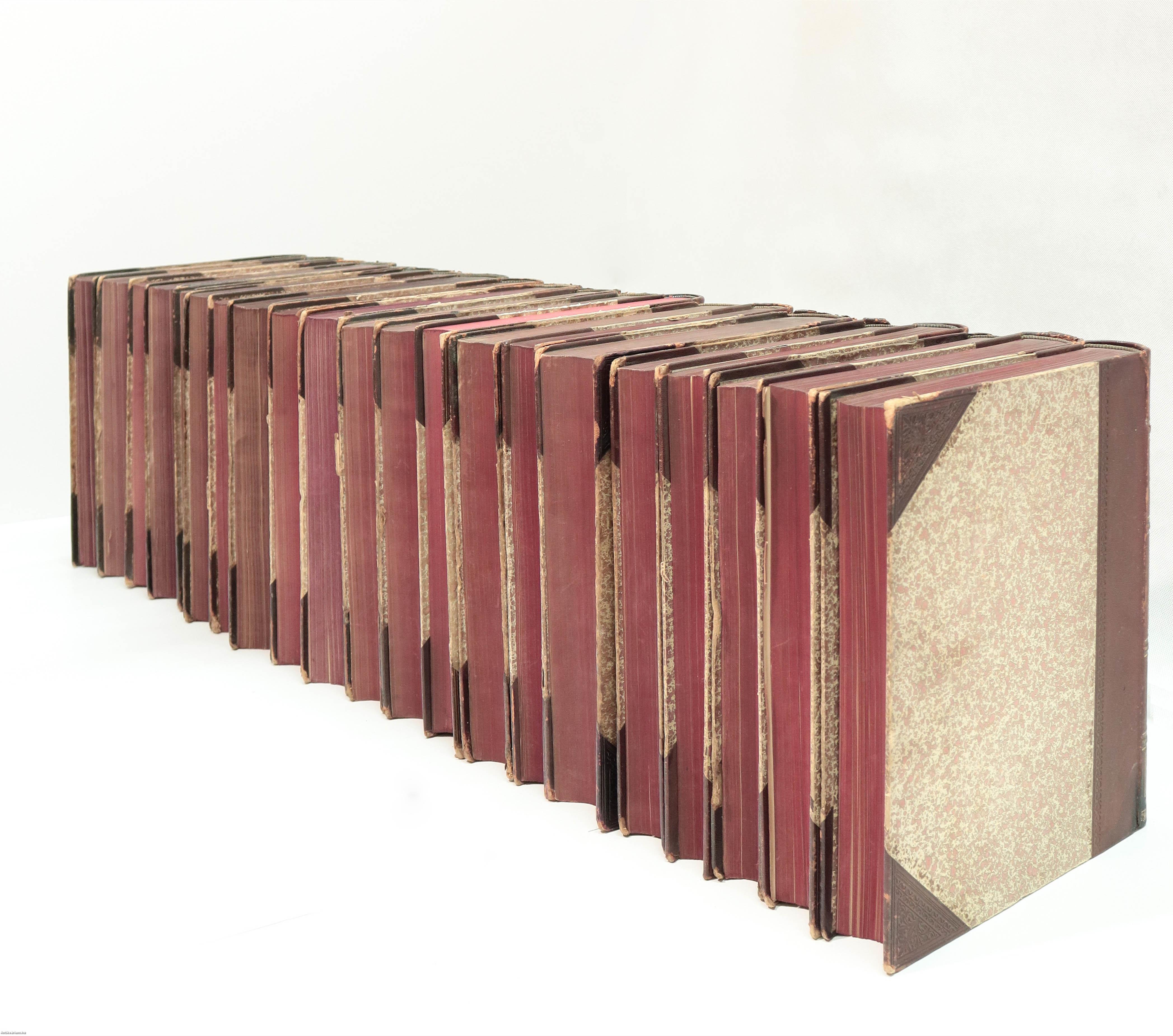 Kiadói dúsan aranyozott, félbőr sorozatkötésben lévő kötetek feliratozatlan, aranyozott díszítésű sarkalással és mintázással ellátott, márványpapíros borítással bevont címfedéllel és hátlappal, dúsan aranyozott, feliratozással ellátott kiadói bőr könyvgerinccel, színezett lapélekkel, hiánytalan állapotban.
