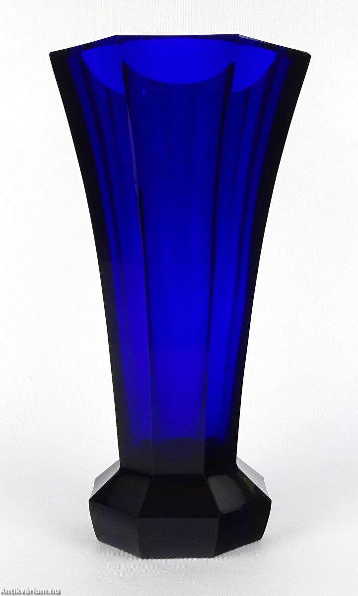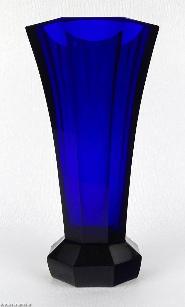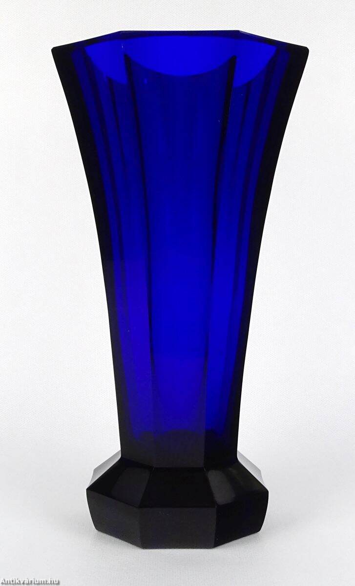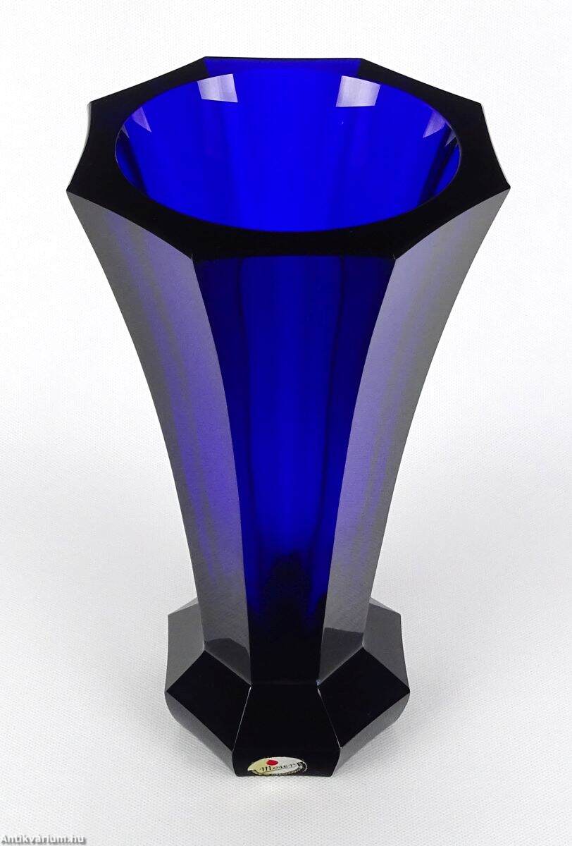 Hibátlan állapotú, art deco stílusú, mélykék, metszett, talapzatos üveg váza. Drágakövekkel vágott kobaltkristály üvegből készült hatoldalas - hatszögletű kivitelben, amelyet Moser karlsbadi üveggyárban készítettek 1920 körül. Vastag falú, mélyen színezett, kiváló állapotú. "Moser Czech Republic" matrica, a talp közelében. Az üveg alján Moser jelzéssel.