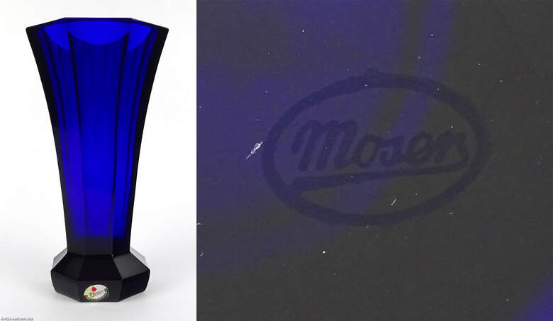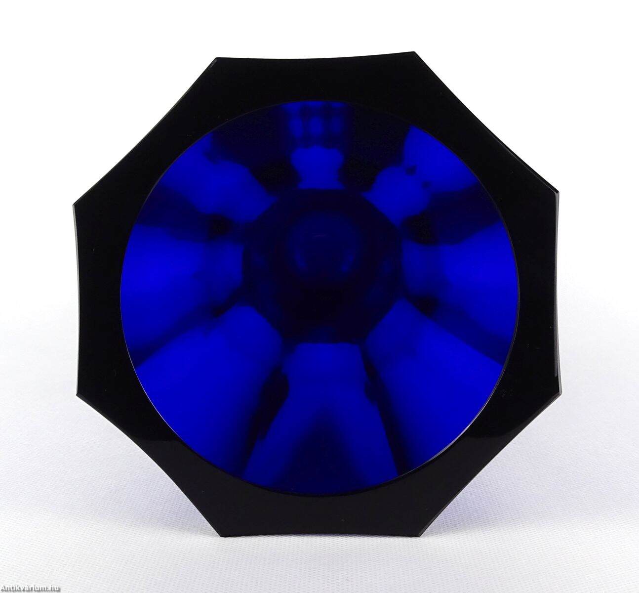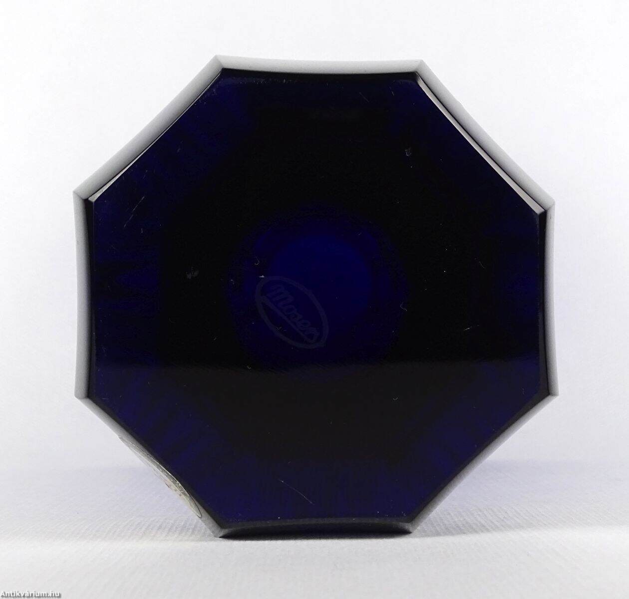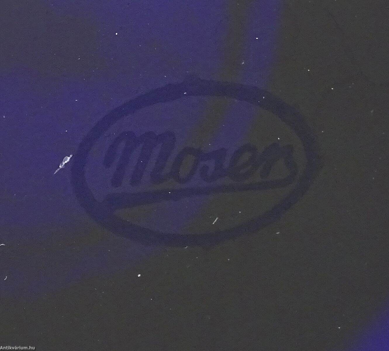 Hibátlan állapotú, art deco stílusú, mélykék, metszett, talapzatos üveg váza. Drágakövekkel vágott kobaltkristály üvegből készült hatoldalas - hatszögletű kivitelben, amelyet Moser karlsbadi üveggyárban készítettek 1920 körül. Vastag falú, mélyen színezett, kiváló állapotú. "Moser Czech Republic" matrica, a talp közelében. Az üveg alján Moser jelzéssel.