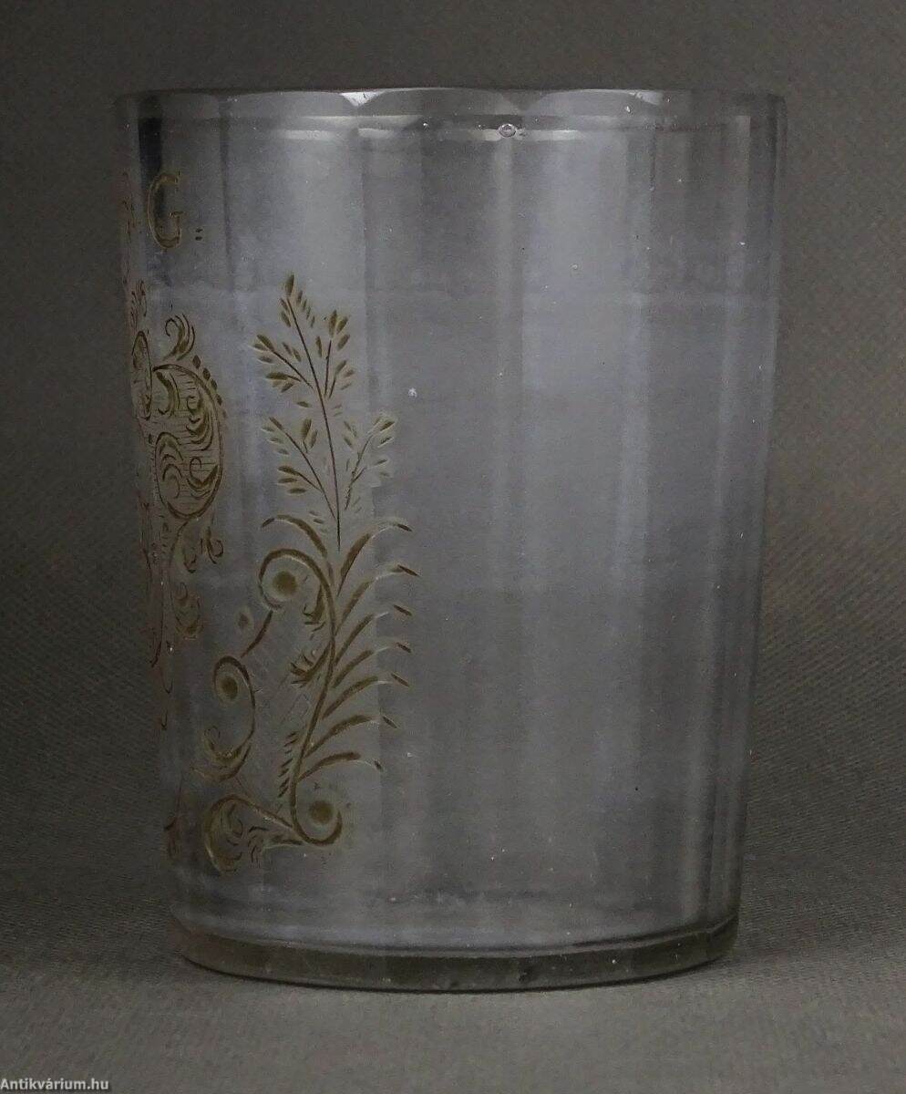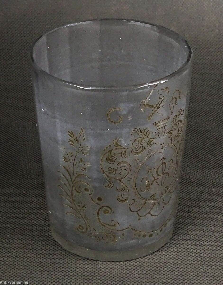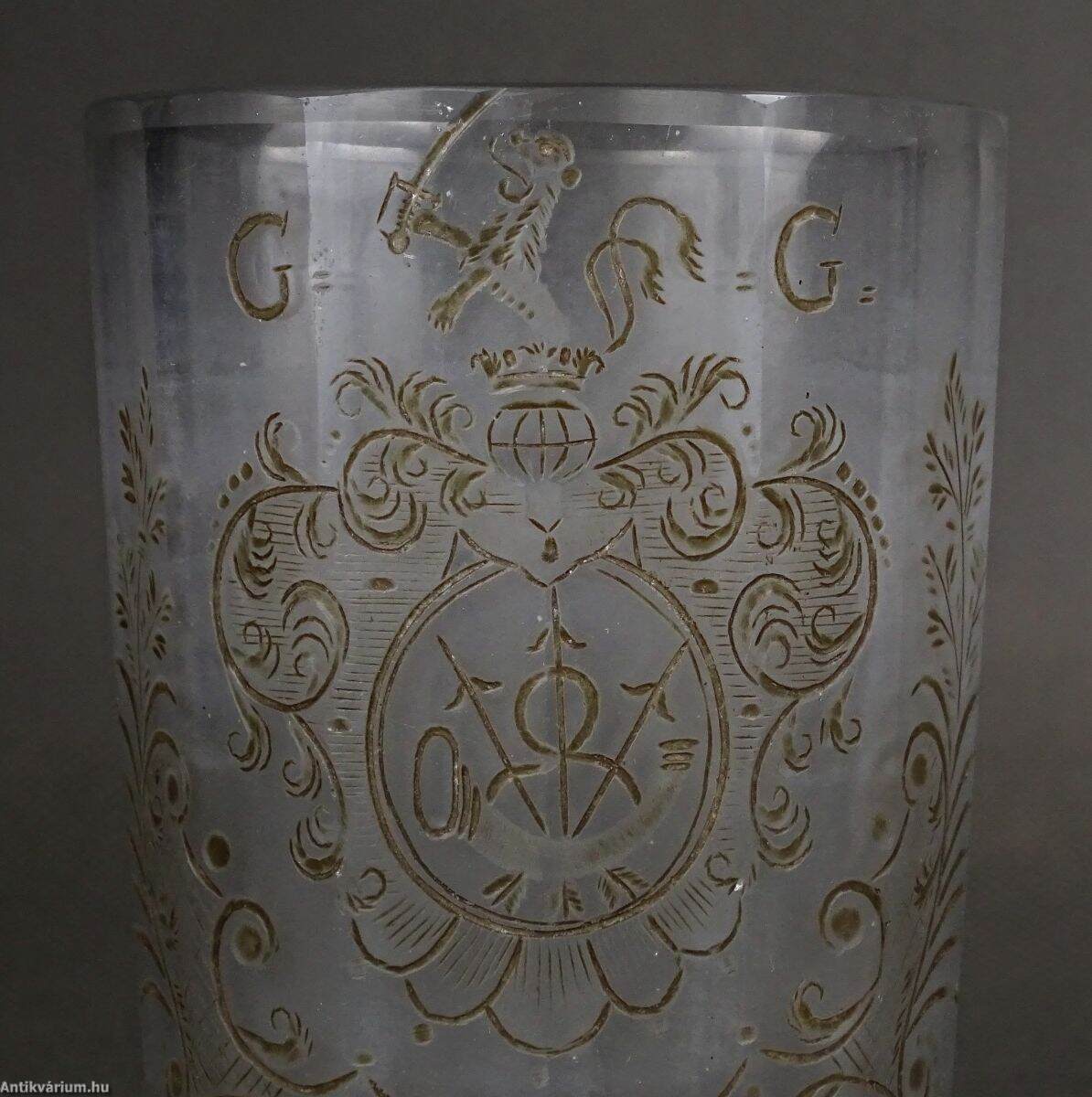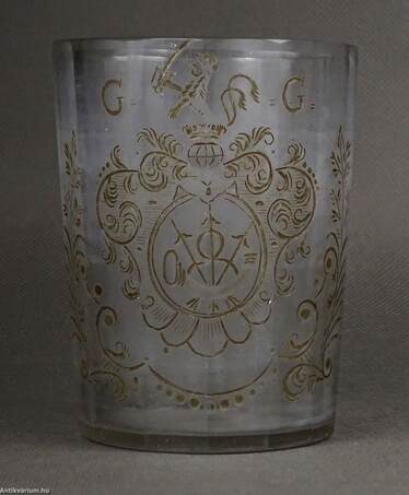 18. századi, lapra csiszolt és dúsan gravírozott, címeres, áttetsző pohár, G. G. monogrammal. A csiszolt mély barázdákat sötét tónussal színezték. Talpán használatból eredő mikro lepattanások.