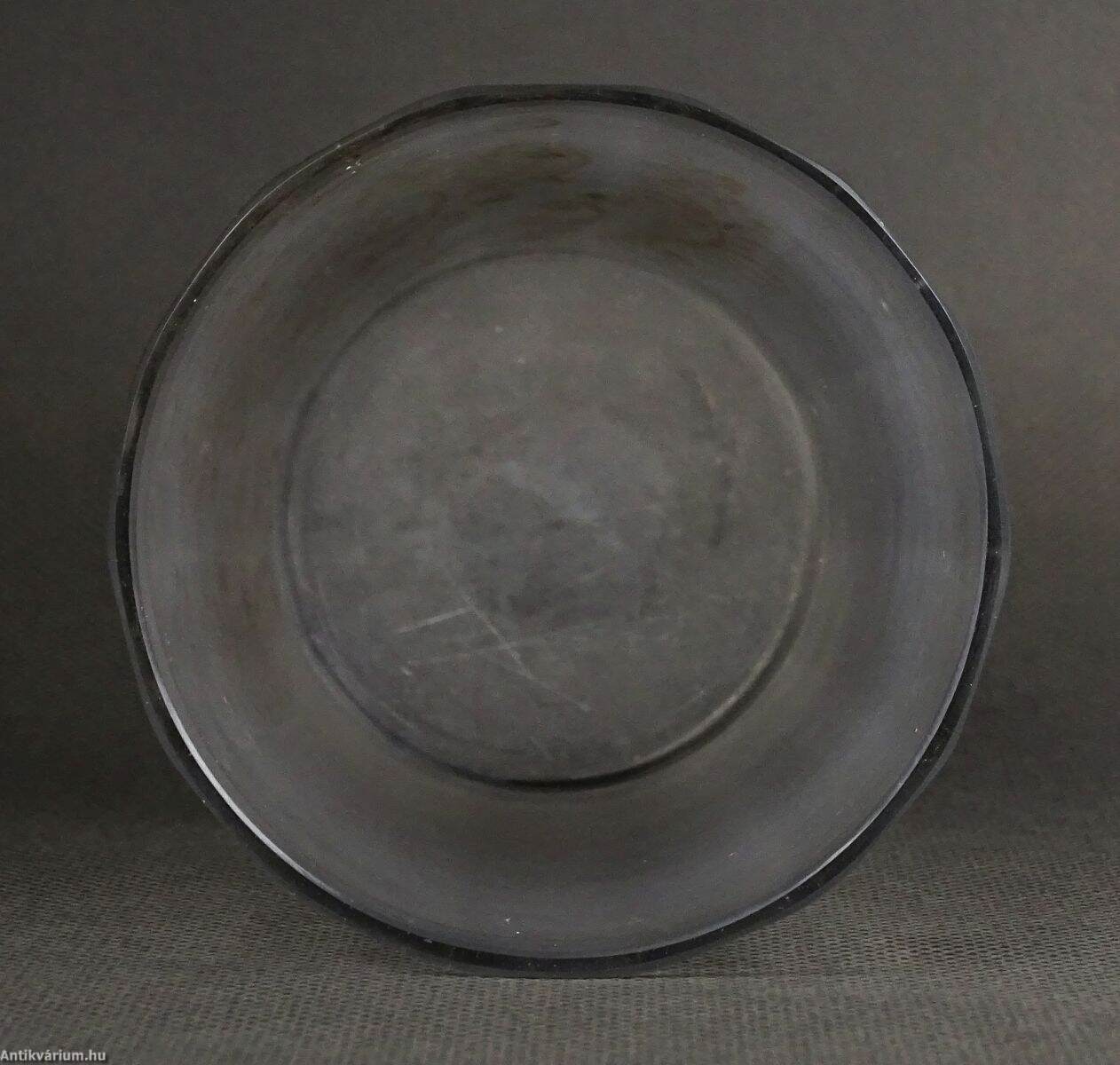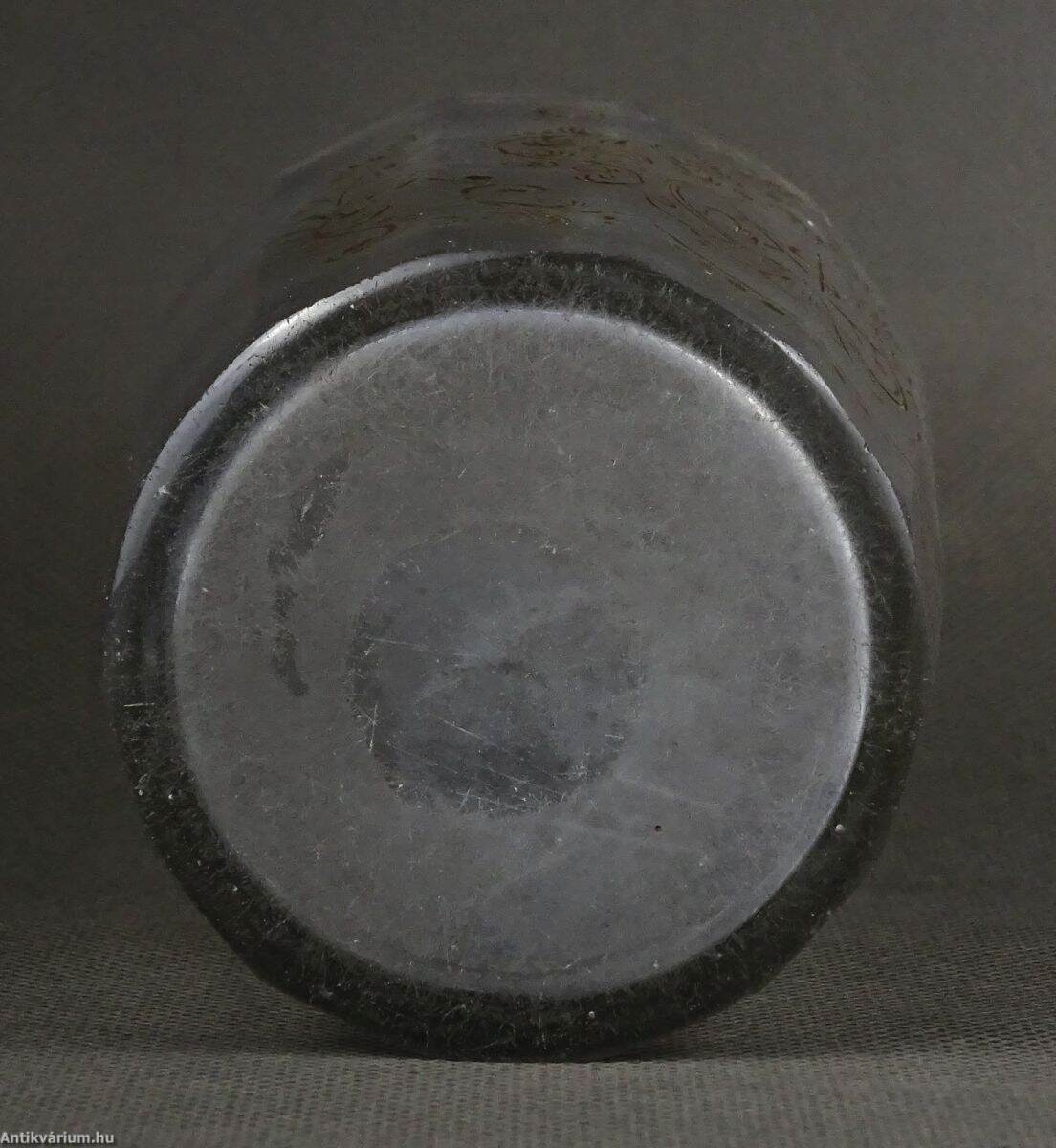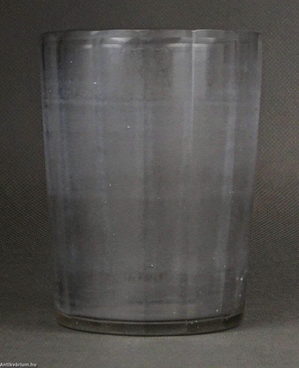 18. századi, lapra csiszolt és dúsan gravírozott, címeres, áttetsző pohár, G. G. monogrammal. A csiszolt mély barázdákat sötét tónussal színezték. Talpán használatból eredő mikro lepattanások.