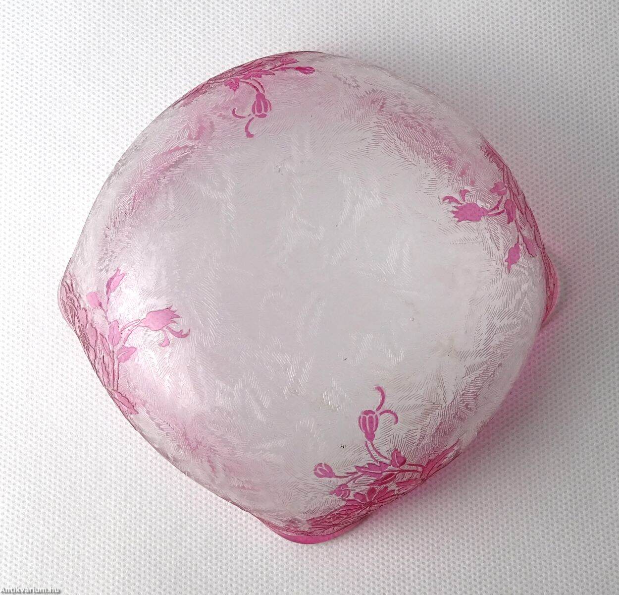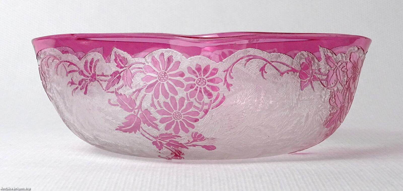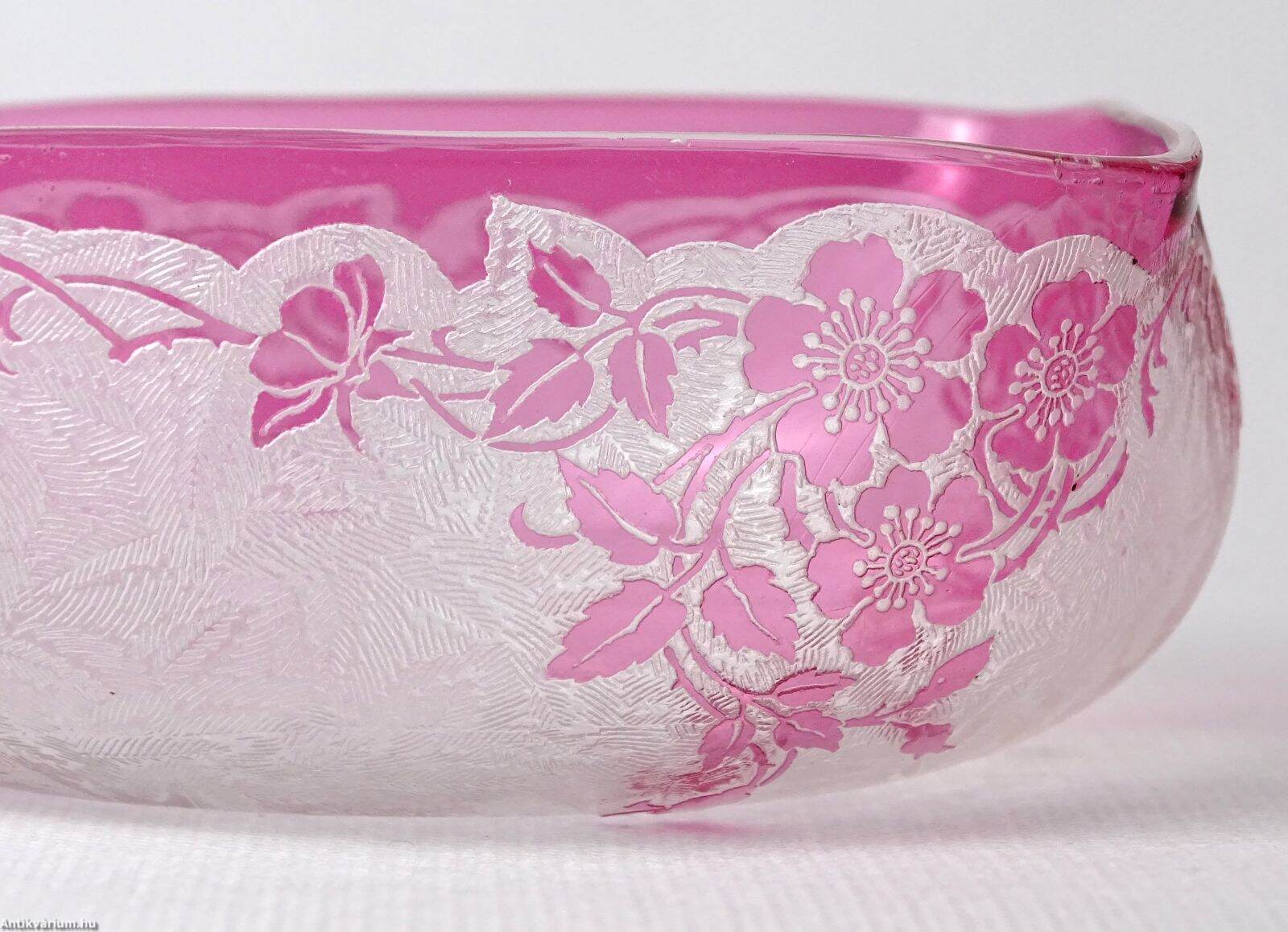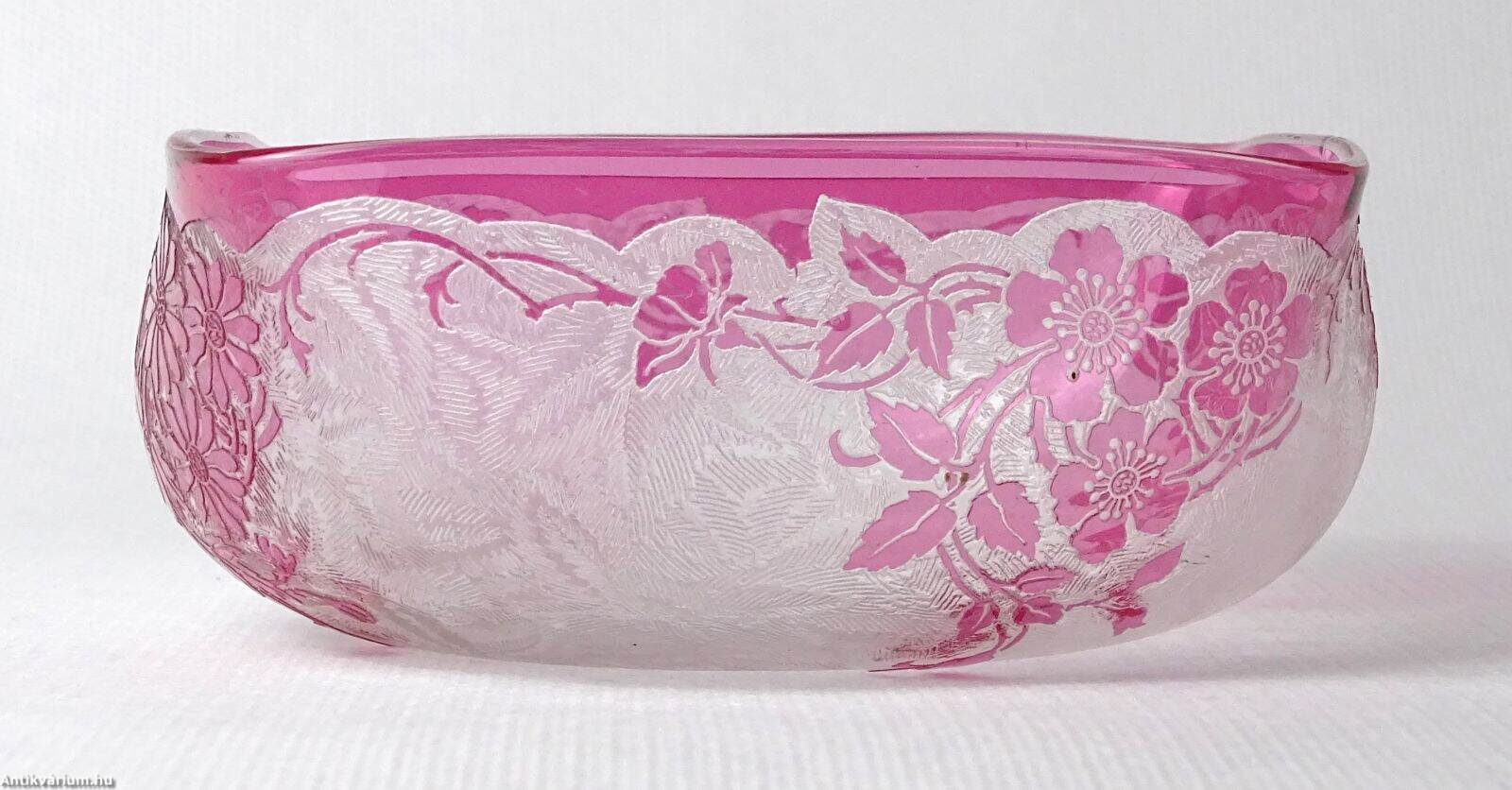 Hibátlan állapotú, a francia Baccarat műhelyből származó szecessziós ékszertartó tál a 20. század elejéről. Kétrétegű üveg átlátszó és pink színben, kézzel fújt és formázott, savval visszamaratott négy oldalán virágornamentikával.