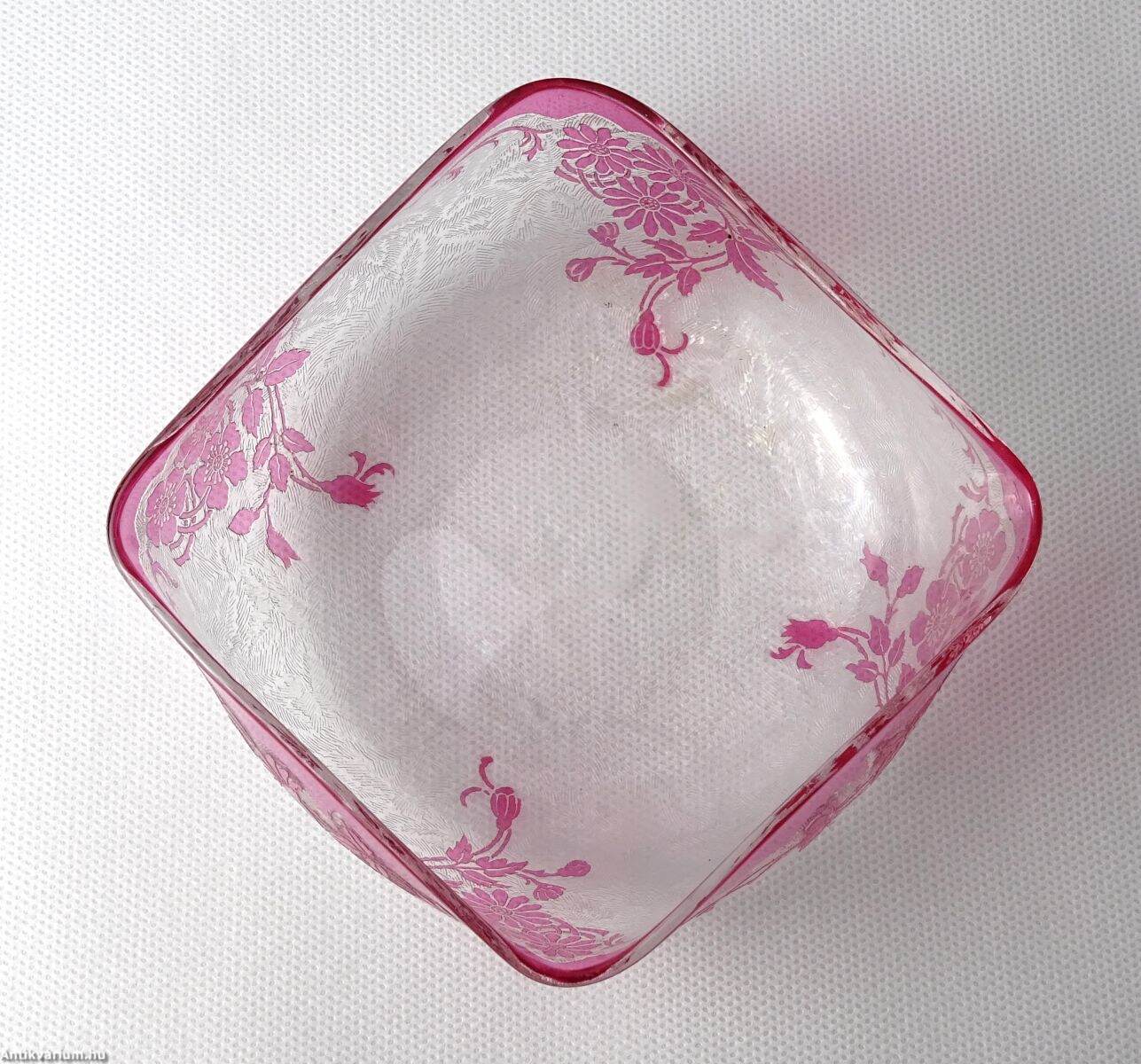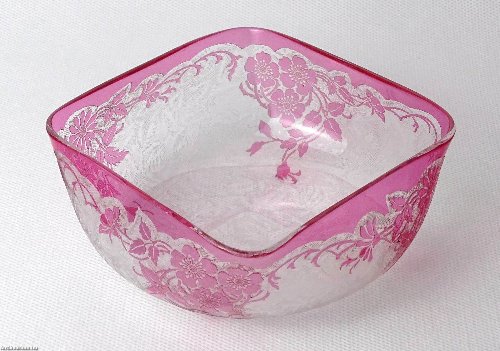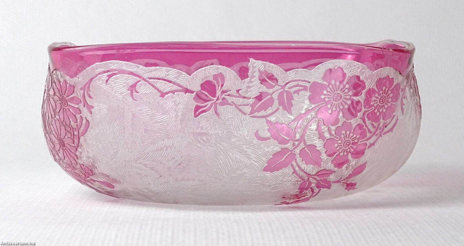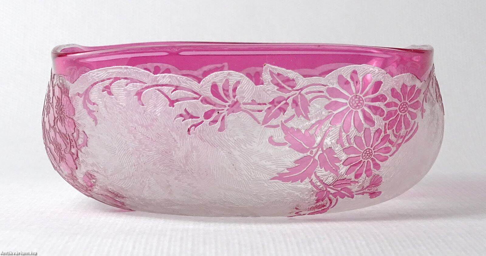 Hibátlan állapotú, a francia Baccarat műhelyből származó szecessziós ékszertartó tál a 20. század elejéről. Kétrétegű üveg átlátszó és pink színben, kézzel fújt és formázott, savval visszamaratott négy oldalán virágornamentikával.