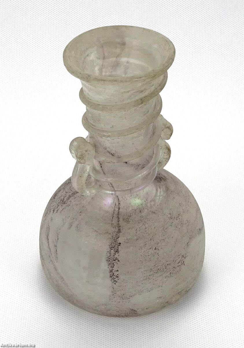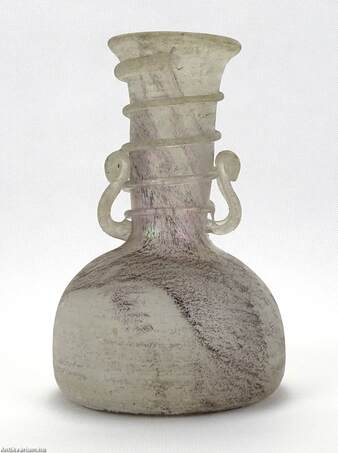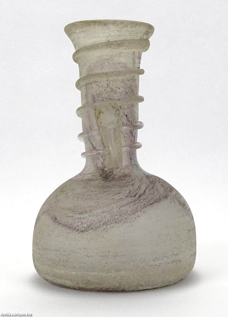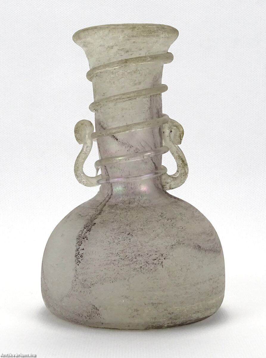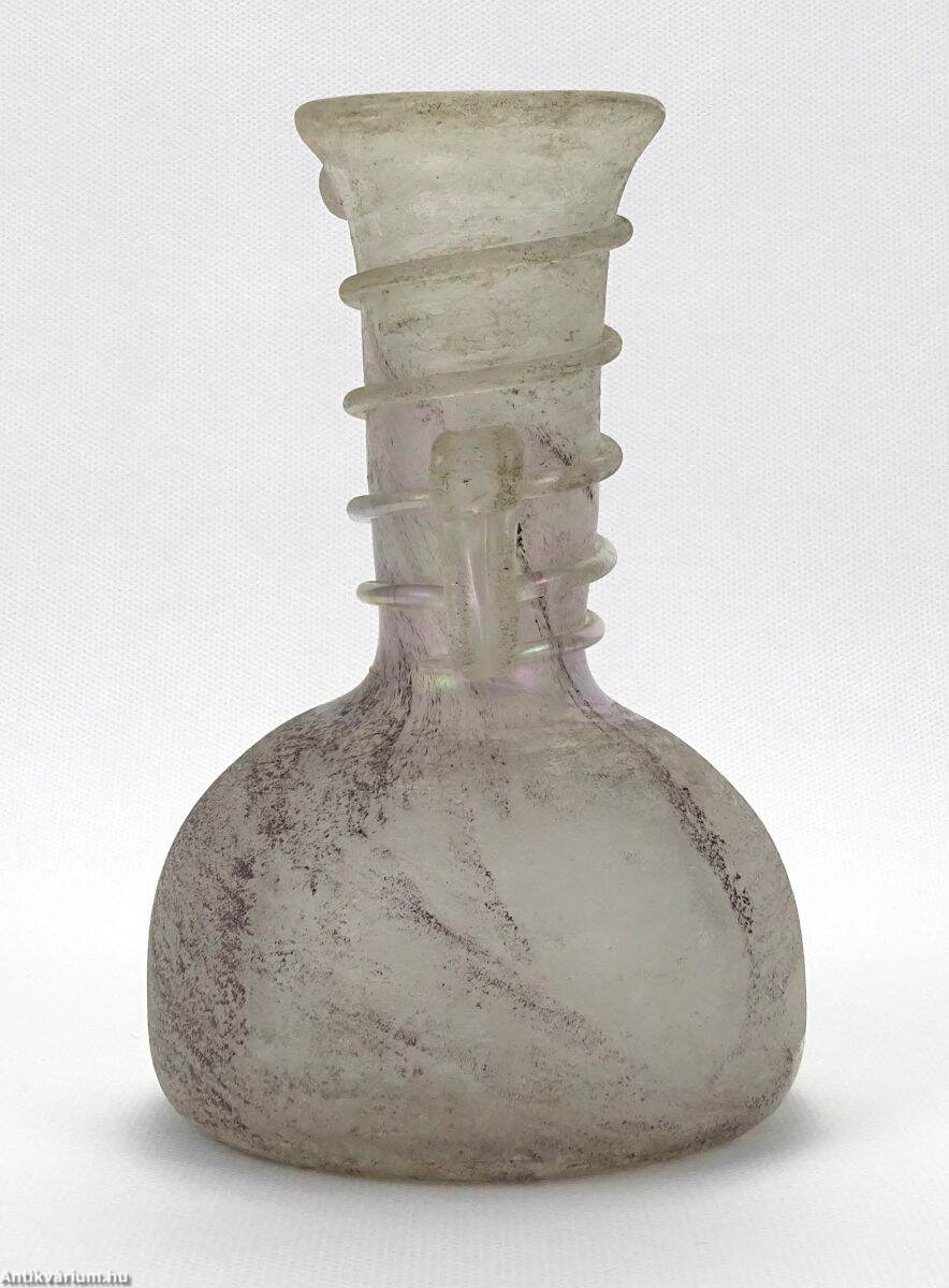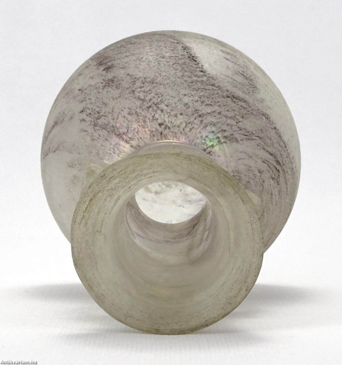 Hibátlan állapotú, a régi római üvegek hangulatát idéző, a velencei üvegmanufaktúrában készült kézzel fújt, matt, maratott Scavo (korróziós technika) üveg váza. A scavo-bevonat a régészeti maradványok feltárására hivatott hasonlítani: a durva tapintású üvegfelület a forró üvegen szórt sók és oxidálószerek felvitelének eredménye. A váza kiváló, sérülésmentes állapotú. Készítésének ideje a 20. század első fele. Jelzés nélküli.