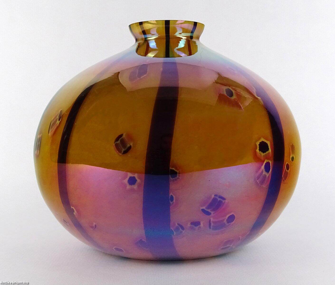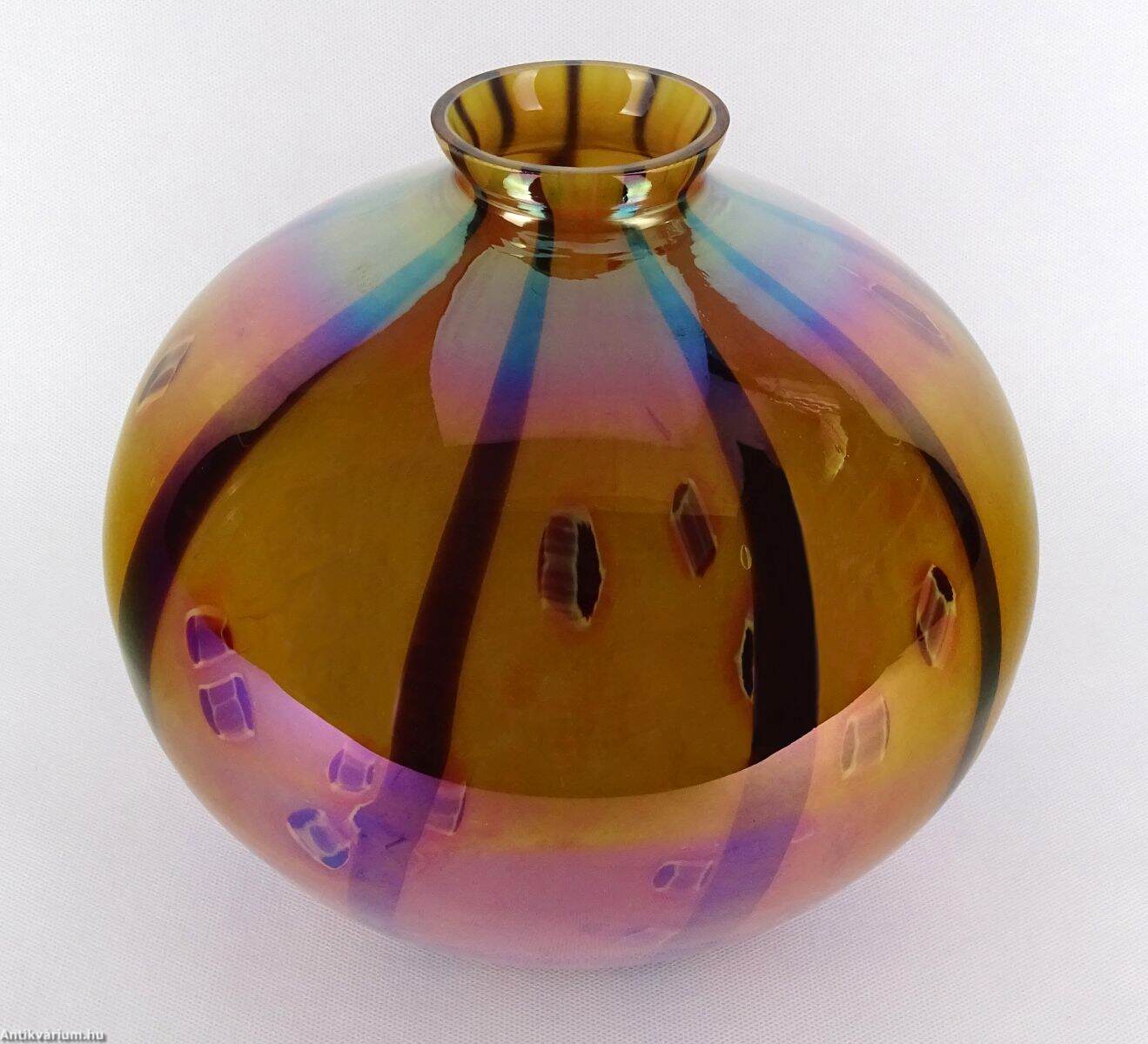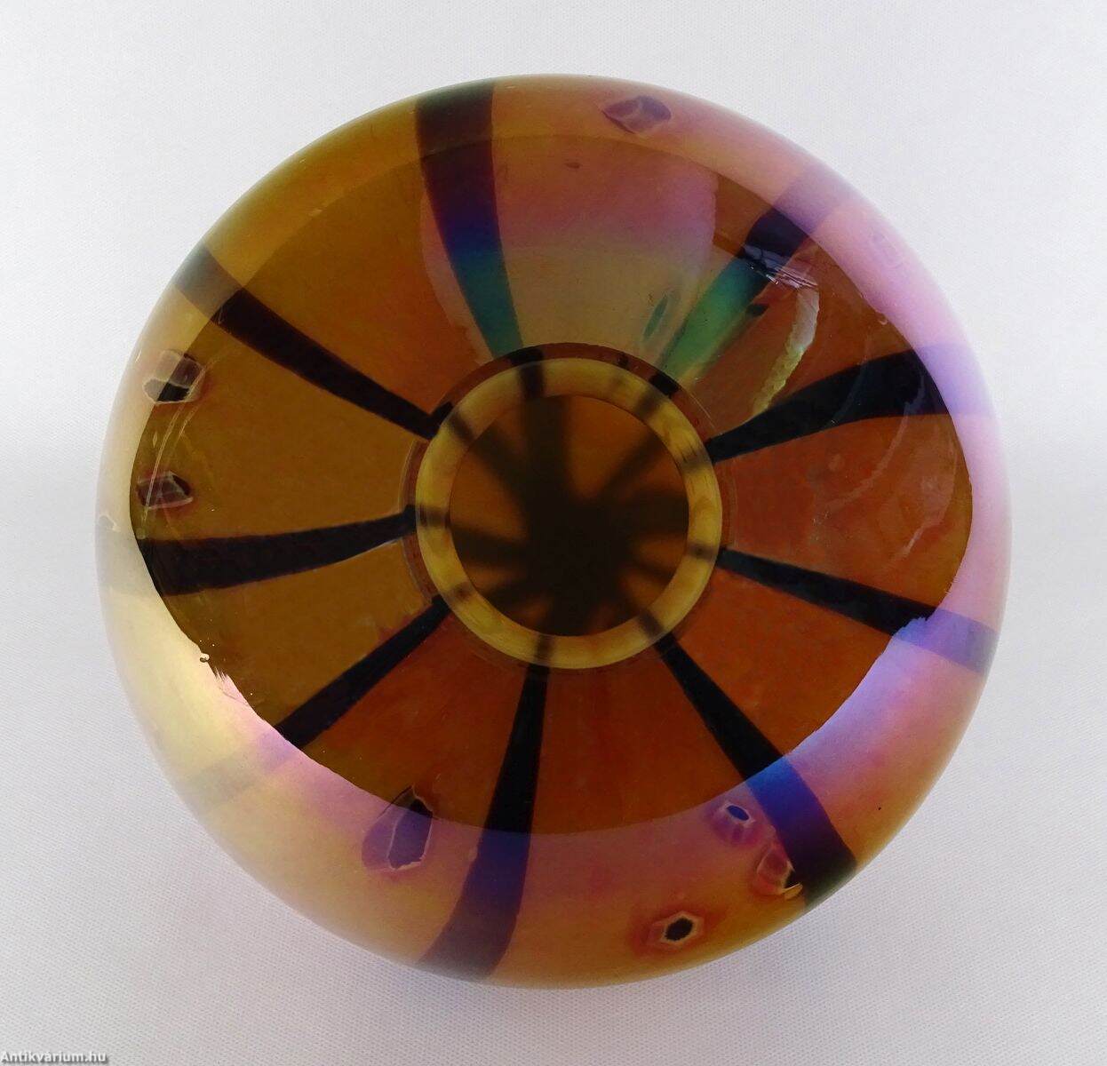 Hibátlan állapotú Kralik millefiori mestermunka. Nagyméretű, gömb formájú, dekoratív asztalközépnek is kiváló dísztárgy. Többréteges szerkezetű, a külső átlátszó réteg alatt elszórva absztrakt virágmotívumokkal, harmonikus arányokat követő csíkozással,. Kívülről nehézfém oxidos lüszteres borítás teszi még káprázatosabbá ezt a gyönyörű dísztárgyat. 20. század első fele.