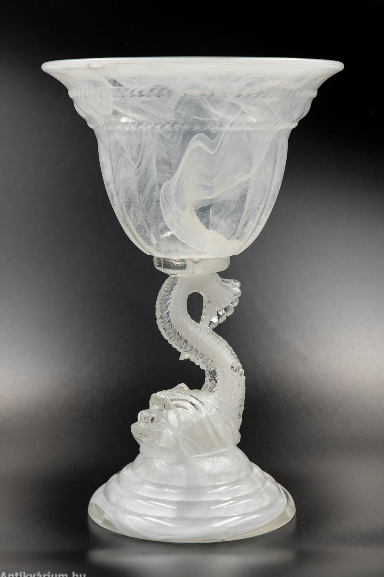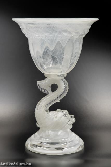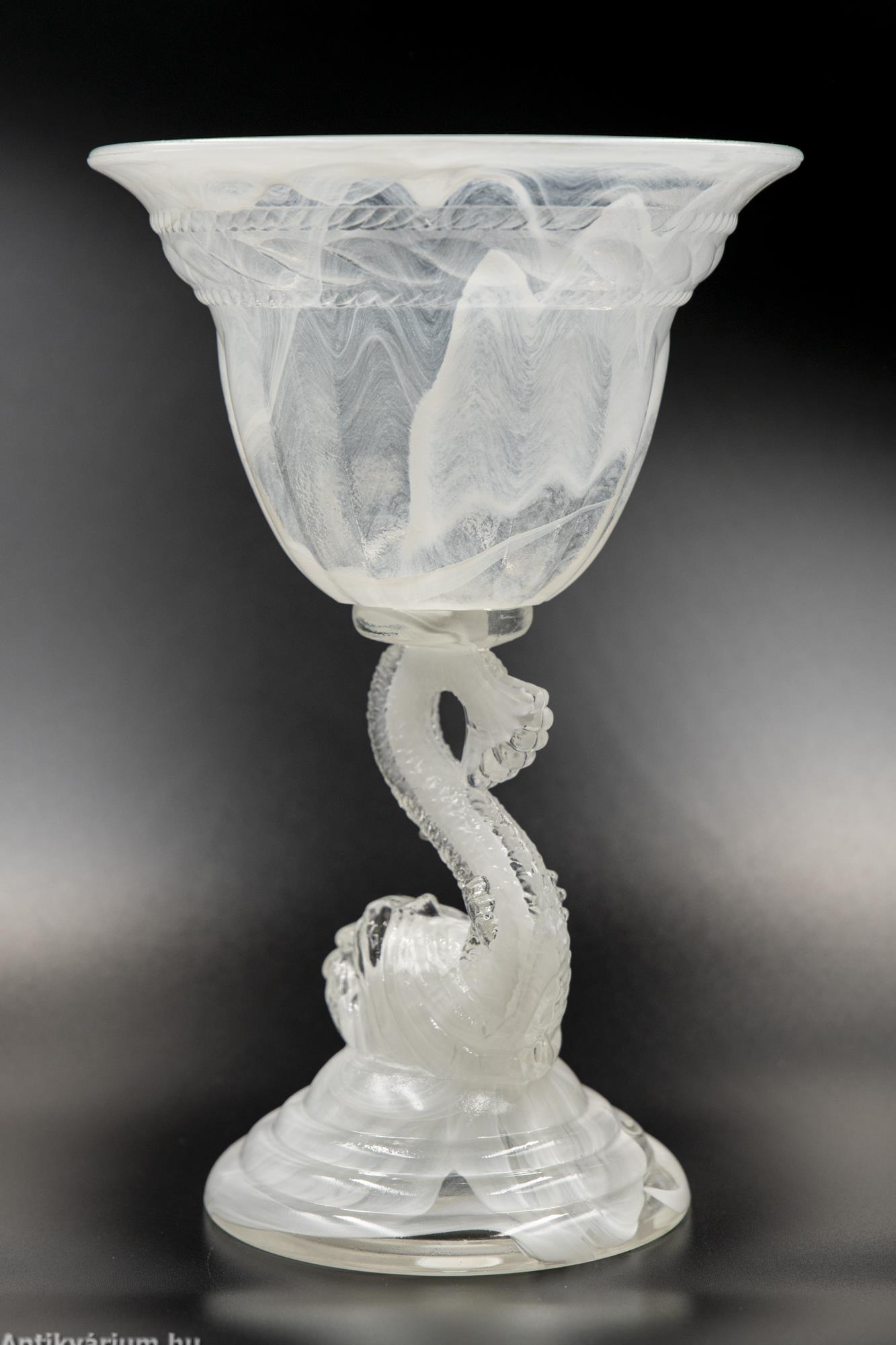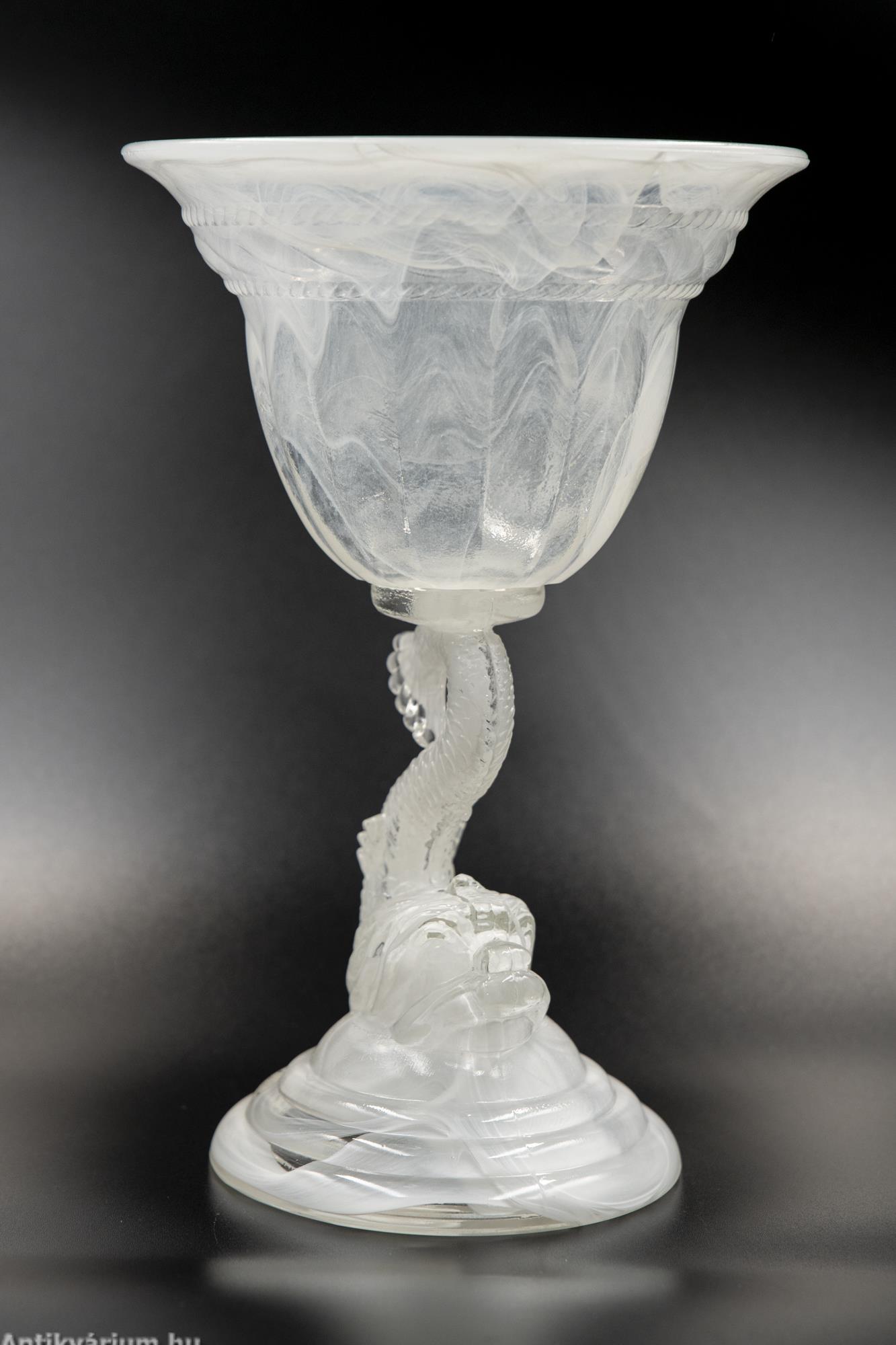 Hibátlan állapotú fehér felhőüvegből készült impozáns üveg kehely. A felhőüveg-technika a préselt művészüveg egyik formája, Thomas Davidson találta fel 1923-ban. A felhőüveg úgy jön létre, hogy sötétebb színű üvegcsíkokat vagy nyomvonalakat visznek fel egy halványabb alapüvegre, amelyet azután egy formába préselnek, hogy gyönyörű, véletlenszerű kész mintát hozzanak létre, ezért minden egyes darab egyedi. Ezeket a darabokat az 1930-as évek angol art deco időszakára datáljuk. A cég a második világháborúig gyártotta ezt a típusú minőségi üveget. Ennek az üvegkehelynek a különlegessége a felhőszerű, gyönyörűen kirajzolódó textúra, valamint annak fehéres árnyalatai, amelyeket nagyon kevés darabon láthatunk. A kehelyforma alatt a finom kidolgozású száron az üvegmodellezés technikájával készített hal forma jelenik meg. Egyedi darabja lehet a Davidson gyűjteményeknek.
