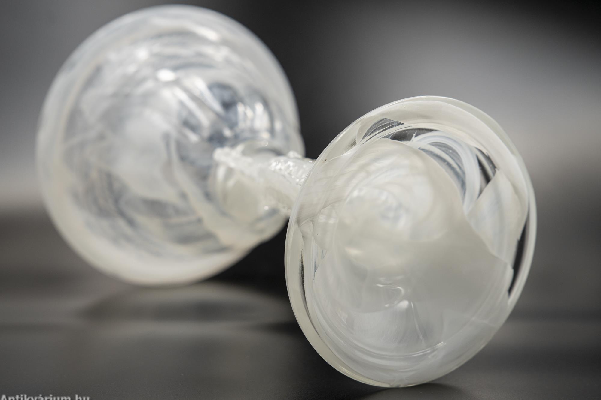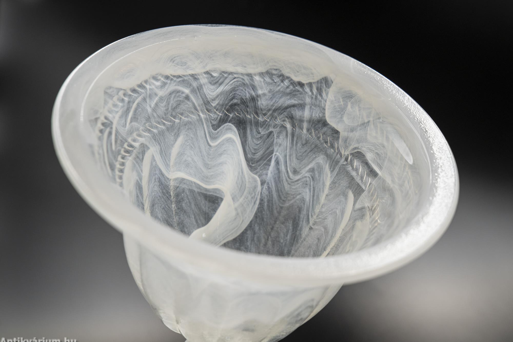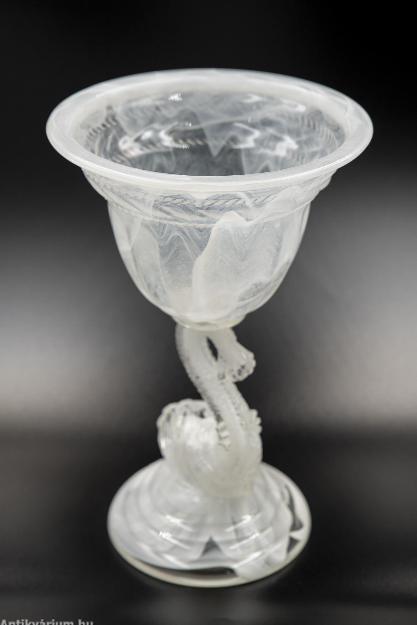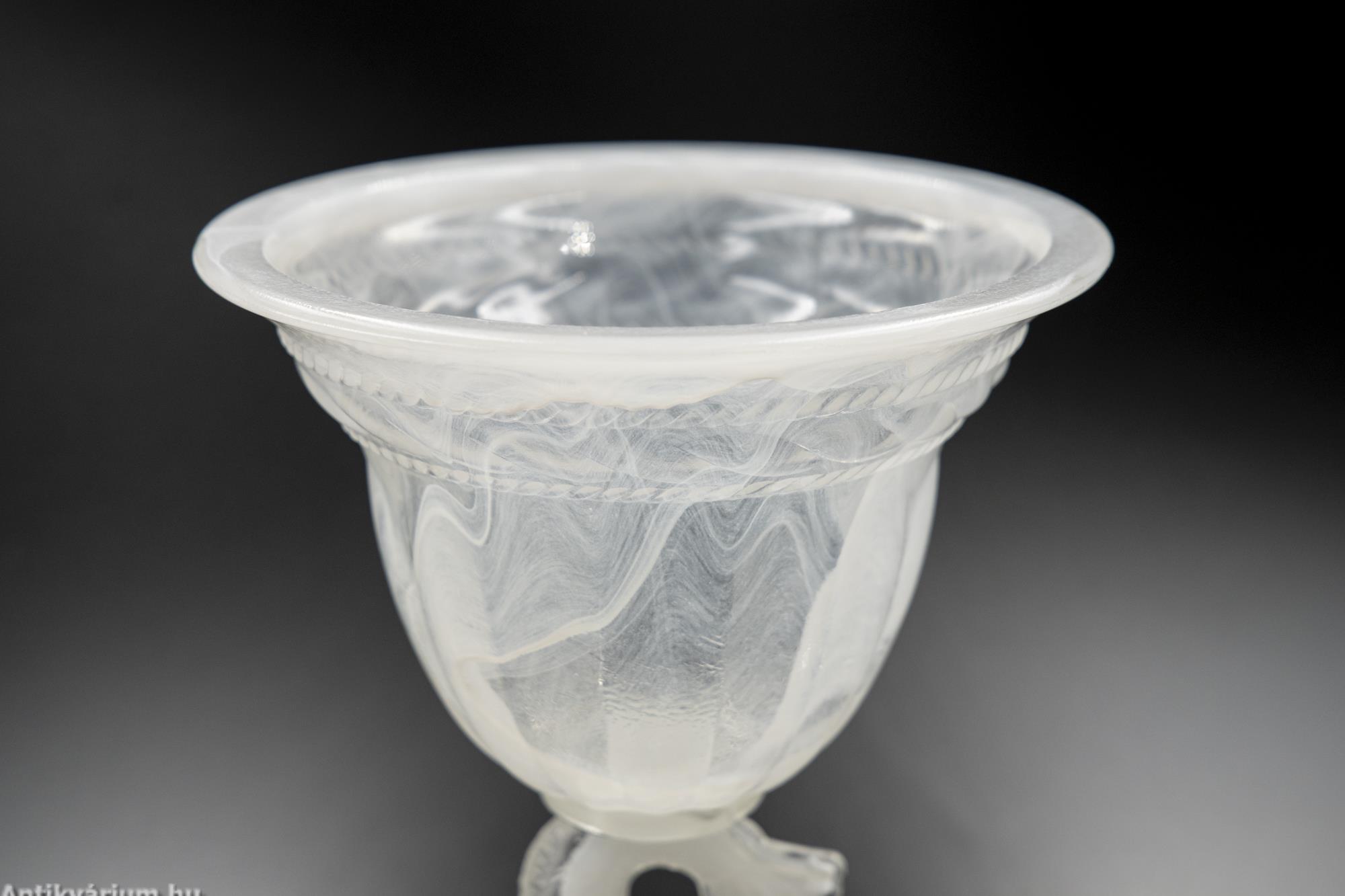 Hibátlan állapotú fehér felhőüvegből készült impozáns üveg kehely. A felhőüveg-technika a préselt művészüveg egyik formája, Thomas Davidson találta fel 1923-ban. A felhőüveg úgy jön létre, hogy sötétebb színű üvegcsíkokat vagy nyomvonalakat visznek fel egy halványabb alapüvegre, amelyet azután egy formába préselnek, hogy gyönyörű, véletlenszerű kész mintát hozzanak létre, ezért minden egyes darab egyedi. Ezeket a darabokat az 1930-as évek angol art deco időszakára datáljuk. A cég a második világháborúig gyártotta ezt a típusú minőségi üveget. Ennek az üvegkehelynek a különlegessége a felhőszerű, gyönyörűen kirajzolódó textúra, valamint annak fehéres árnyalatai, amelyeket nagyon kevés darabon láthatunk. A kehelyforma alatt a finom kidolgozású száron az üvegmodellezés technikájával készített hal forma jelenik meg. Egyedi darabja lehet a Davidson gyűjteményeknek.