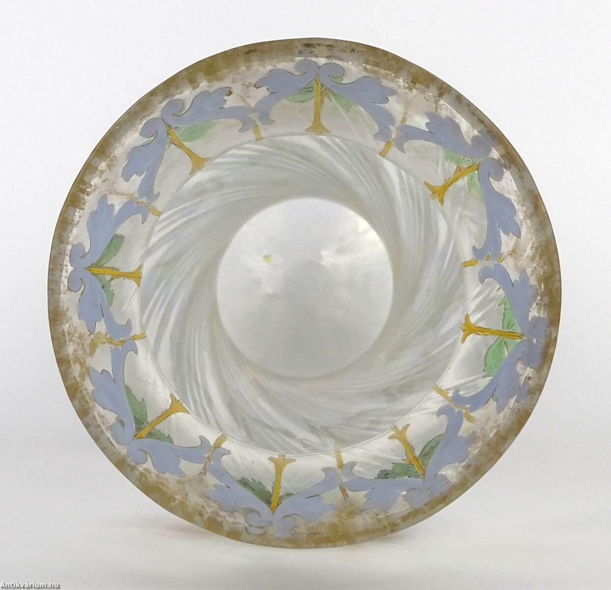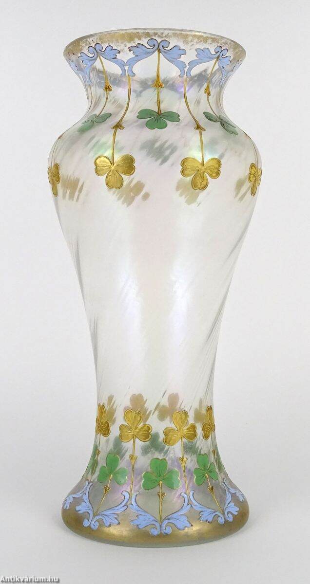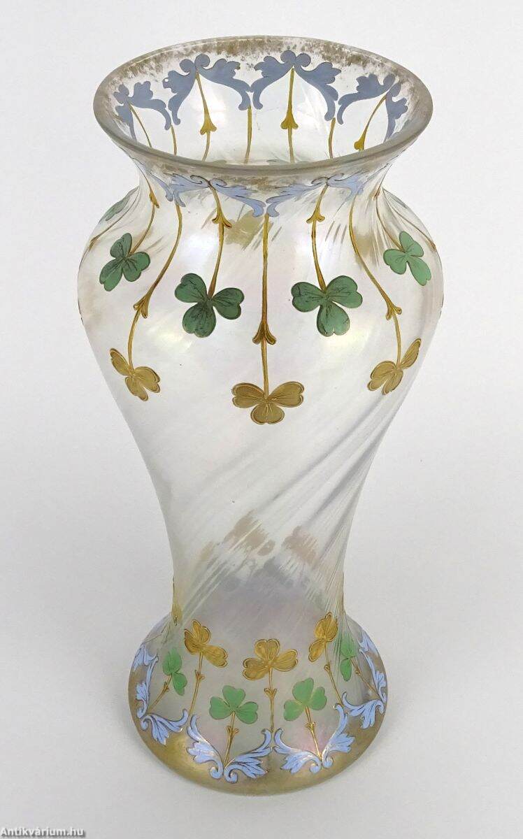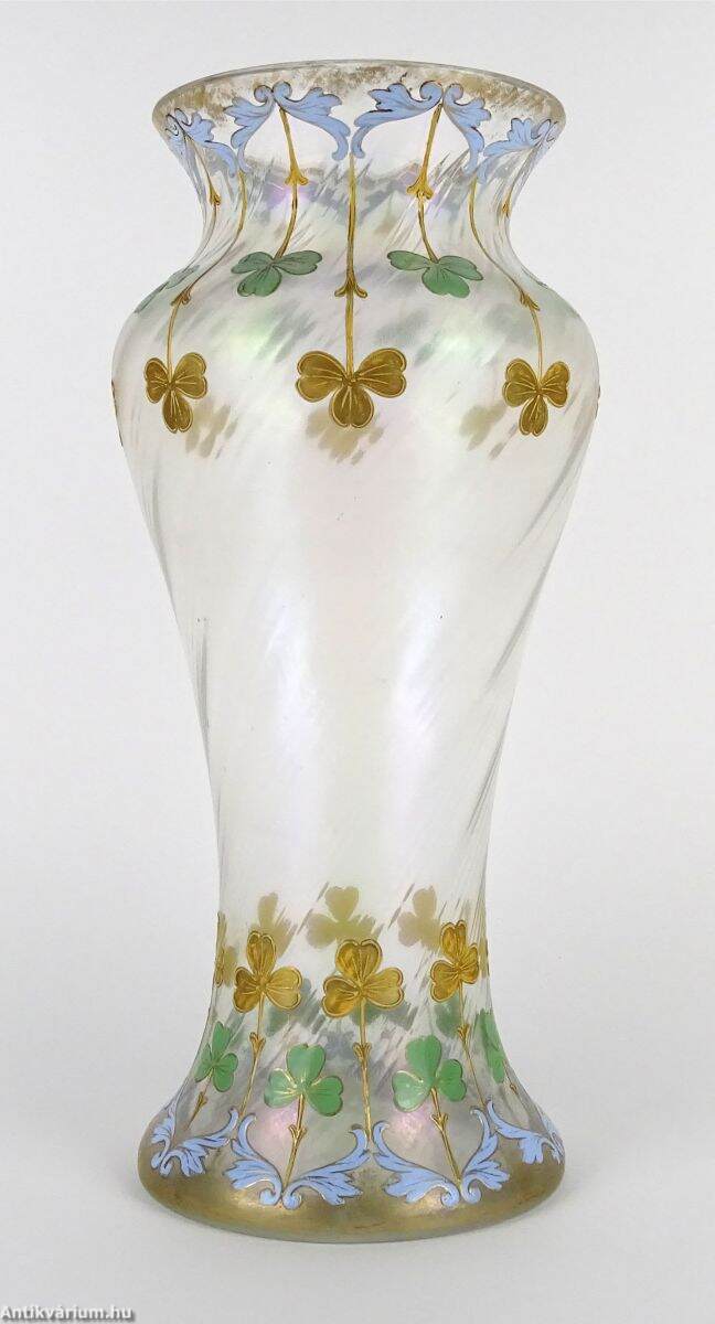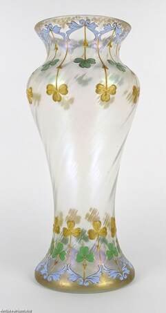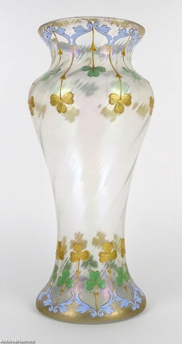 Hibátlan állapotú, fújt és kézzel formázott szecessziós, nagyméretű francia üveg váza, amely a 20. század elején készült. Felületét lüszteres, színjátszó hatás teszi érdekessé, amelyet többszínű virágmotívumokkal díszítettek egy lágyan csavart üvegtesten. A világos, pasztell színek alkalmazása kivételes finomságot kölcsönöz. Rendkívül dekoratív, a kor stílusát és hangulatát tükröző, impozáns méretű reprezentatív szecessziós váza.