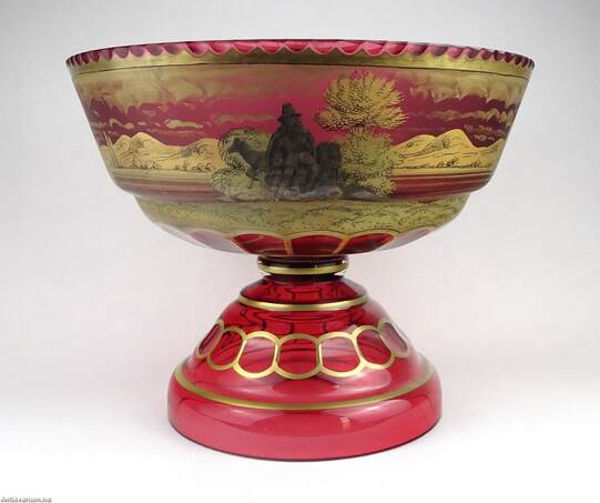 Hibátlan állapotú, hatalmas, kézzel fújt és formázott két darabból összeállított rendkívül dekoratív üveg tál - asztalközép az Oertel Üveggyár műhelyéből. Nagy méretű, kézzel festett, mindkét oldalán arannyal díszített folyóparti tájban ábrázolt pásztorjelenet látható, amely körábra folytonos. Felső pereme hullám mintában csiszolt. Rózsaszínű üvegből készült, gazdagon díszített impozáns üveg dísztárgy. Az Oertel & Co. céget Haidában, az észak-csehországi üvegipar központjában alapították 1869-ben, mint kristályüveg és ólomkristály feldolgozásával foglalkozó családi vállalkozást. A cég alapítója (Johannes Oertel) új üvegkikészítési technikákat keresett, és 1887-ben és 1889-ben számos módszert szabadalmaztatott üvegtárgyak színes díszítésének előállítására valamint üveg- és porcelántárgyak gyöngyházfényű díszítésének módszerére.