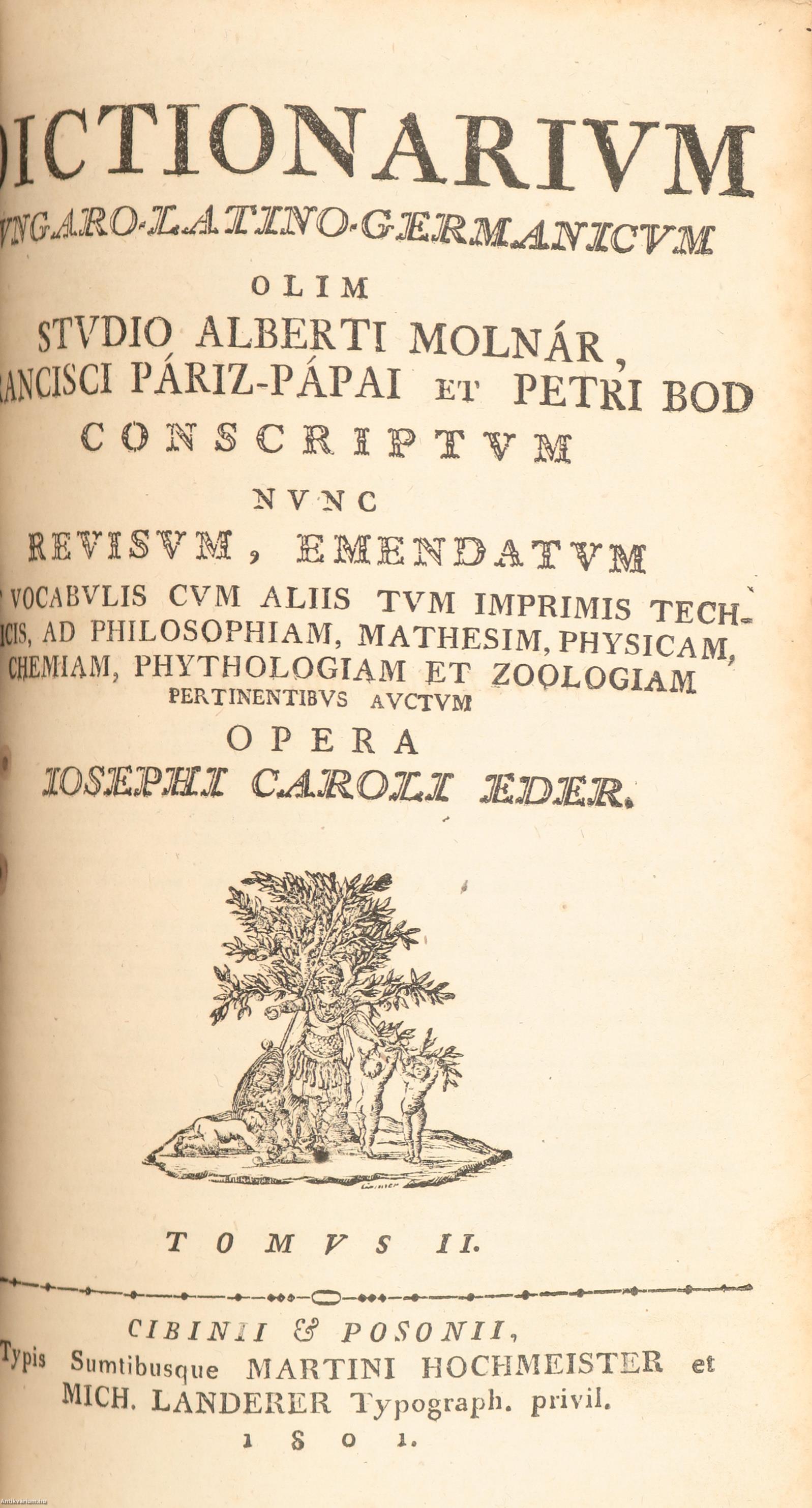 Kiadja a magyarigeni prédikátor: Bod Péter. Új kiadás. Néhány fekete-fehér könyvdísszel díszített kötet. A német rész gótbetűs. Nyomtatta: A. Joannis Michaelis Landerer de Füskút et Martini Hochmeister, Typographorum, et Bibliopolarum C. R. P. A második kötet (Dictionarium ungaro-latino-germanicum) önálló, részletes, kötetvégi regiszterrel rendelkezik.