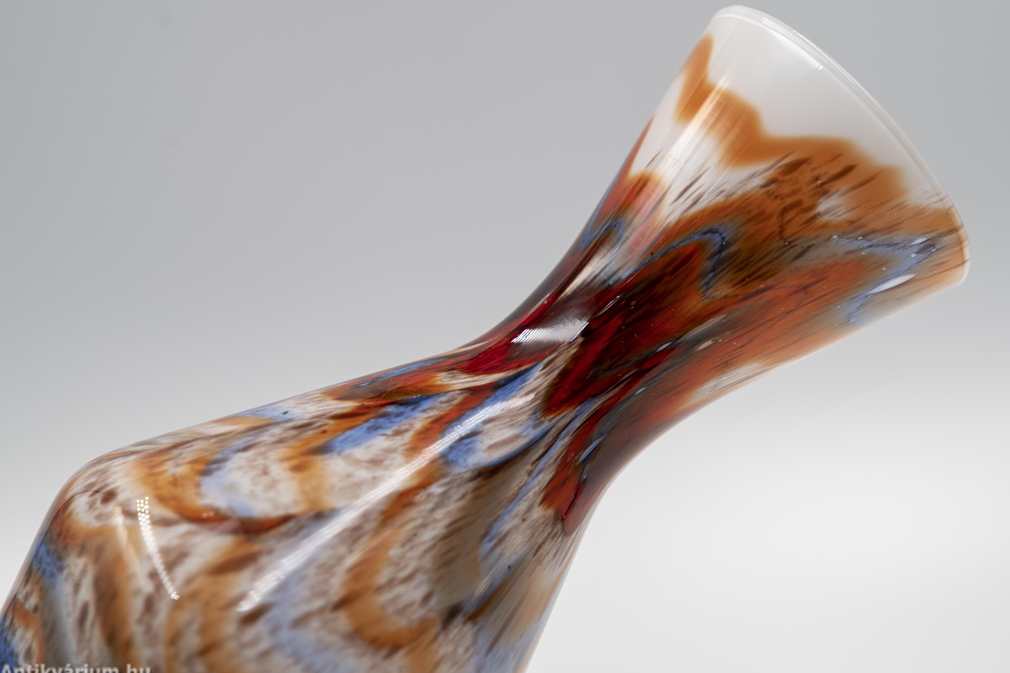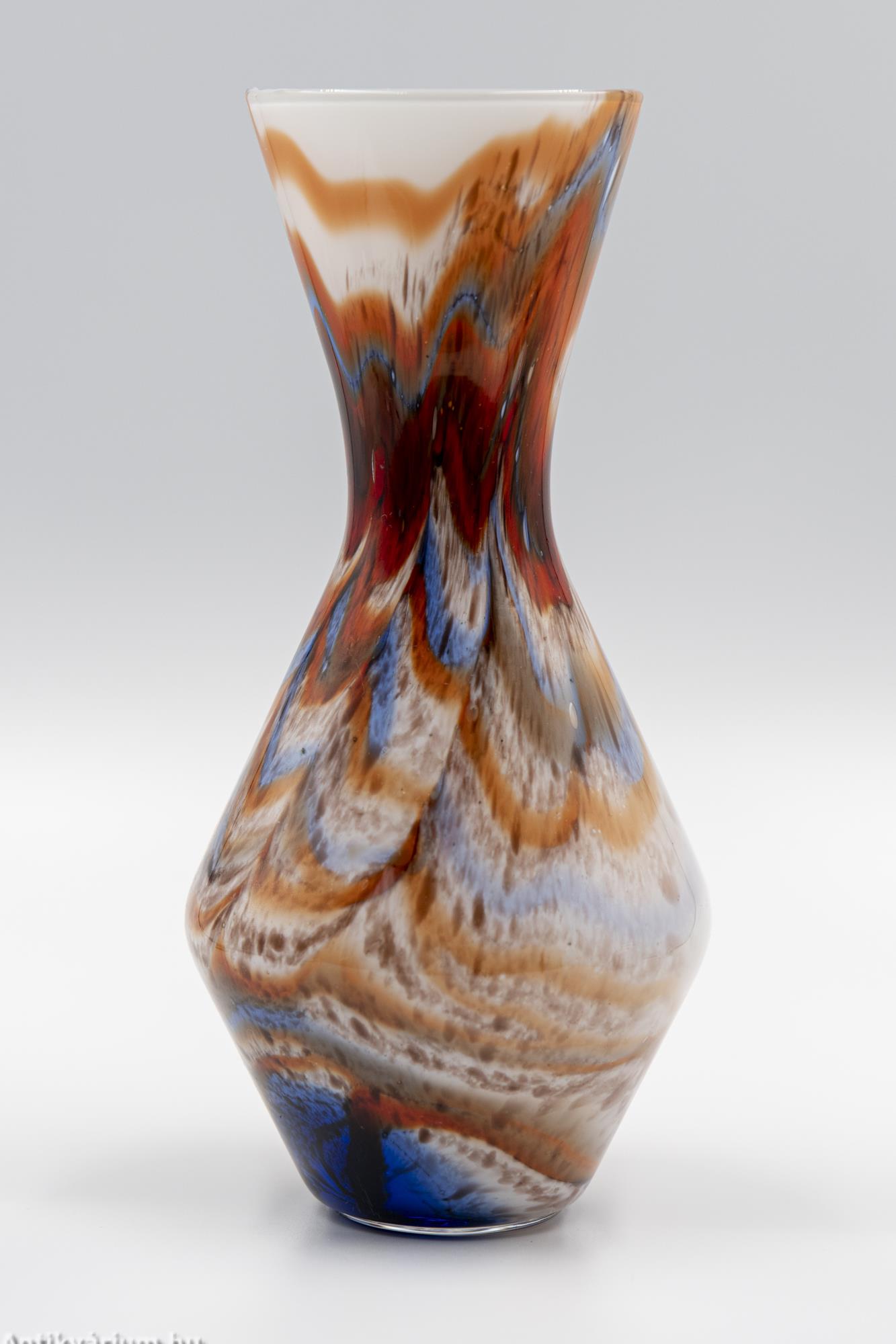 Hibátlan állapotú, fújt és kézzel formázott Carlo Moretti üvegváza, amelyet Olaszországban készítettek az Opaline Firenze Studioban. Kiváló minőségű olasz opálüvegből készült az 1970-es évek pop-art kultúra színösszeállításával. Alapszín: kiváló minőségű olasz fehér opálüveg, amelyet élénk hatású piros - narancs - kék és ezek árnyalatainak színhatása egészít ki. Carlo Moretti 1958-ban megalapította saját cégét, majd később Giovanni Moretti, testvére is csatlakozott hozzá. Carlo Moretti színes, márványmintás mintákat készített, valamint számos matt felületű, Satinato néven ismert vázát és tálat. Ugyanez a sorozat megtalálható fényes felülettel is. Később elkezdtek italos poharakat, valamint dekoratívabb vázákat gyártani. A cég a mai napig aktív.