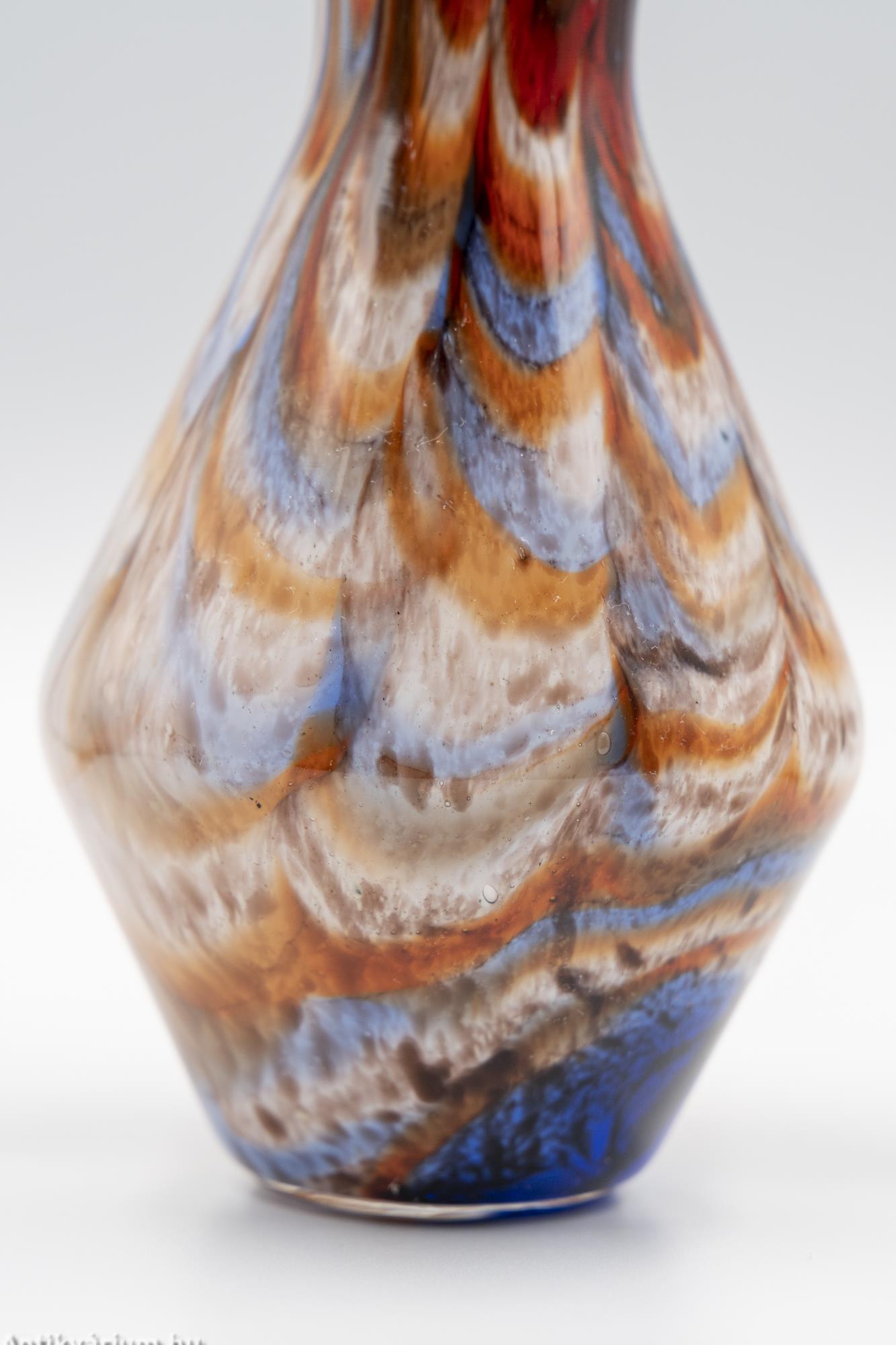 A muránói Carlo Moretti műhelyéből. Carlo Moretti 1958-ban alapította a saját társaságát, később csatlakozott hozzá Giovanni Moretti, testvére. Carlo Moretti márványos mintázatú színes mintákat készített, valamint számos vázát és tálat, matt felülettel, Satinato néven. Ugyanez a mintázat megtalálható fényes kivitelben is. Később elkezdték az italáru poharak gyártását, és további dekoratív vázákat gyártottak. A cég ma is aktív. Vissza