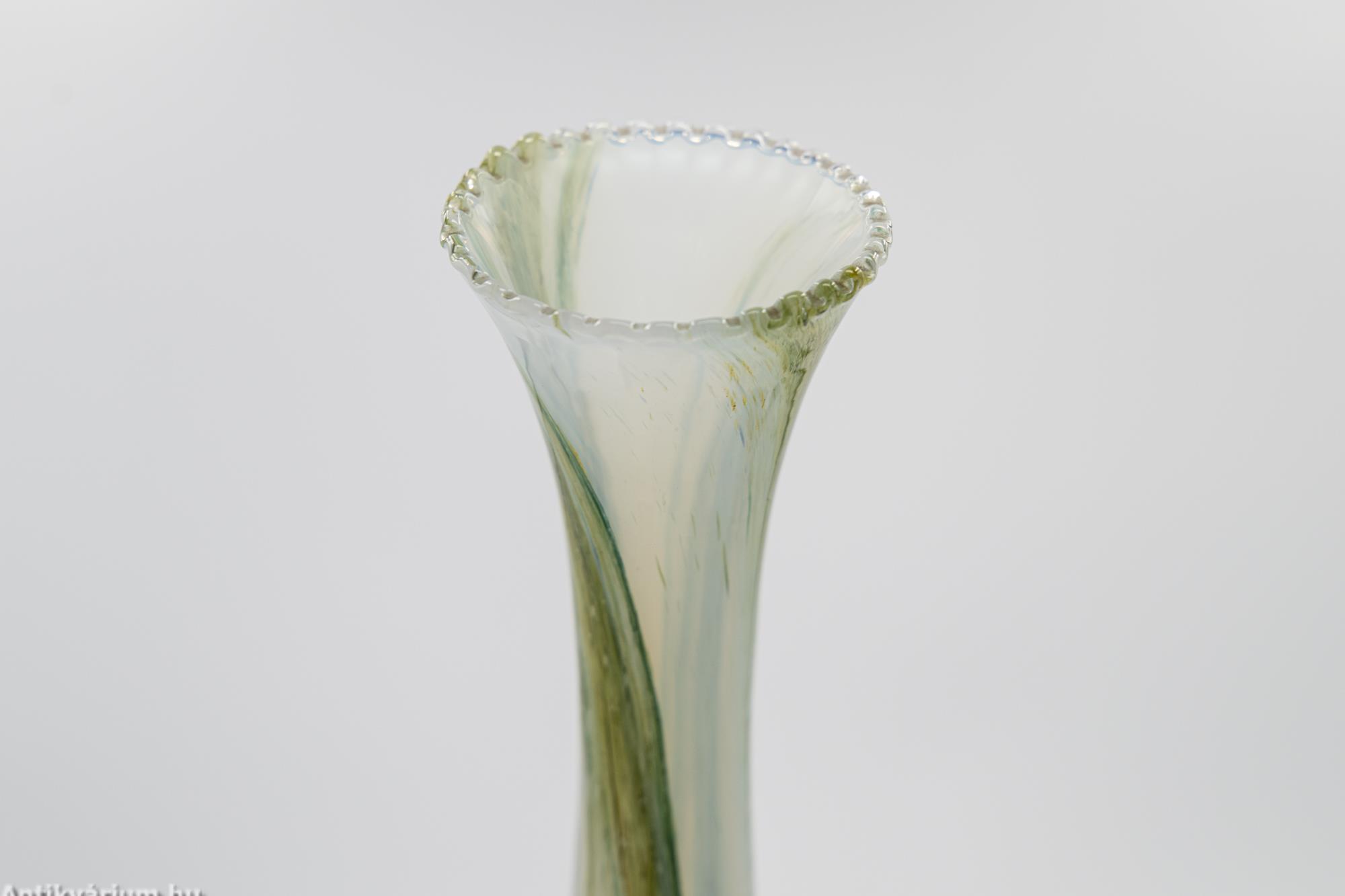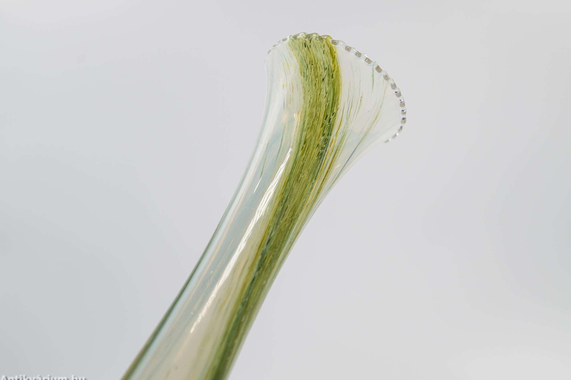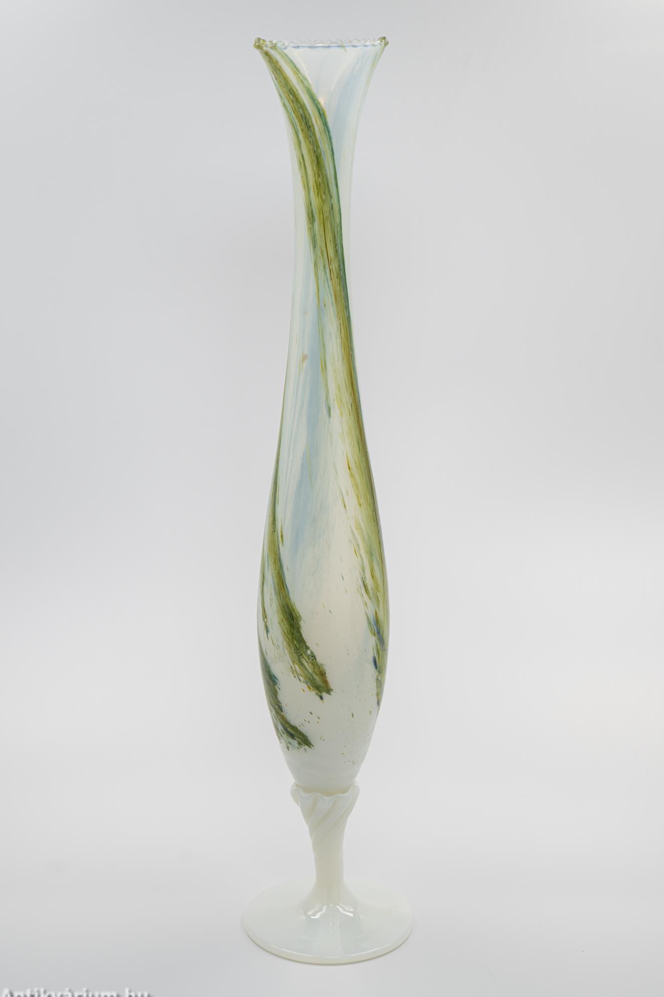 Hibátlan állapotú, a 20. század első felében készített légies megjelenésű muranoi opalin üveg váza két oldalán stilizált levélmintával. Különleges megjelenését a fehér opalin üvegrétegen megjelenő analóg színhatás, (a színkörön egymás mellett elhelyezkedő színek) azaz a sárga és a zöld szín harmóniája és a kontrasztos formavilág adja. Jellegzetessége a kifejezetten hosszúkás alakja, amely nagyon keskeny szélességgel párosul. Felső peremét finom hullám forma díszíti, talprészéhez csavart mintájú szárrész csatlakozik.