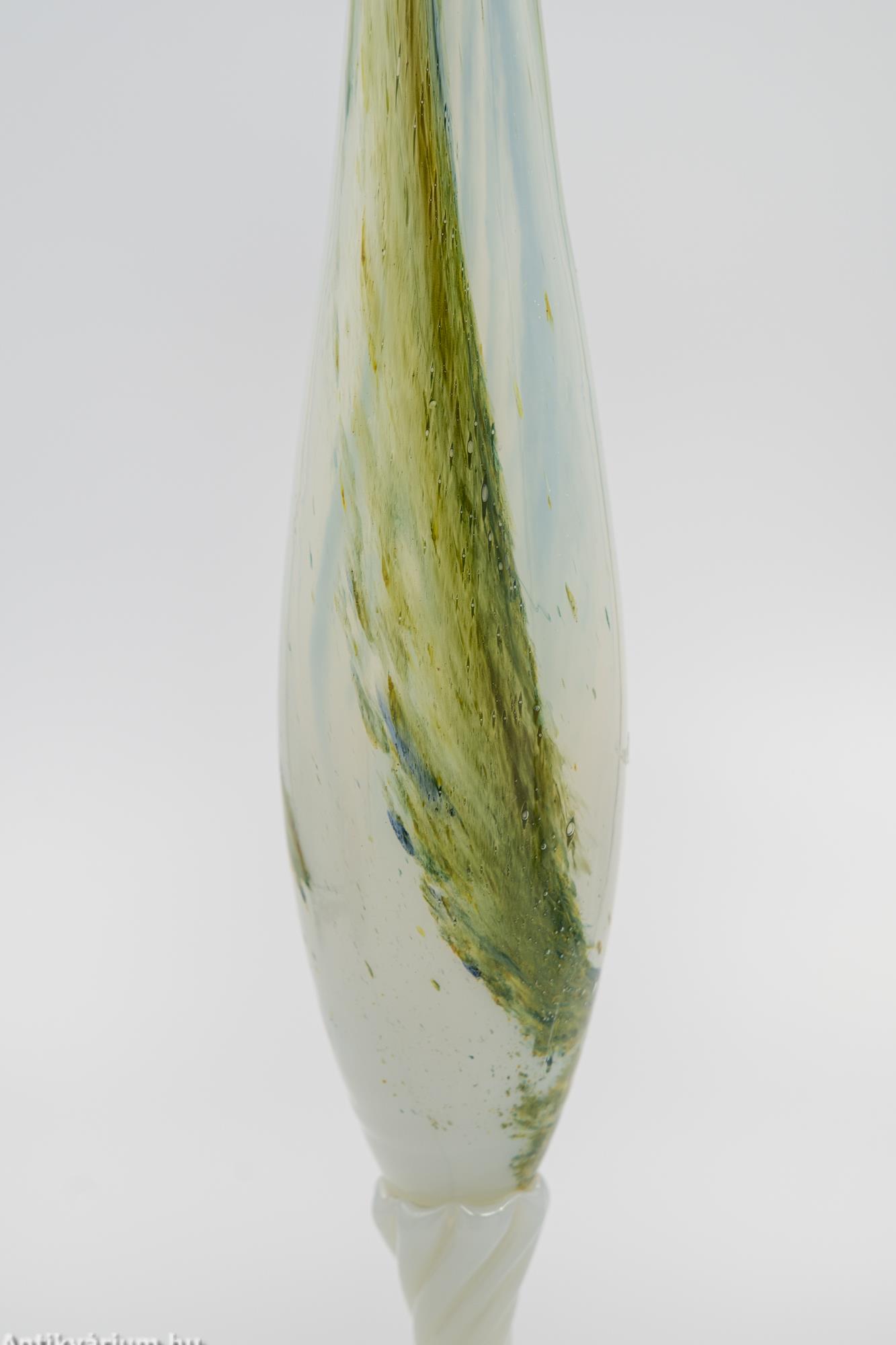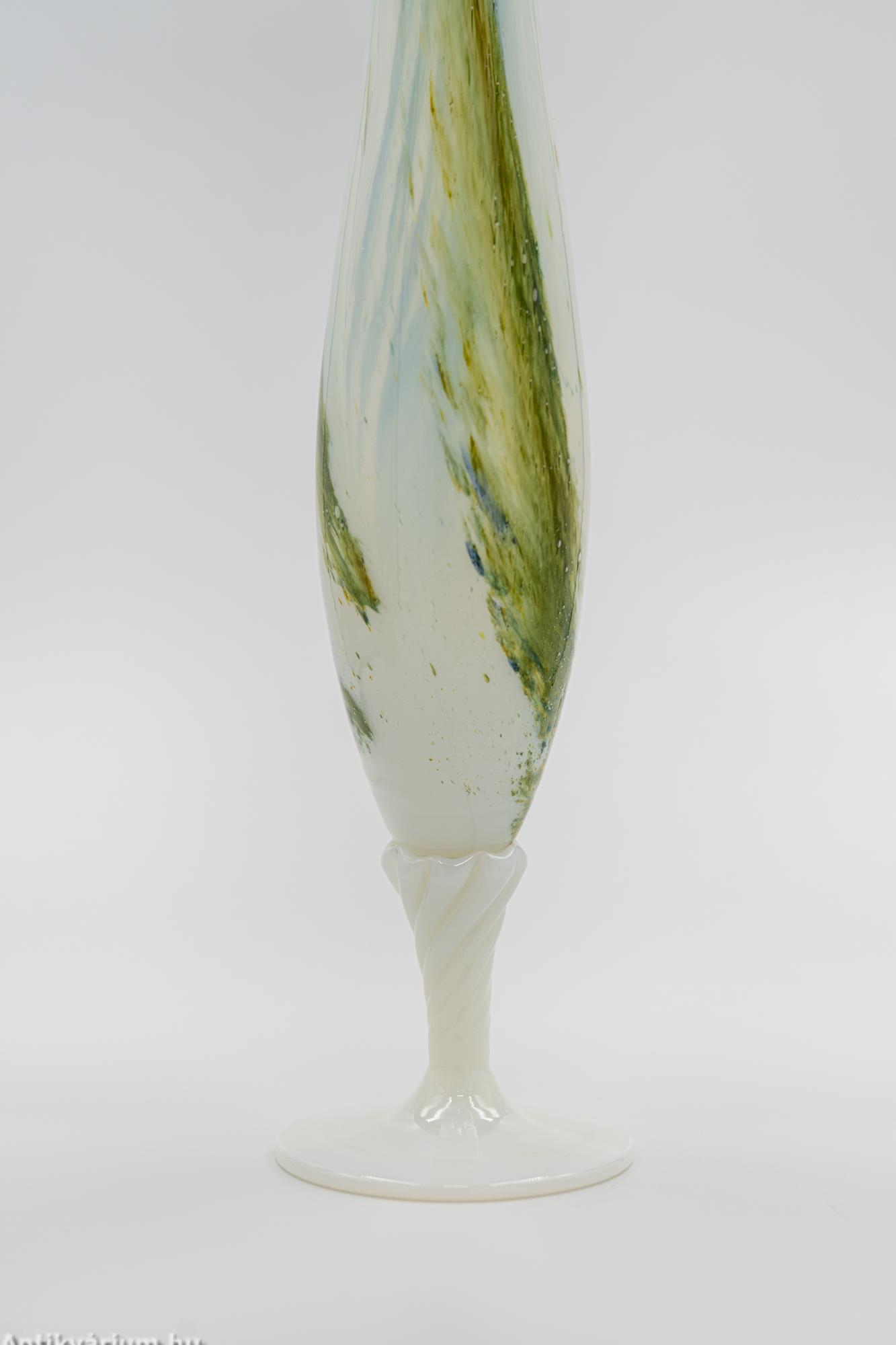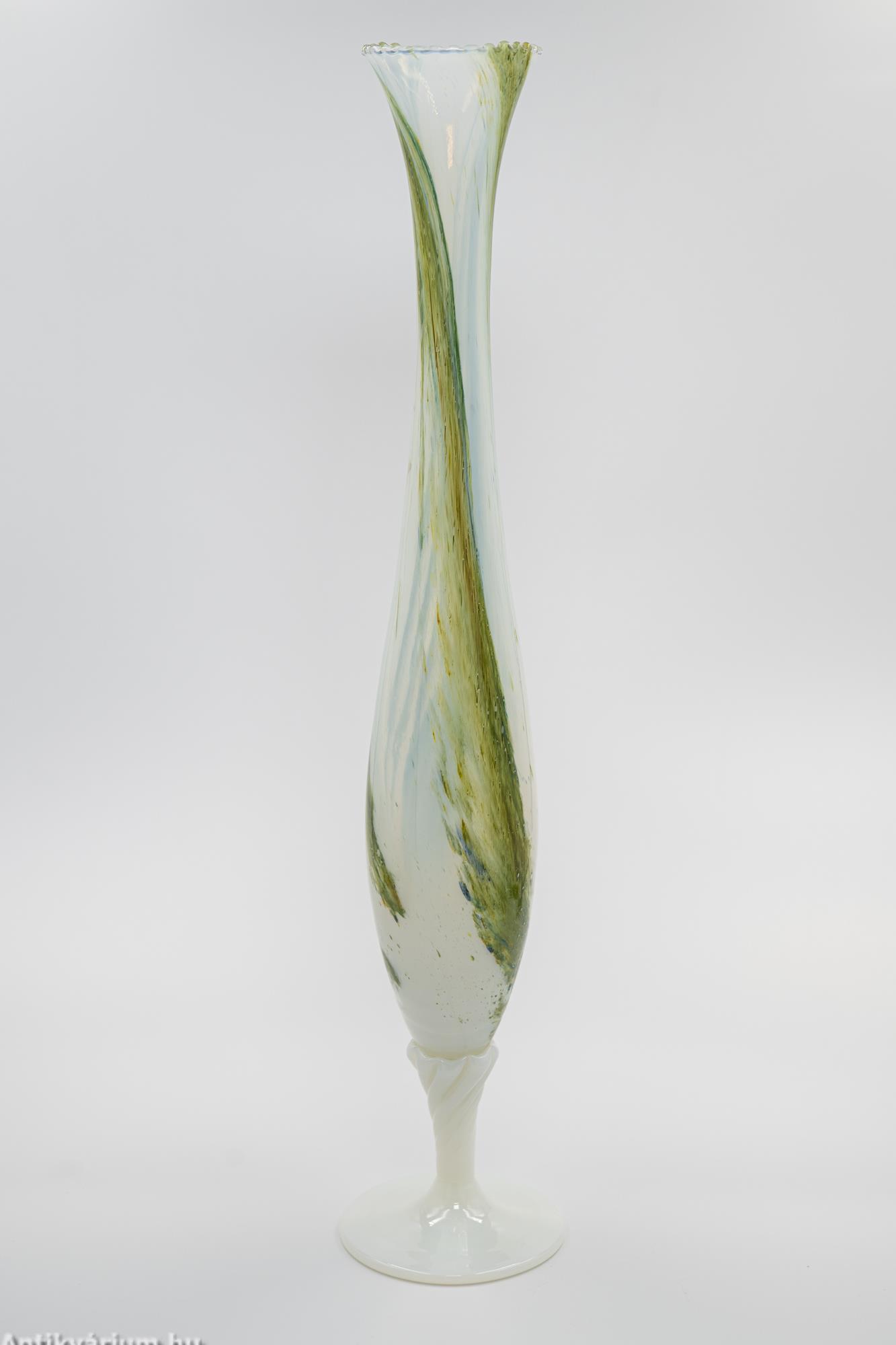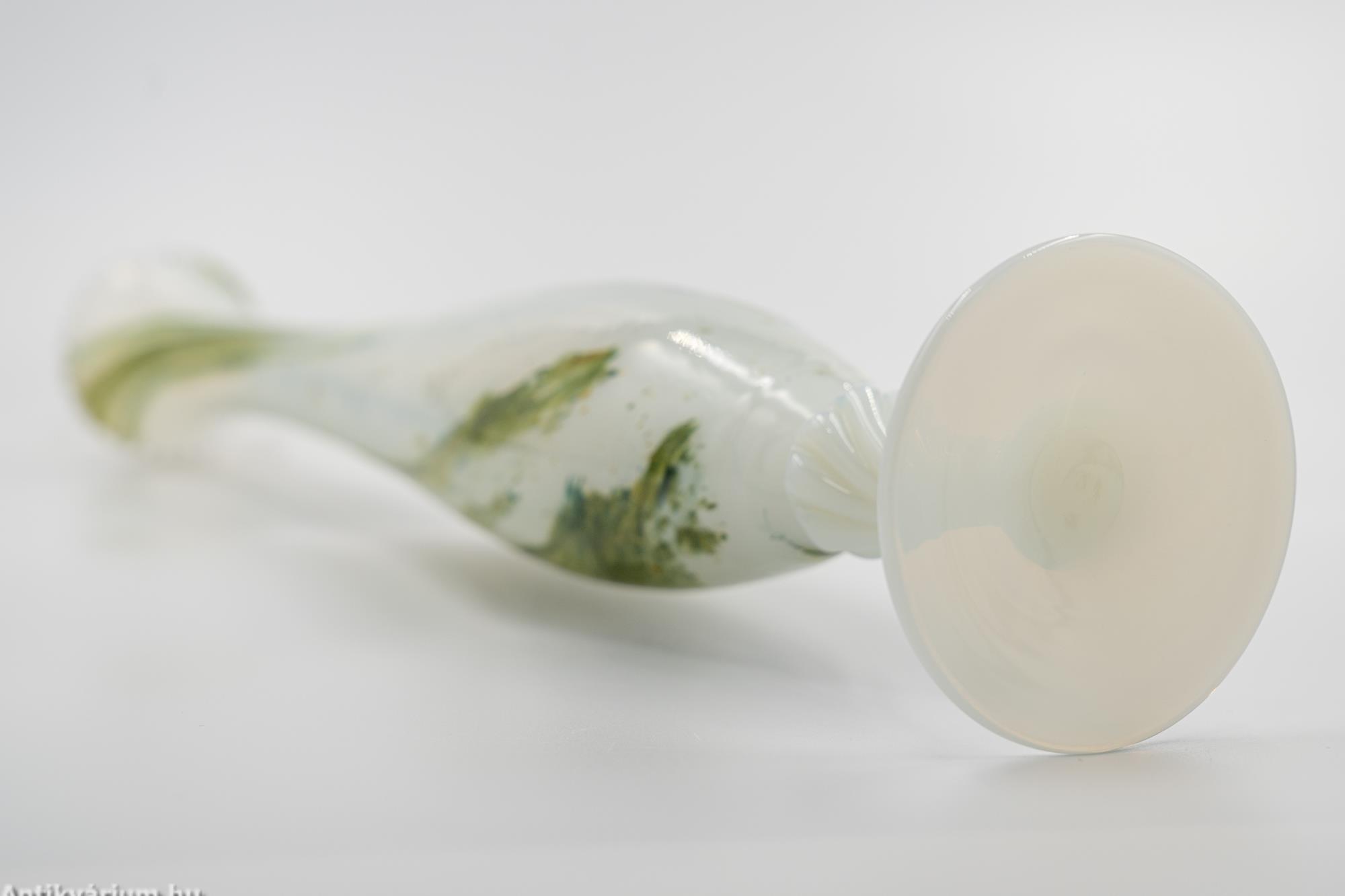 Hibátlan állapotú, a 20. század első felében készített légies megjelenésű muranoi opalin üveg váza két oldalán stilizált levélmintával. Különleges megjelenését a fehér opalin üvegrétegen megjelenő analóg színhatás, (a színkörön egymás mellett elhelyezkedő színek) azaz a sárga és a zöld szín harmóniája és a kontrasztos formavilág adja. Jellegzetessége a kifejezetten hosszúkás alakja, amely nagyon keskeny szélességgel párosul. Felső peremét finom hullám forma díszíti, talprészéhez csavart mintájú szárrész csatlakozik.