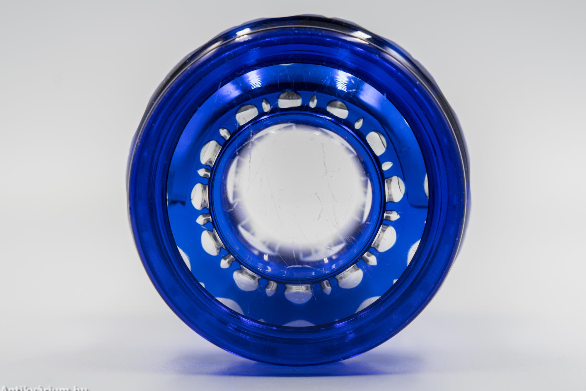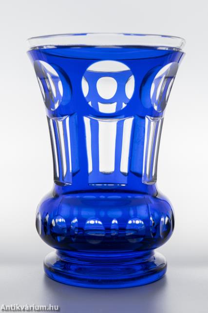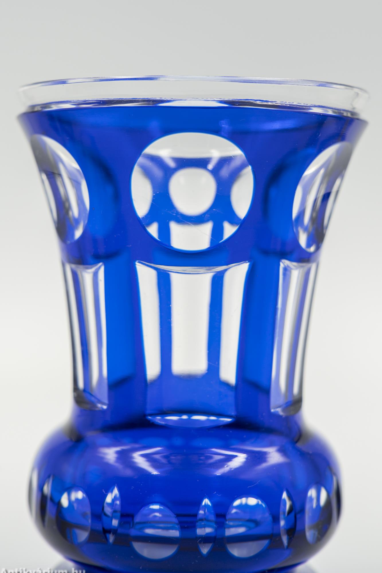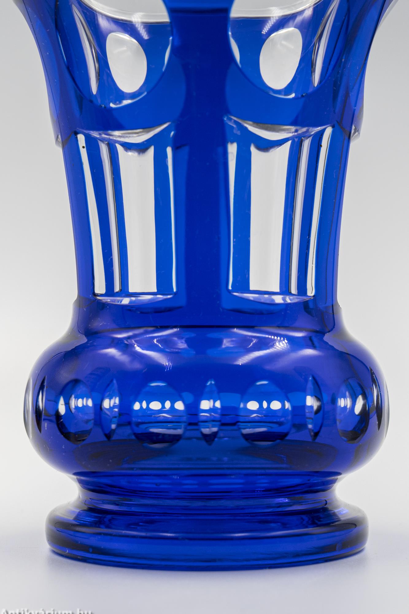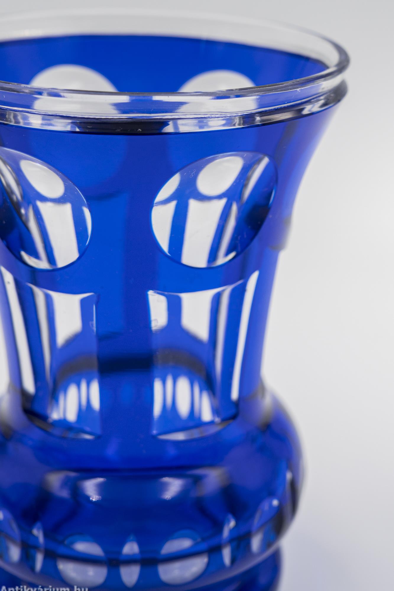 Hibátlan állapotú, Haida üvegműhelyből származó art deco überfang üveg váza az 1920-as évekből. Fújt és kézzel formázott, többrétegű, vastagfalú üvegből készült, külső kobaltkék rétegéből (kobalt-oxiddal történt üvegszínezés) különböző geometrikus visszacsiszolásokkal. Alsó része lapított gömb alakú, ezen lapra csiszolt, felfelé kiszélesedő kehelyforma helyezkedik el. Talpa sima, lapra csiszolt.
