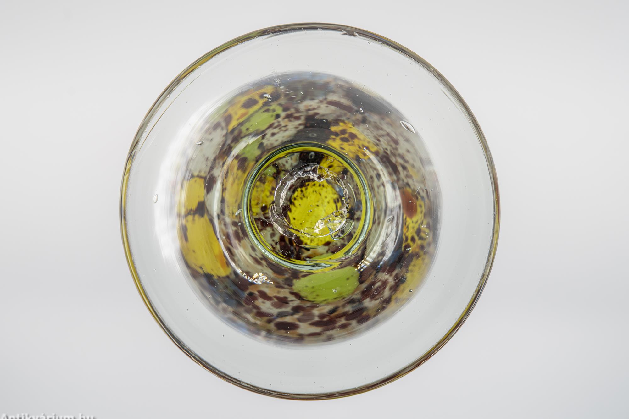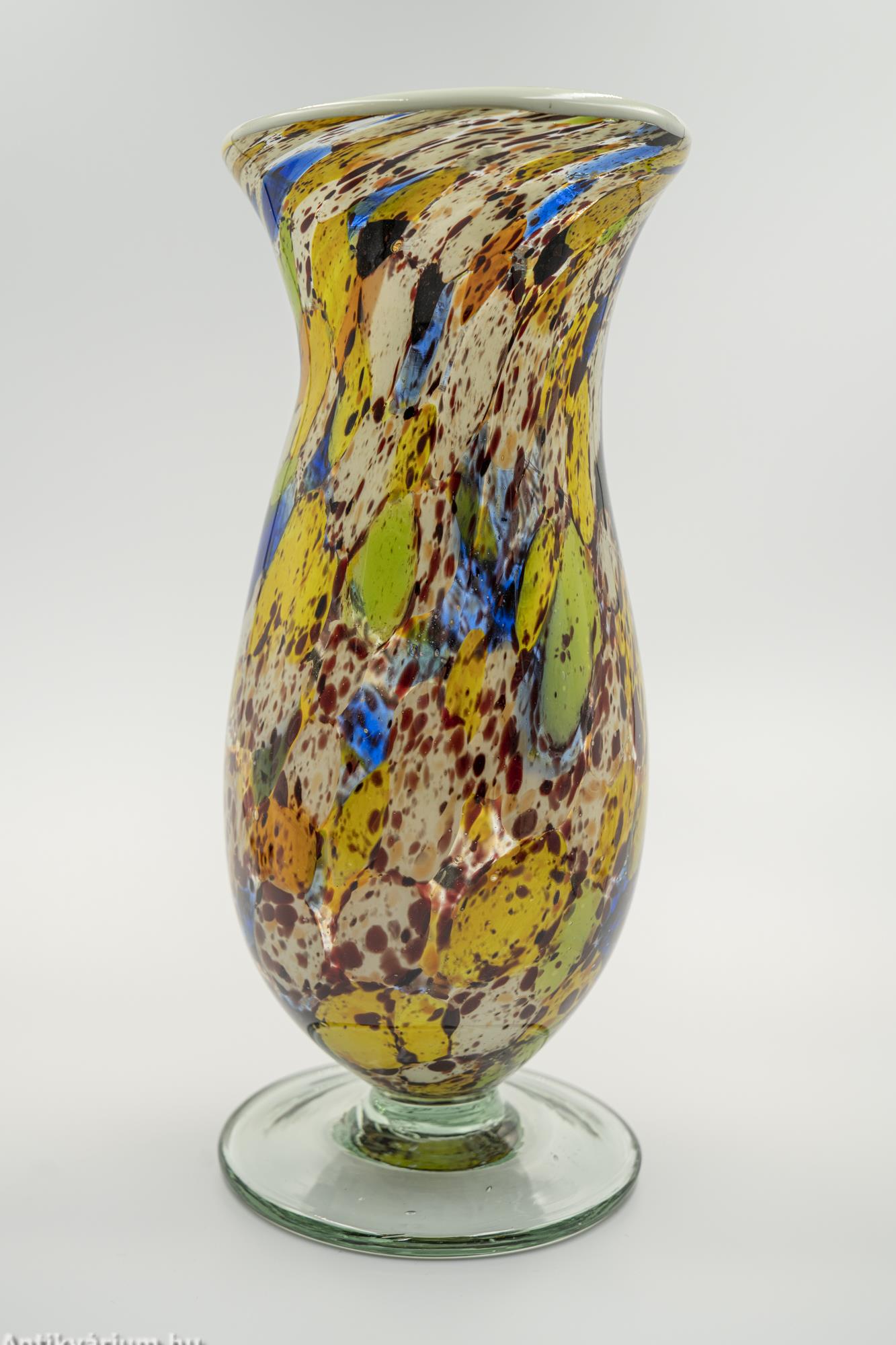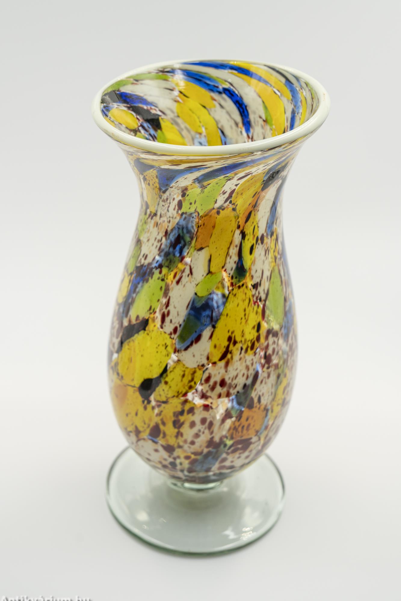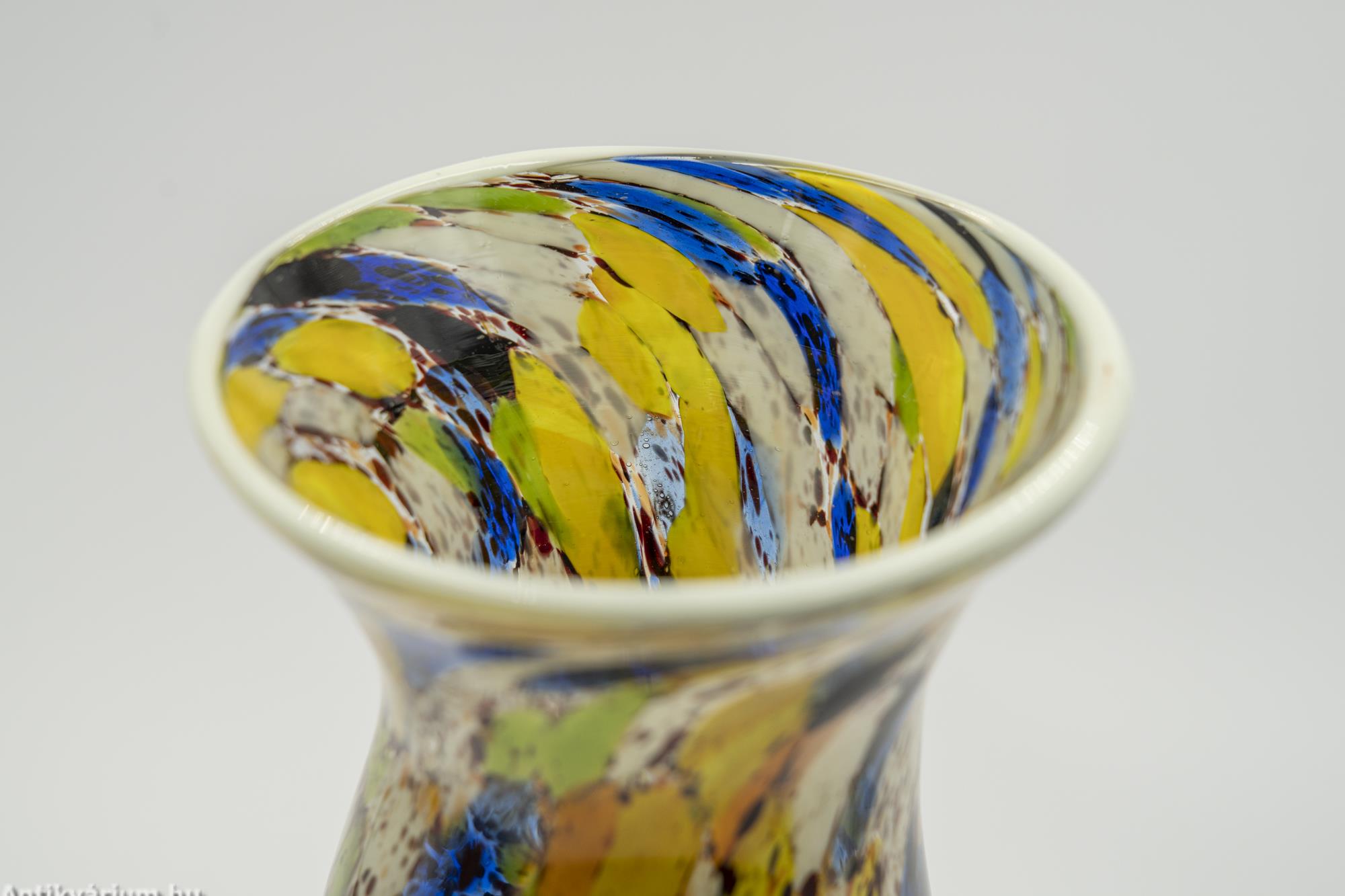 Hibátlan állapotú fújt és kézzel formázott többszínű Murano üveg váza a 20. század közepéről. Fújt üvegrétegei között többszínű dekoratív pettyezett dekorációval díszítették. A sárga és a kék szín összhangját a barna és a zöld színekkel harmonizálták. Perem részét fehér üvegrátéttel díszítették. Különleges pop artos hatása vidám hangulatot tükröz. Talpán a fújás helye ( köldök ) látható.