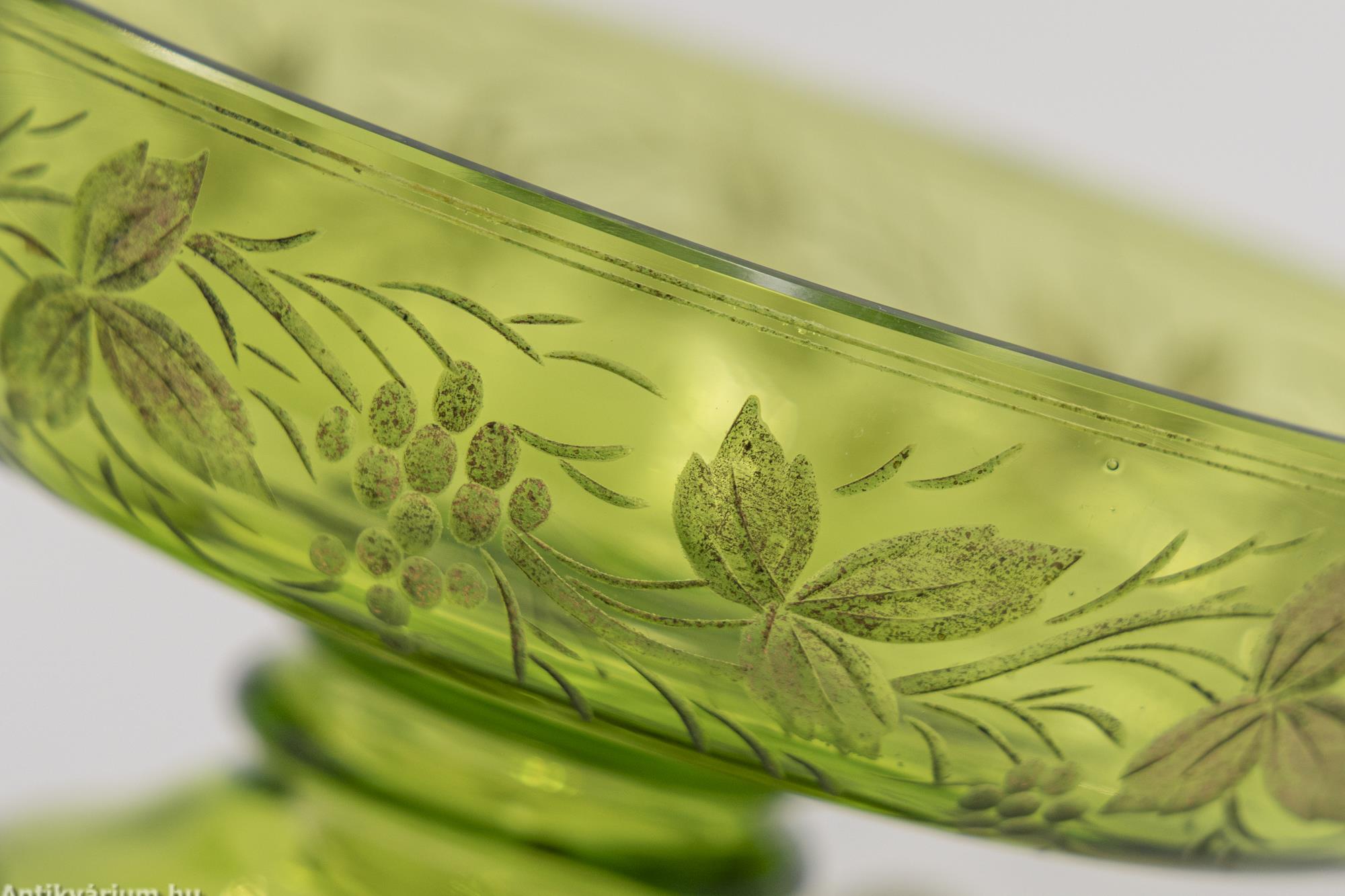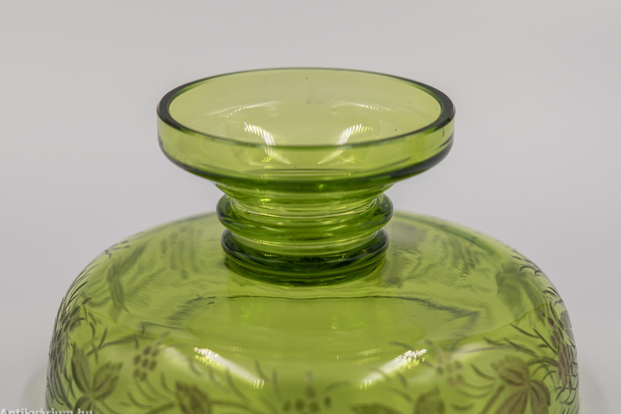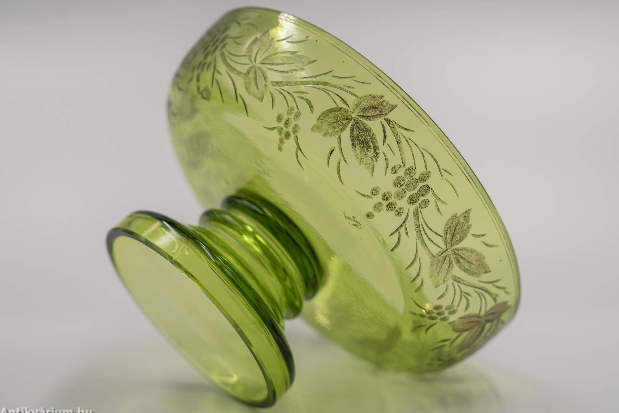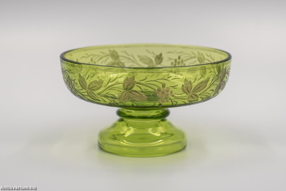Hibátlan állapotú, Moser szecessziós arany festéses talpas üveg ékszertartó tál a 20. század elejéről. Élénkzöld üvegrétegében kicsiszolt levél és növény ornamentikai díszítéssel, amelyet kézi aranyozott festés tesz még láthatóbbá. Vékony üveg hengerekből álló talprésze üreges. A finom, természetből merített minta- és színvilág jellegzetes szecessziós alkotássá teszi ezt az üveg dísztárgyat.