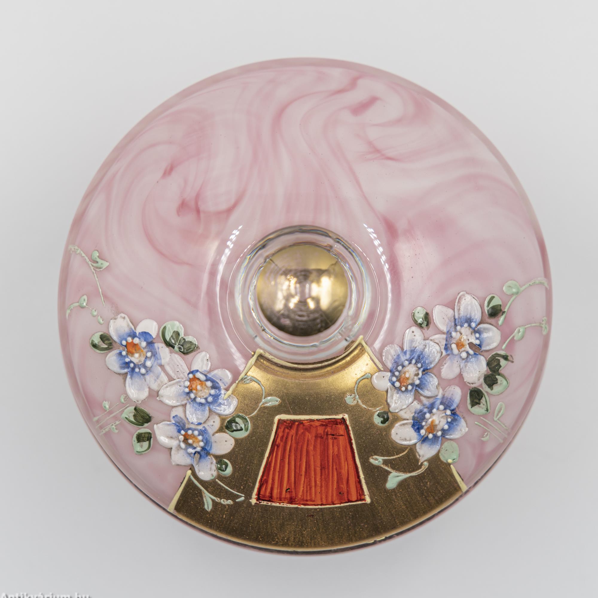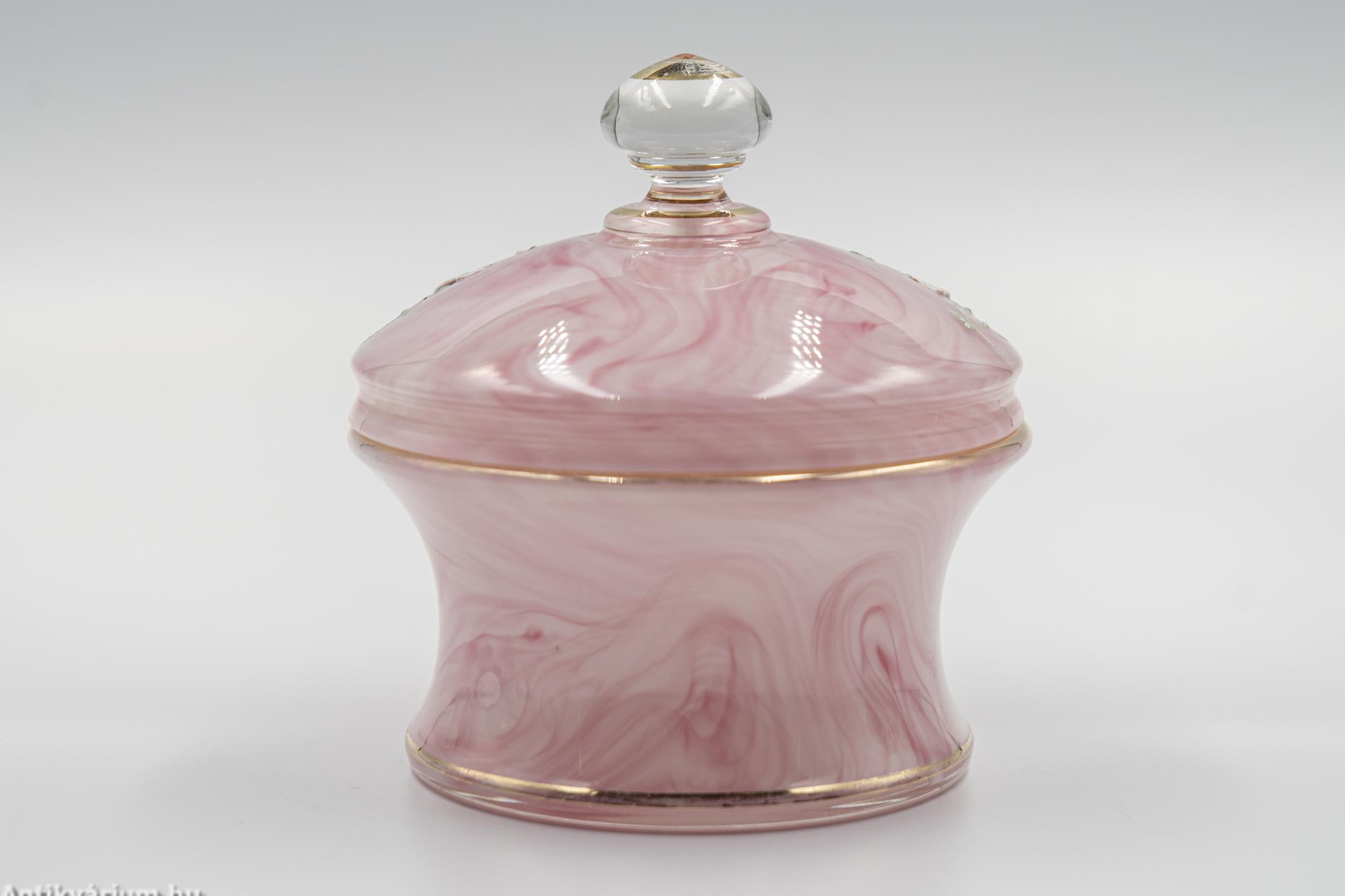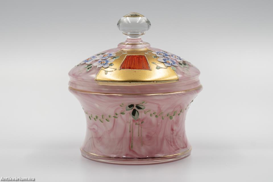 Hibátlan állapotú, fújt és kézzel formázott Jean Beck korai alkotói szakaszában tervezett fedeles bonbonos üveg tál a 20. század első feléből. A márványhatású rózsaszínű alapszínt a kontúrosan kiemelkedő aranyfestés és a tál oldalát és fedelét díszítő virágmotívumos zománcfestés teszi egyedivé. Finom megjelenésével női pipereasztalok dísze is lehet.