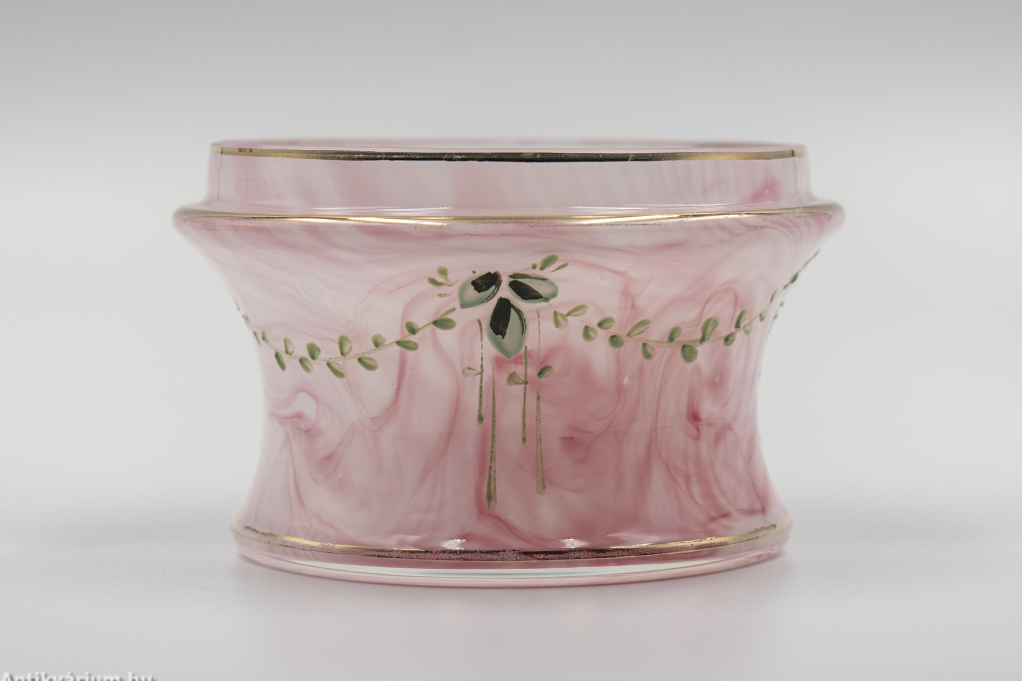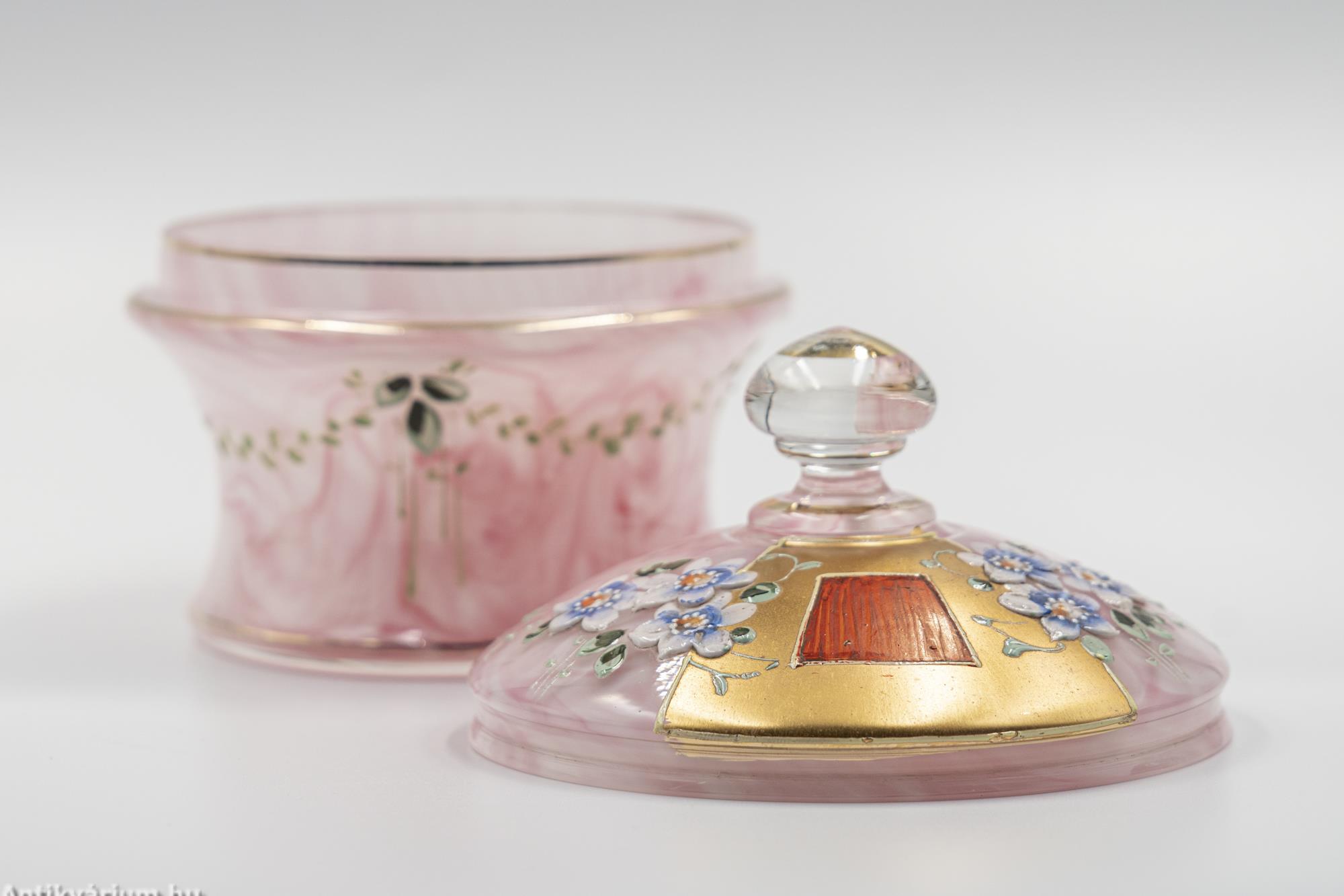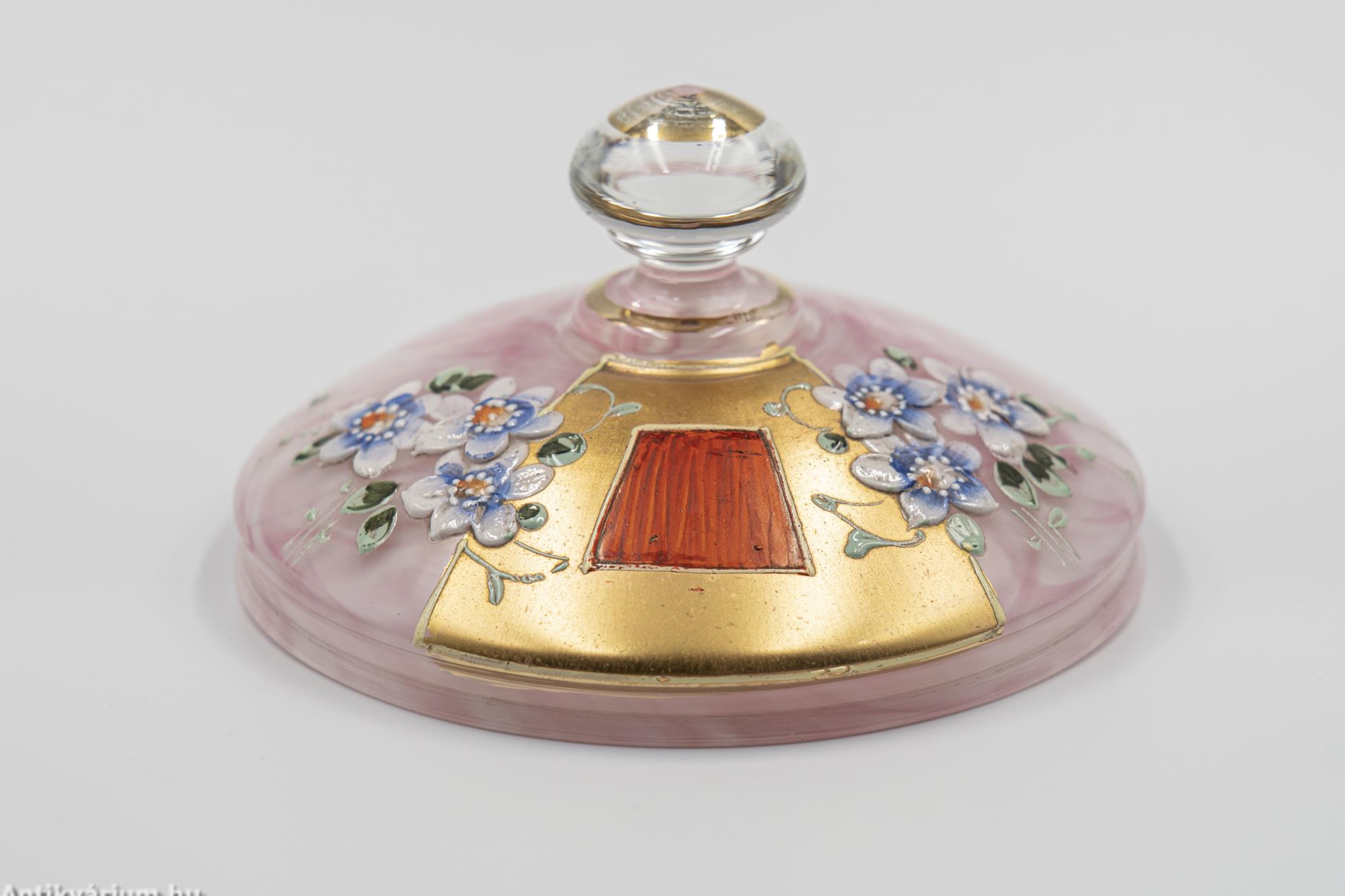 Hibátlan állapotú, fújt és kézzel formázott Jean Beck korai alkotói szakaszában tervezett fedeles bonbonos üveg tál a 20. század első feléből. A márványhatású rózsaszínű alapszínt a kontúrosan kiemelkedő aranyfestés és a tál oldalát és fedelét díszítő virágmotívumos zománcfestés teszi egyedivé. Finom megjelenésével női pipereasztalok dísze is lehet.