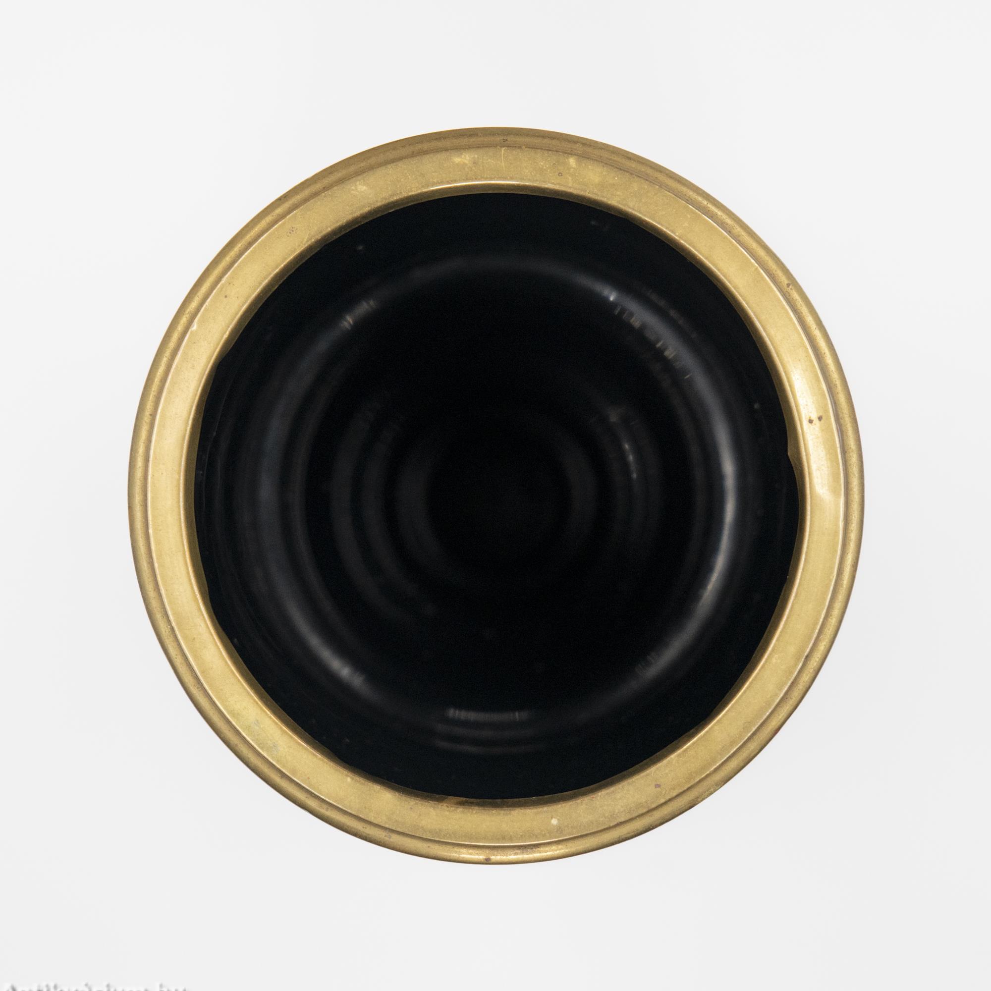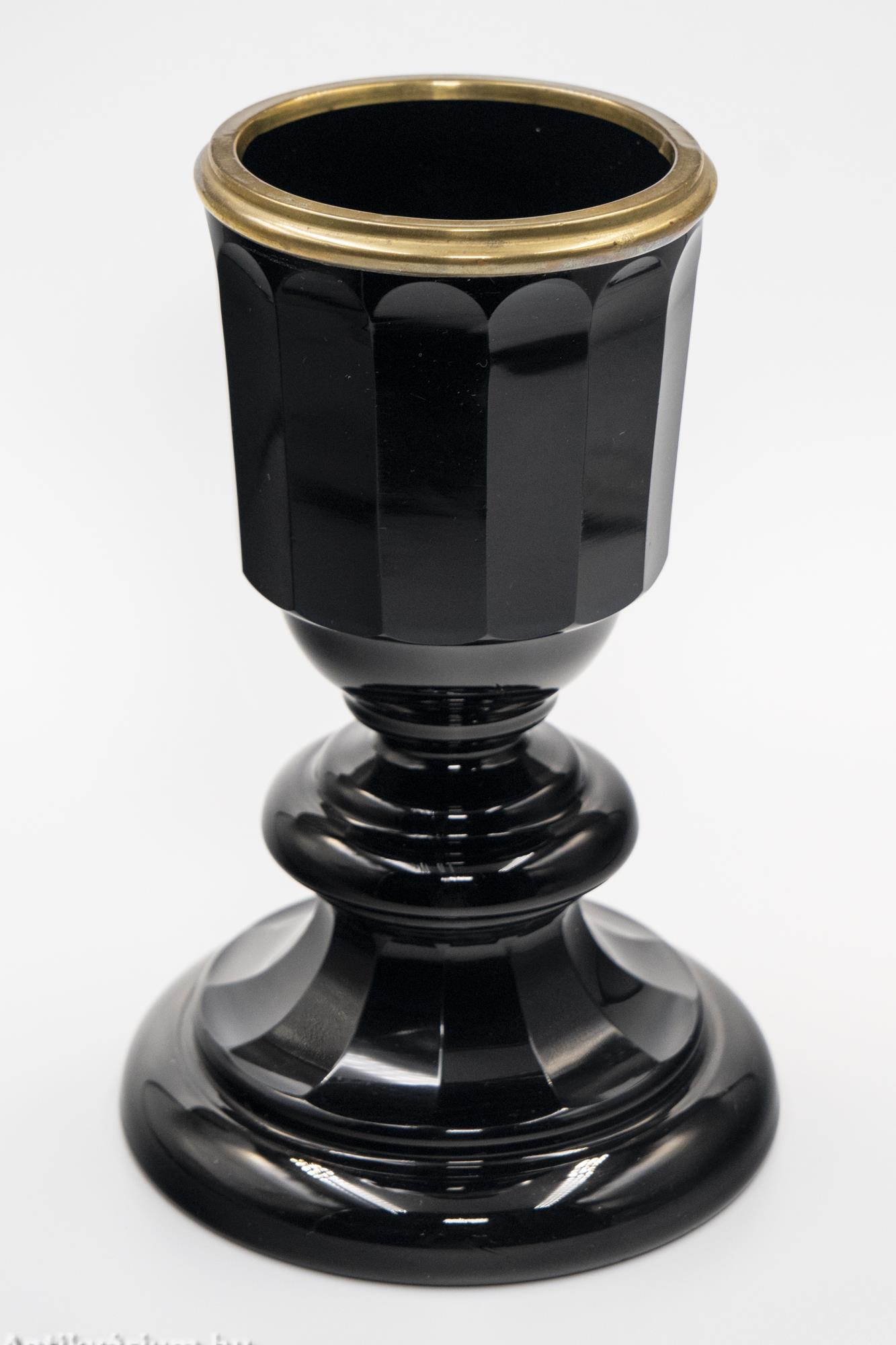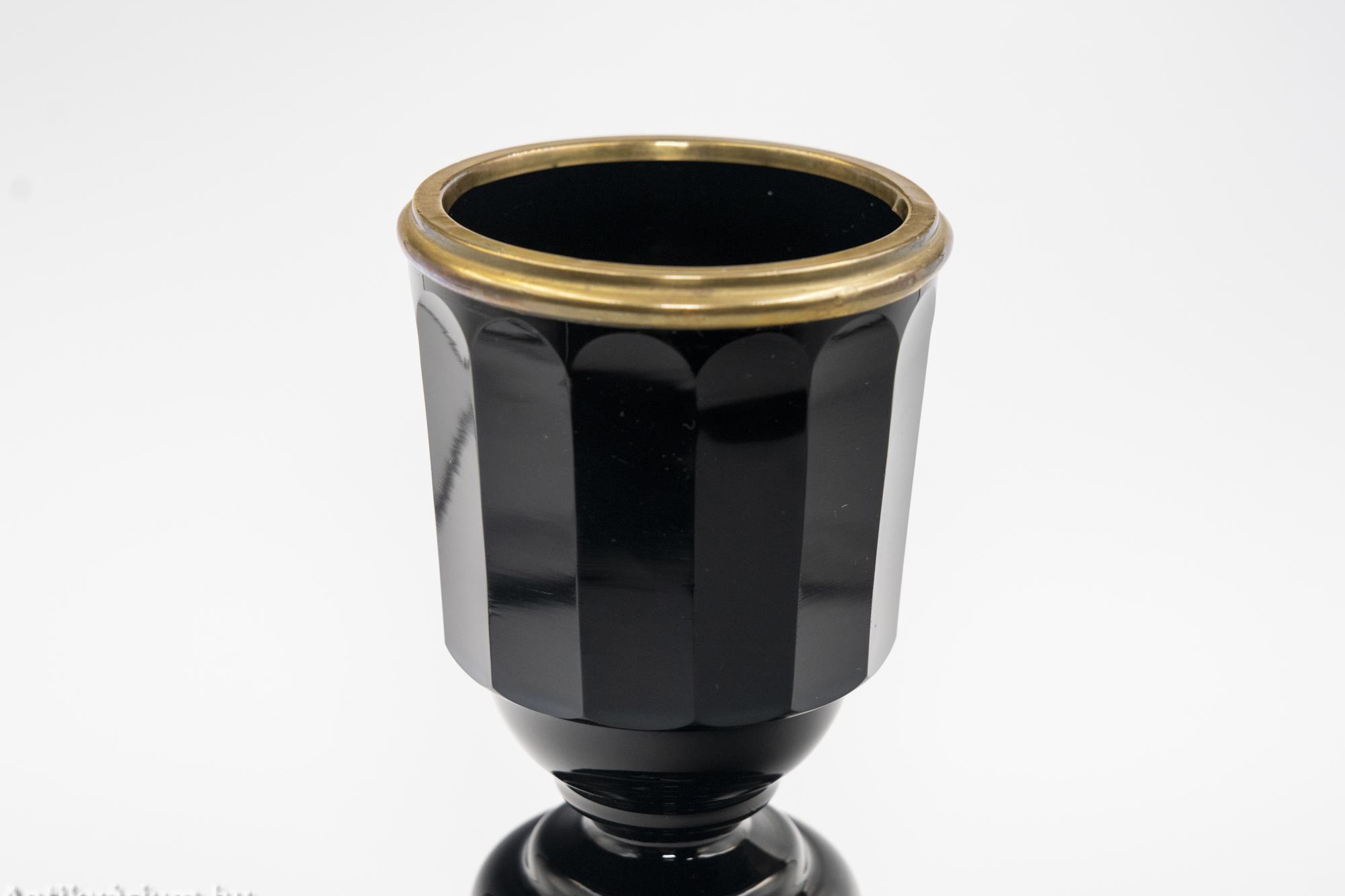 Hibátlan állapotú fújt és kézzel formázott, lapra csiszolt Lithialin üveg kehely (a görög lithosz, „kő” szóból). A lithialin Friedrich Egermann (1777-1864) által Csehországban kifejlesztett üvegfajta, amely egy átlátszatlan vagy áttetsző márványüveg, felülete pedig márványra vagy polírozott drágakövekre emlékeztet. A fekete színű kehely tagolt talapzatát és osztott oldalait simára csiszolt felületek alkotják. Peremén körben fémgyűrű díszíti.