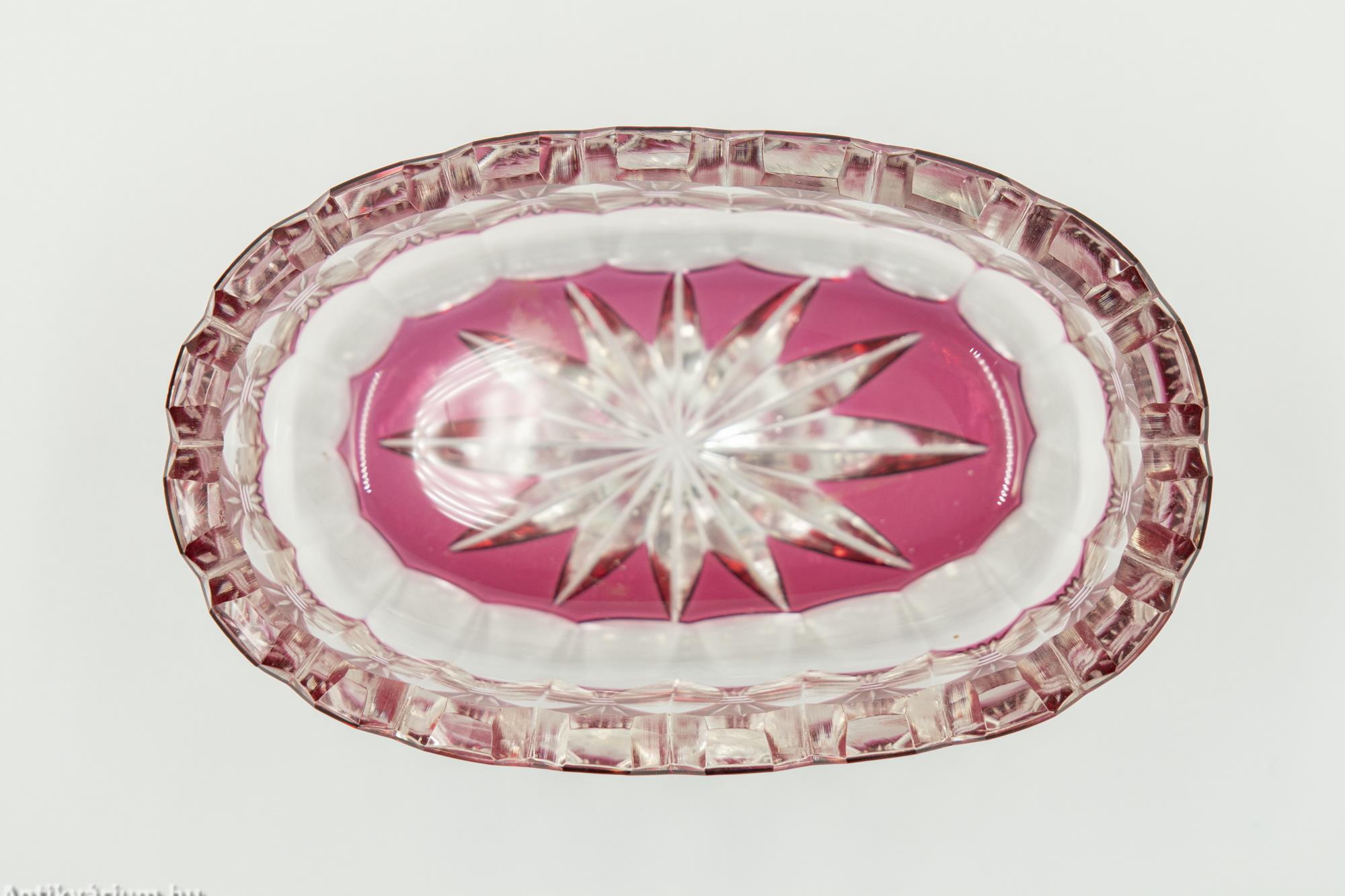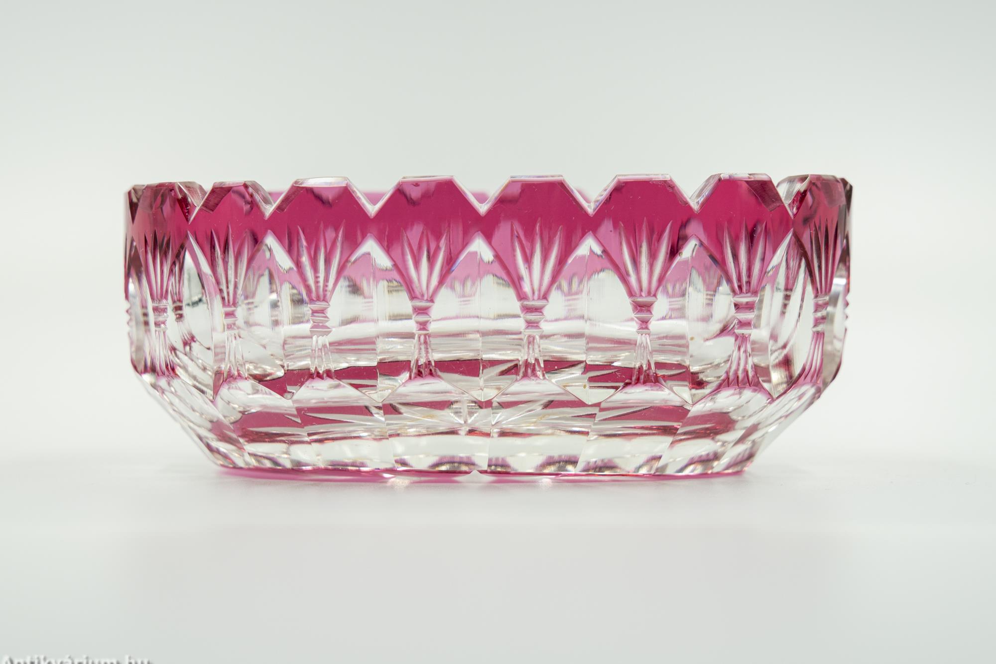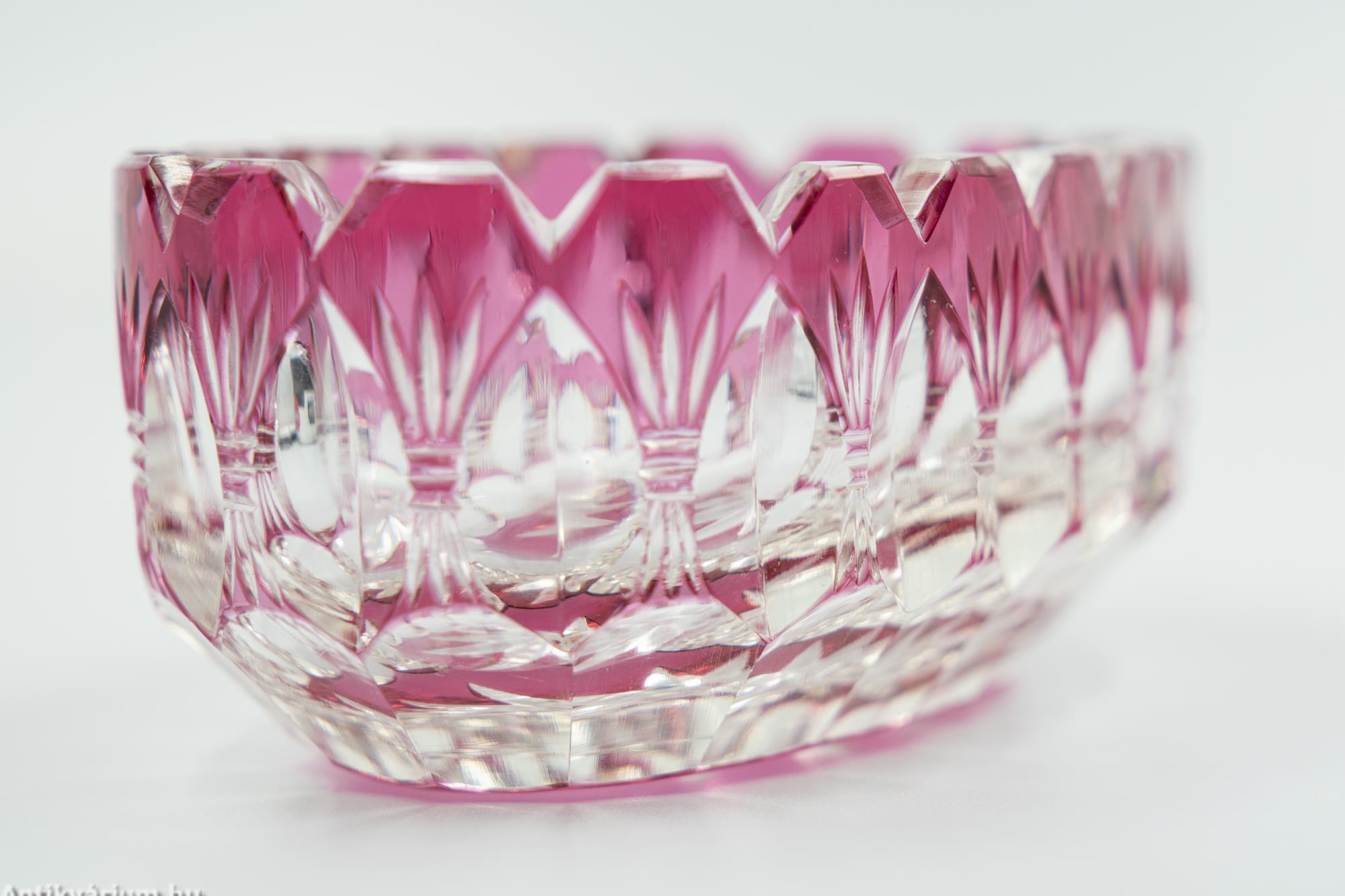 Hibátlan állapotú, fújt és kézzel formázott, finom csiszolású, rózsaszín, ovális alakú Val Saint Lambert ékszertartó kristályüveg tál. Az üveg vastag, mélyen és egyenletesen vágott, bonyolult geometrikus mintával gazdagon díszített, amely végigfut az egész felületen. Talprészén csillagszerű bemetszés látható. A kristály ragyogásáról ismert anyag, amely vegyületeinek tisztaságáról, fénytörési minőségéről és vastagságáról különböztethető meg. Különleges jellemzője a csiszolás, amikor a vágó a mintadarabra húzott mintát belevágja az üveg felületébe. Minden vágástípus egy adott motívumot hoz létre, például ferde vágást, könnycseppeket, paneleket és az ikonikus gyémántvágást.
