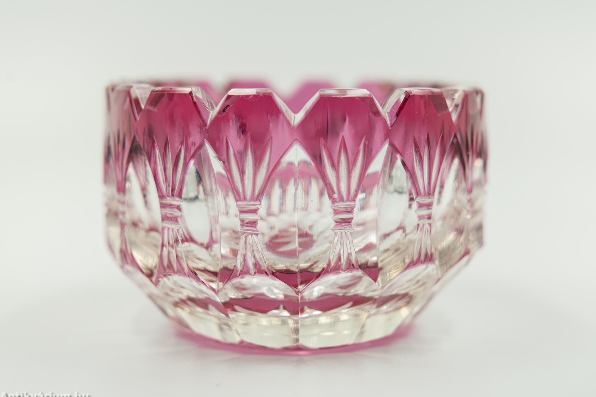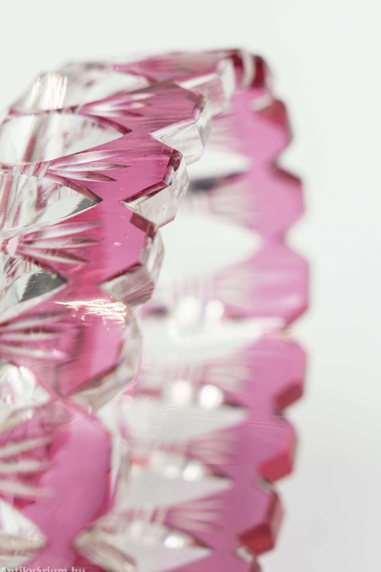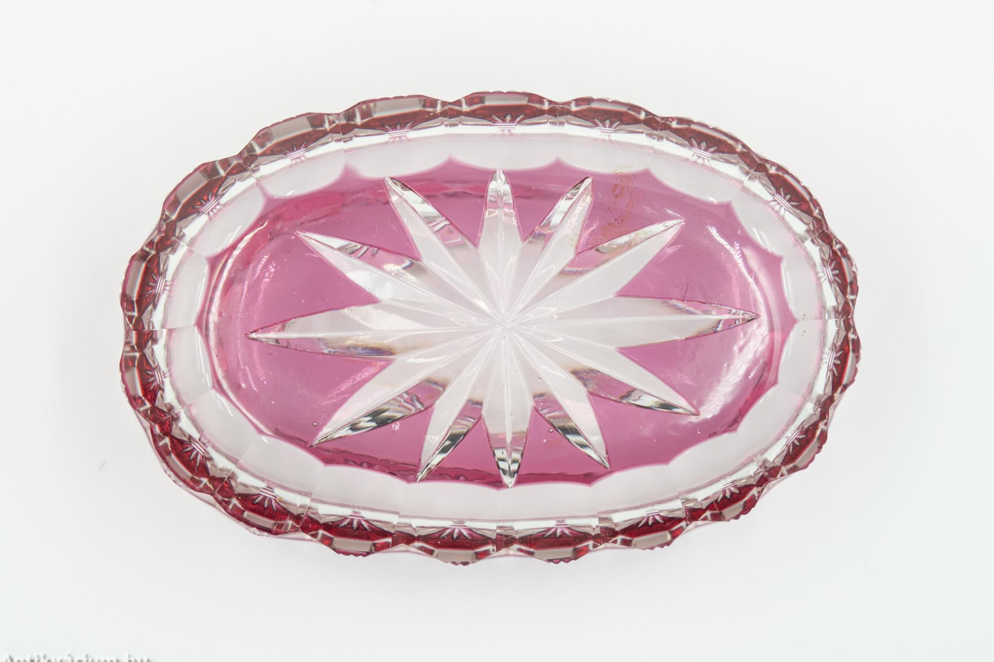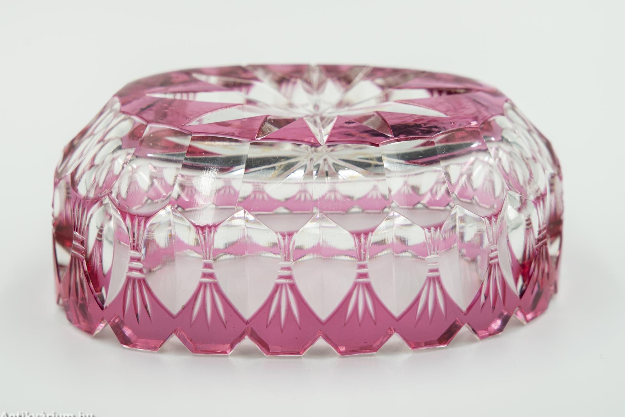Hibátlan állapotú, fújt és kézzel formázott, finom csiszolású, rózsaszín, ovális alakú Val Saint Lambert ékszertartó kristályüveg tál. Az üveg vastag, mélyen és egyenletesen vágott, bonyolult geometrikus mintával gazdagon díszített, amely végigfut az egész felületen. Talprészén csillagszerű bemetszés látható. A kristály ragyogásáról ismert anyag, amely vegyületeinek tisztaságáról, fénytörési minőségéről és vastagságáról különböztethető meg. Különleges jellemzője a csiszolás, amikor a vágó a mintadarabra húzott mintát belevágja az üveg felületébe. Minden vágástípus egy adott motívumot hoz létre, például ferde vágást, könnycseppeket, paneleket és az ikonikus gyémántvágást.