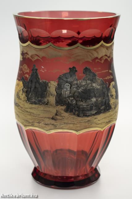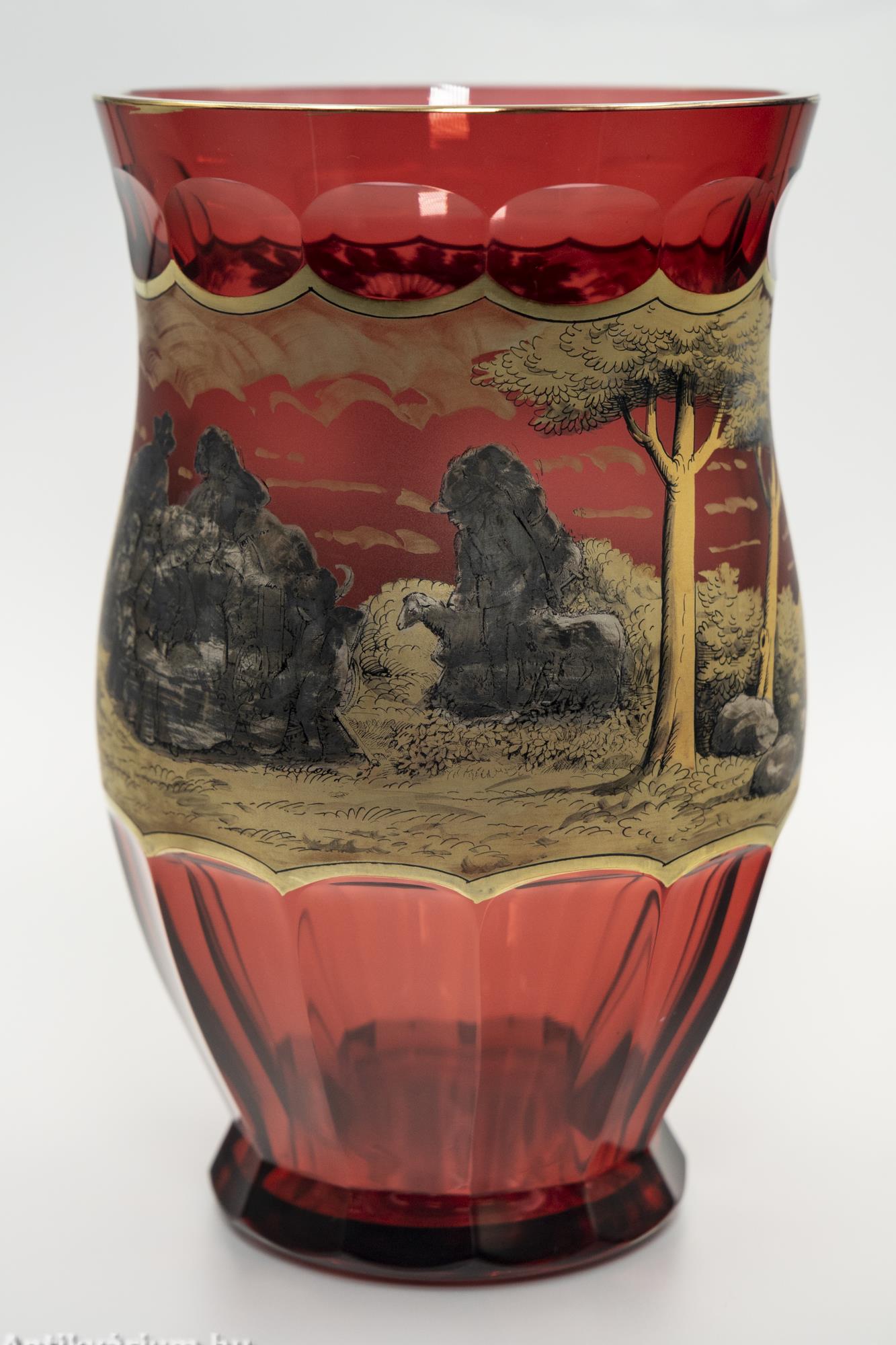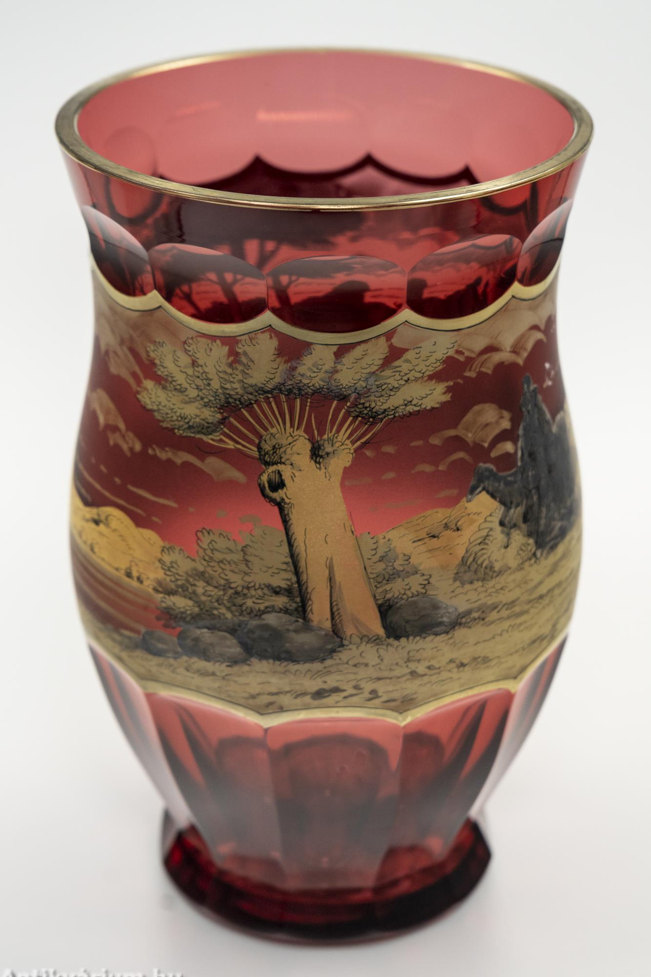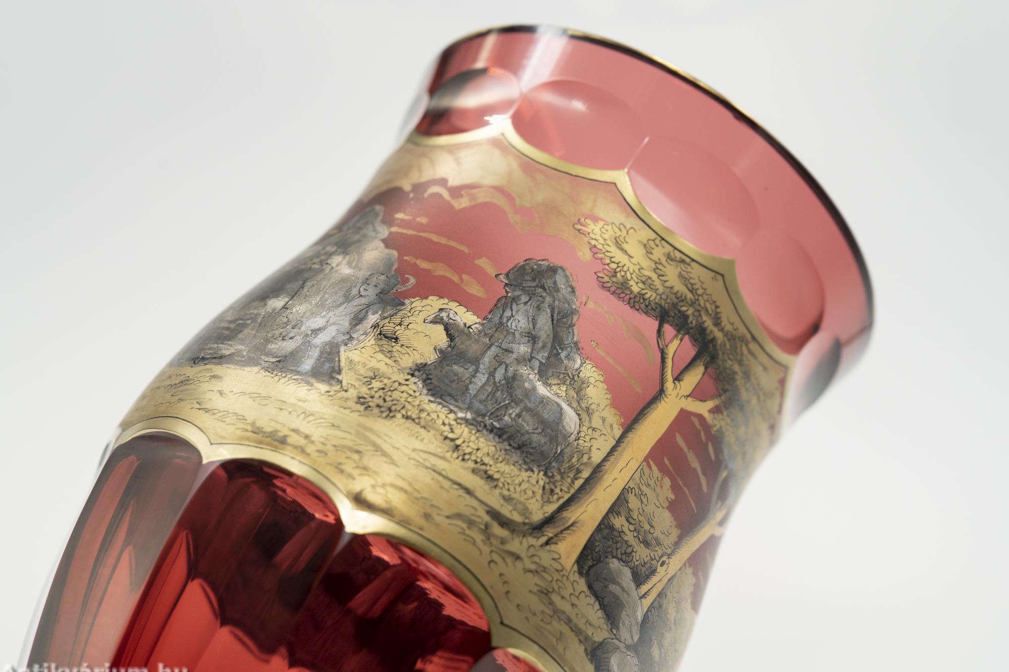Hibátlan állapotú fújt és kézzel formázott rendkívül dekoratív üveg váza az Oertel Üveggyár (Haida) műhelyéből a 19. század végéről. Kézzel festett, mindkét oldalán arannyal díszített folyóparti tájban ábrázolt pásztorjelenet látható, amely körábra folytonos. Rózsaszínű üvegből készült. Gazdagon díszített és lapracsiszolt tagolással megmunkált impozáns üveg dísztárgy. Az Oertel & Co. céget Haidában, az észak-csehországi üvegipar központjában alapították 1869-ben, mint kristályüveg és ólomkristály feldolgozásával foglalkozó családi vállalkozást. A cég alapítója (Johannes Oertel) új üvegkikészítési technikákat keresett, és 1887-ben és 1889-ben számos módszert szabadalmaztatott üvegtárgyak színes díszítésének előállítására valamint üveg- és porcelántárgyak gyöngyházfényű díszítésének módszerére.