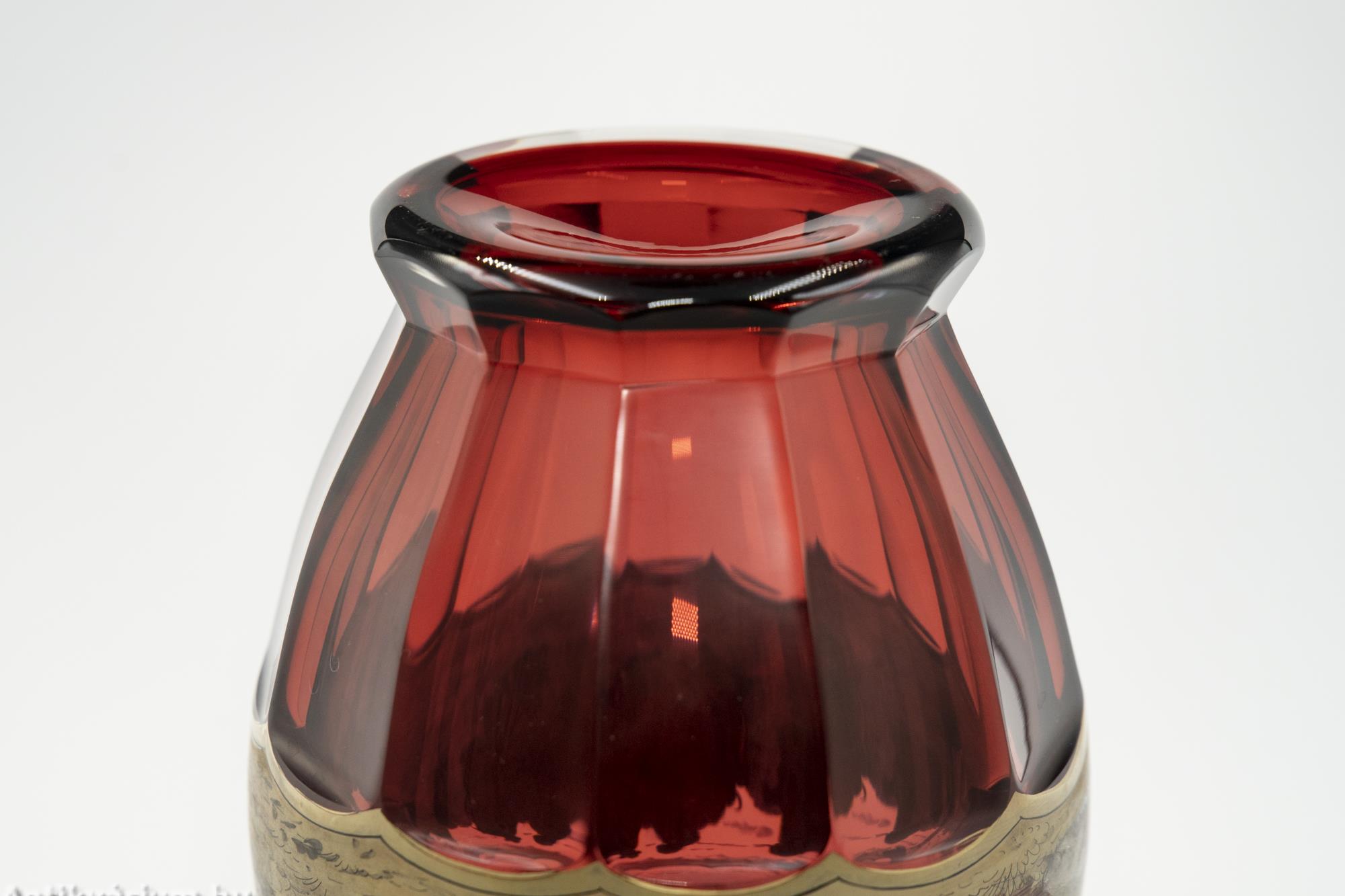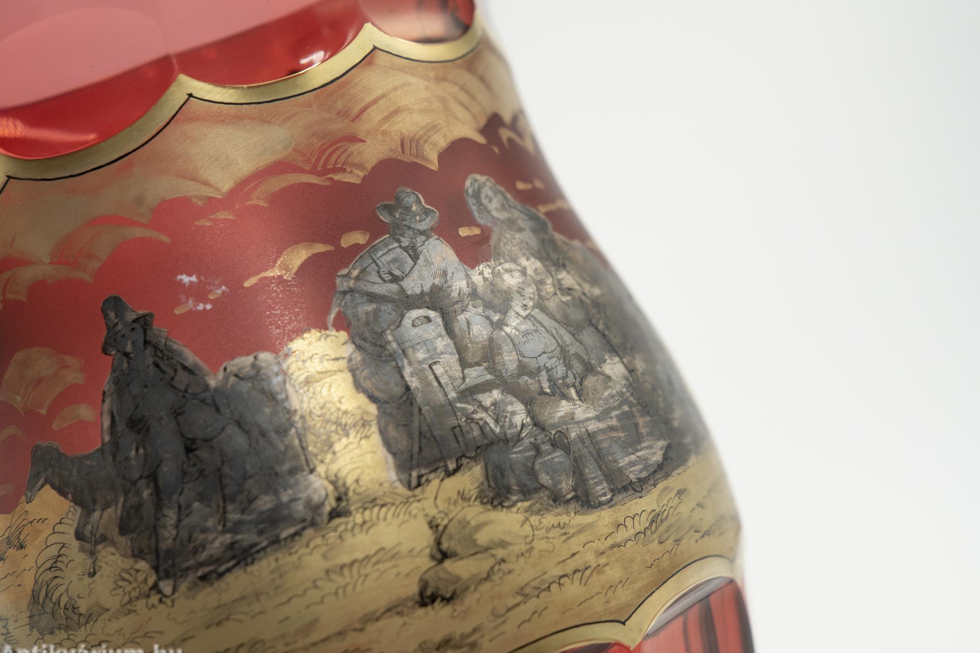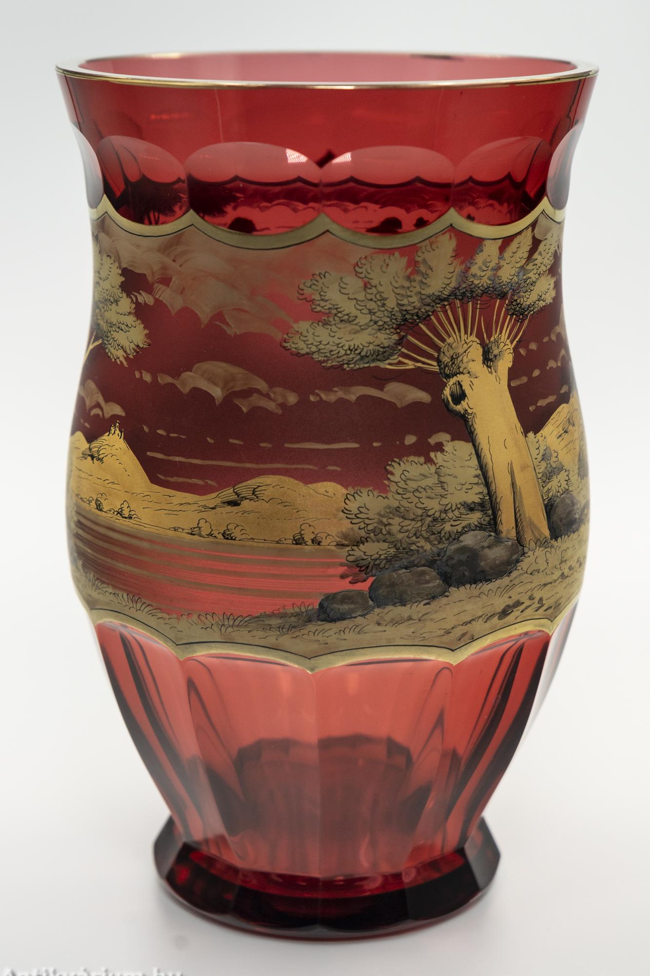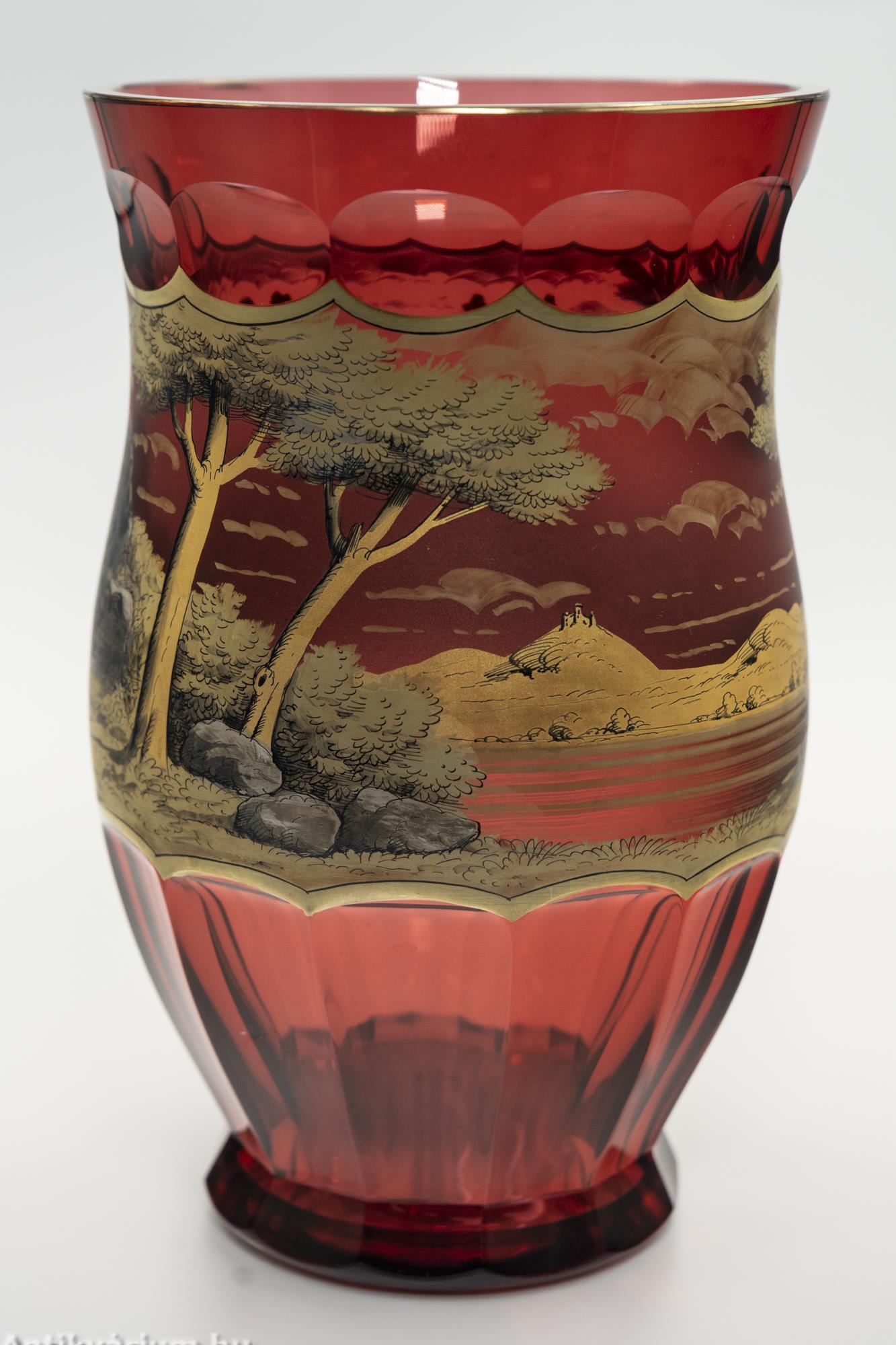 Hibátlan állapotú fújt és kézzel formázott rendkívül dekoratív üveg váza az Oertel Üveggyár (Haida) műhelyéből a 19. század végéről. Kézzel festett, mindkét oldalán arannyal díszített folyóparti tájban ábrázolt pásztorjelenet látható, amely körábra folytonos. Rózsaszínű üvegből készült. Gazdagon díszített és lapracsiszolt tagolással megmunkált impozáns üveg dísztárgy. Az Oertel & Co. céget Haidában, az észak-csehországi üvegipar központjában alapították 1869-ben, mint kristályüveg és ólomkristály feldolgozásával foglalkozó családi vállalkozást. A cég alapítója (Johannes Oertel) új üvegkikészítési technikákat keresett, és 1887-ben és 1889-ben számos módszert szabadalmaztatott üvegtárgyak színes díszítésének előállítására valamint üveg- és porcelántárgyak gyöngyházfényű díszítésének módszerére.