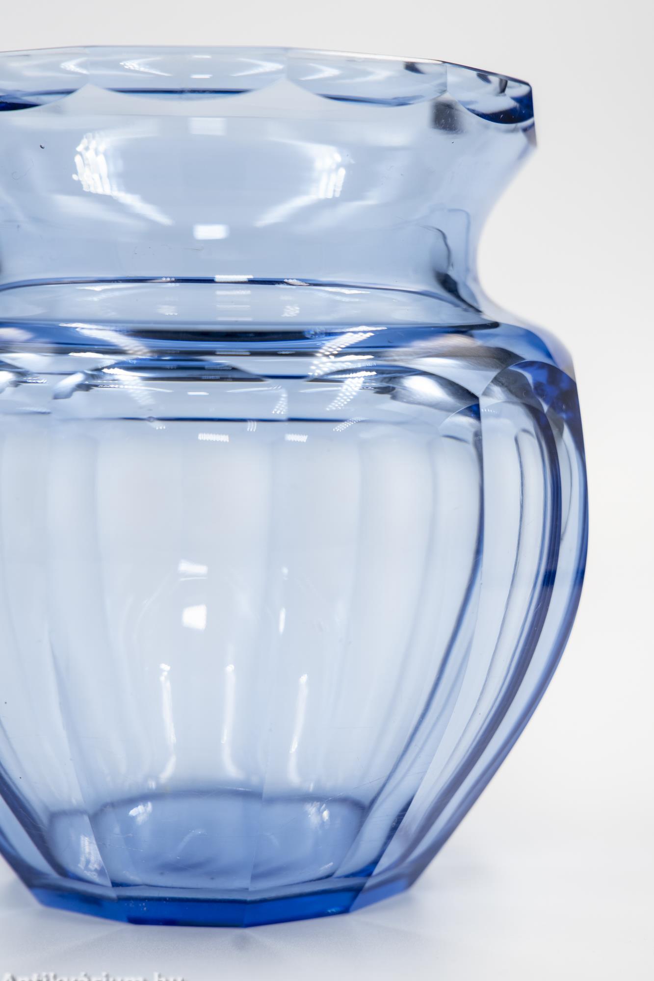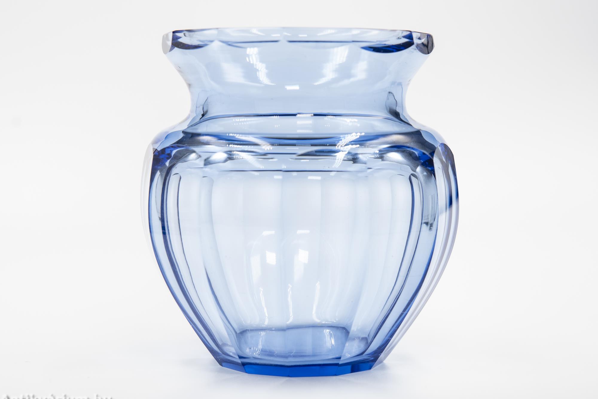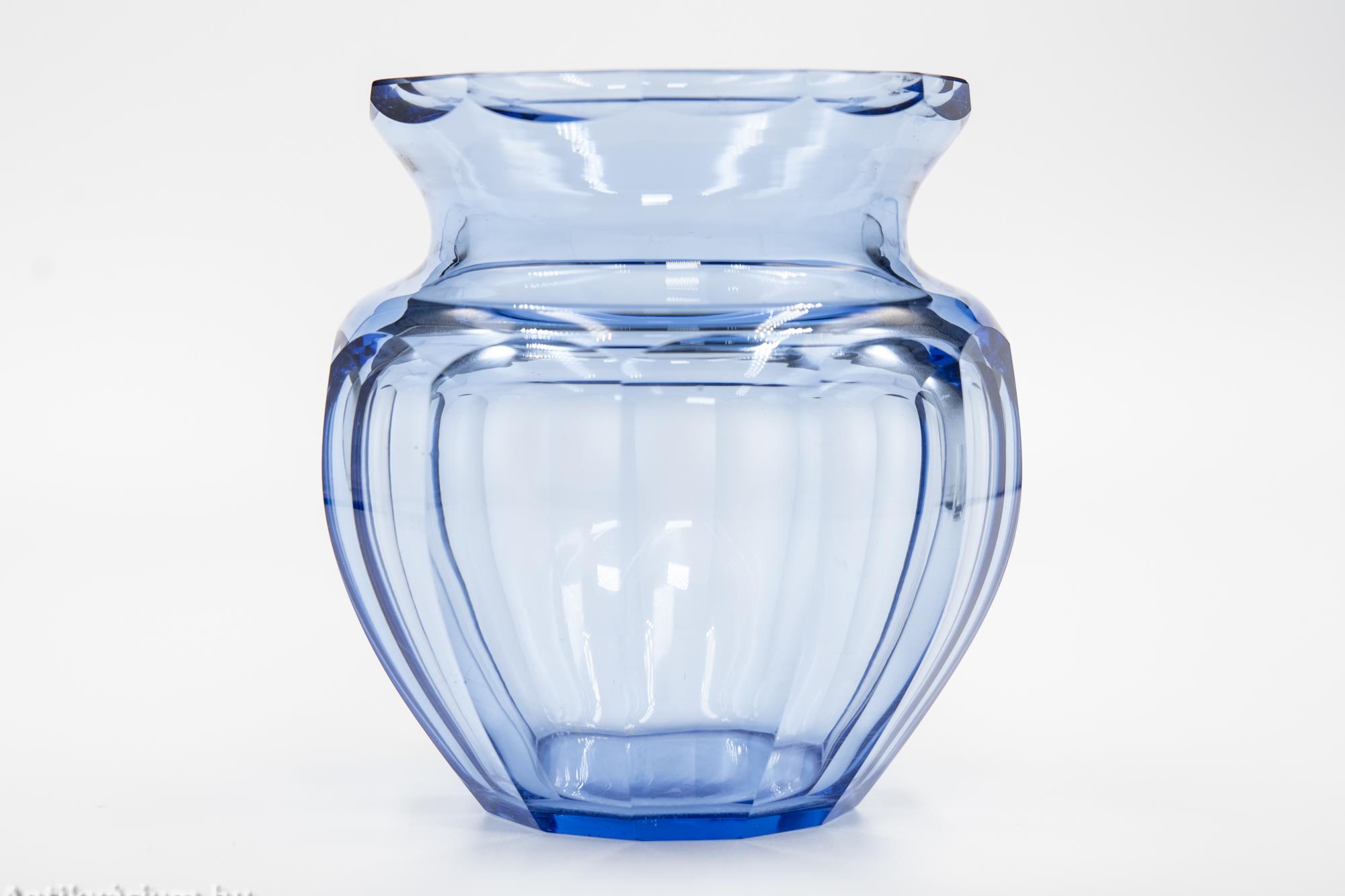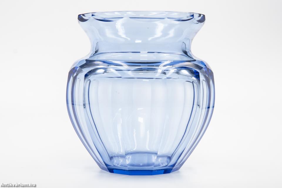 Hibátlan állapotú, fújt és kézzel formázott, valamint kézzel csiszolt art deco Moser üveg váza Josef Hoffmann tervei alapján. Vastagfalú, nagy súlyú, vízkék színű üvegből készült művészi üveg váza. Oldalát sík csiszolt laptagolás díszíti, amely geometriai formák alkalmazására épül. Talpa lapra csiszolt. A kor stílusát és a Moser csiszolás egyedi jellemzőit megjelenítő üveg váza az 1920-as években készült Karlsbadban (Karlovy Vary). A Moser üveggyárban az 1920-as években rendkívül gyümölcsöző együttműködés kezdődött Josef Hoffmann tervezővel (Pirnitz 1870–1956 Bécs, a Wiener Werkstatte társalapítója), amelynek során az uralkodó art deco esztétika jegyeit magán viselő elegáns üvegáruk készültek, kihangsúlyozva az egyenes, leegyszerűsített vonalvezetést és modern formát, valamint az erős, tiszta színvilág használatát. Mindezeket tökéletes kivitelezésben.