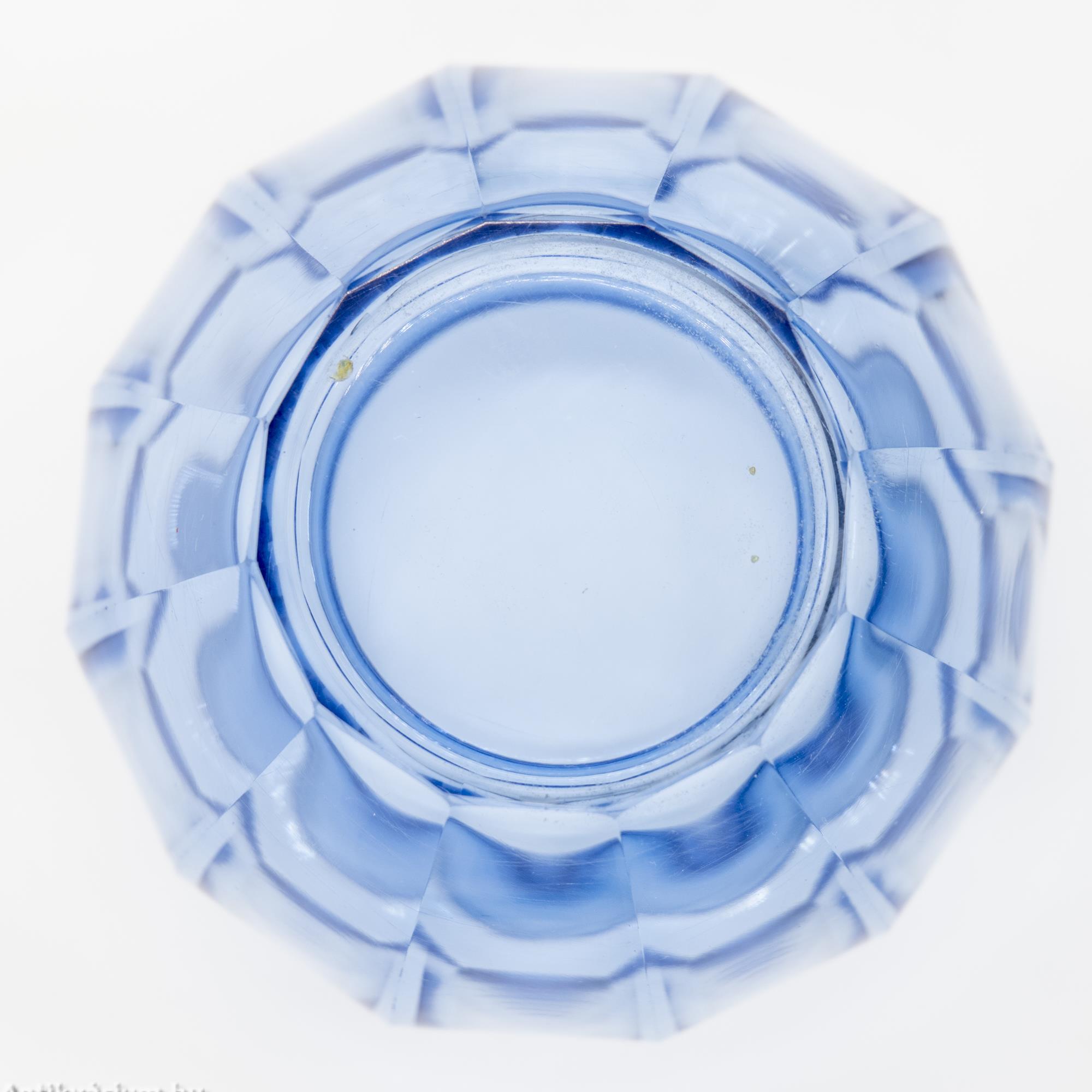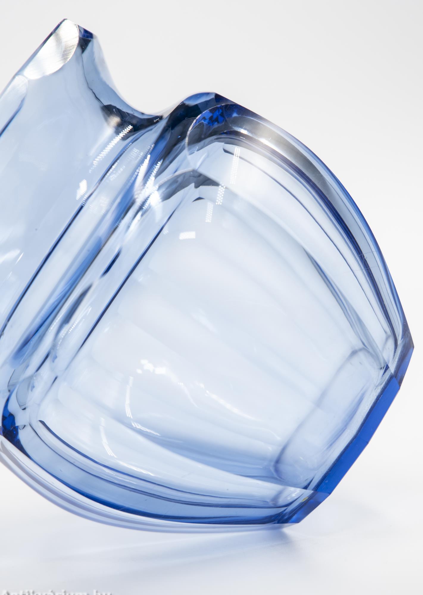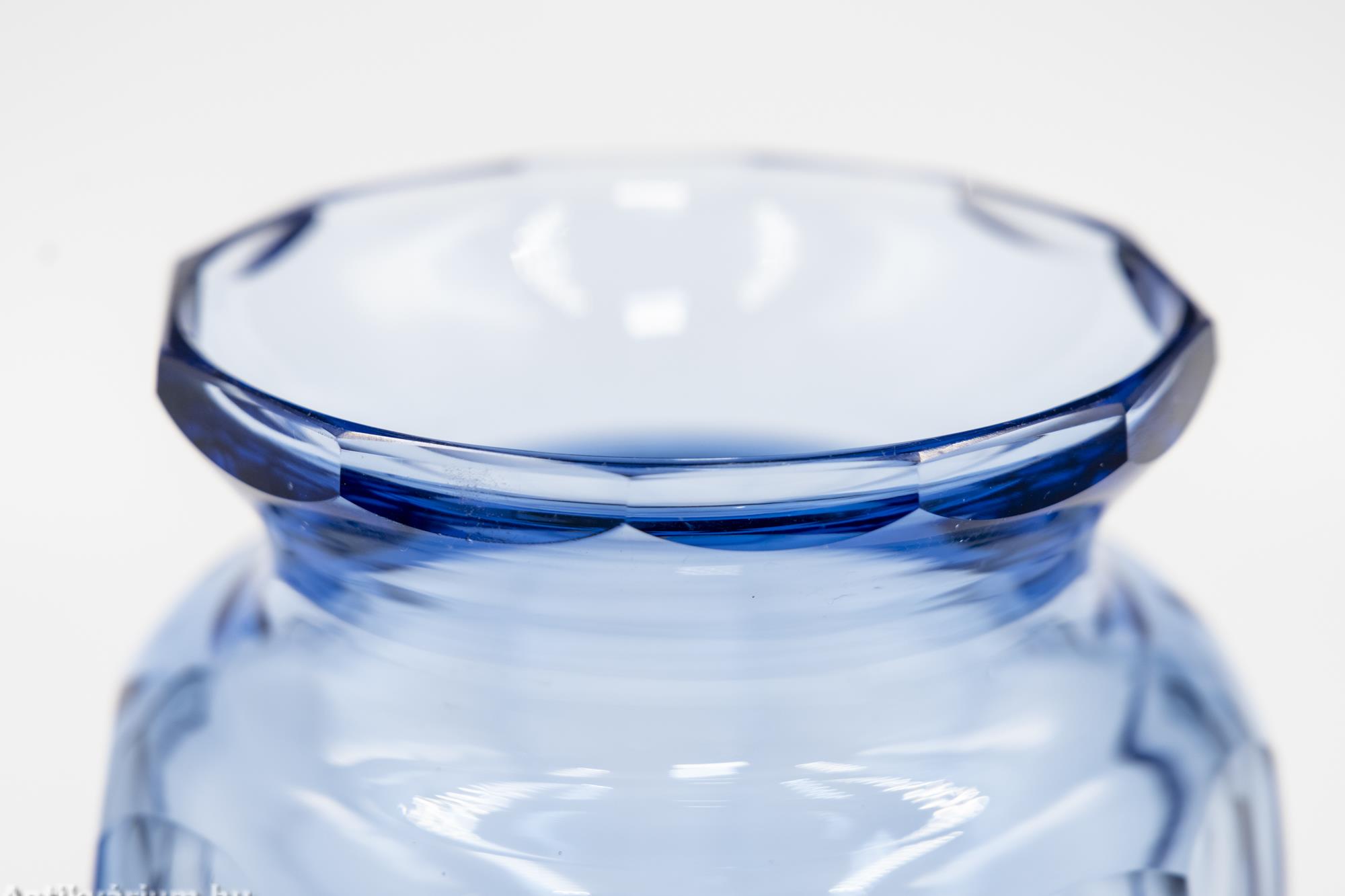 Hibátlan állapotú, fújt és kézzel formázott, valamint kézzel csiszolt art deco Moser üveg váza Josef Hoffmann tervei alapján. Vastagfalú, nagy súlyú, vízkék színű üvegből készült művészi üveg váza. Oldalát sík csiszolt laptagolás díszíti, amely geometriai formák alkalmazására épül. Talpa lapra csiszolt. A kor stílusát és a Moser csiszolás egyedi jellemzőit megjelenítő üveg váza az 1920-as években készült Karlsbadban (Karlovy Vary). A Moser üveggyárban az 1920-as években rendkívül gyümölcsöző együttműködés kezdődött Josef Hoffmann tervezővel (Pirnitz 1870–1956 Bécs, a Wiener Werkstatte társalapítója), amelynek során az uralkodó art deco esztétika jegyeit magán viselő elegáns üvegáruk készültek, kihangsúlyozva az egyenes, leegyszerűsített vonalvezetést és modern formát, valamint az erős, tiszta színvilág használatát. Mindezeket tökéletes kivitelezésben.