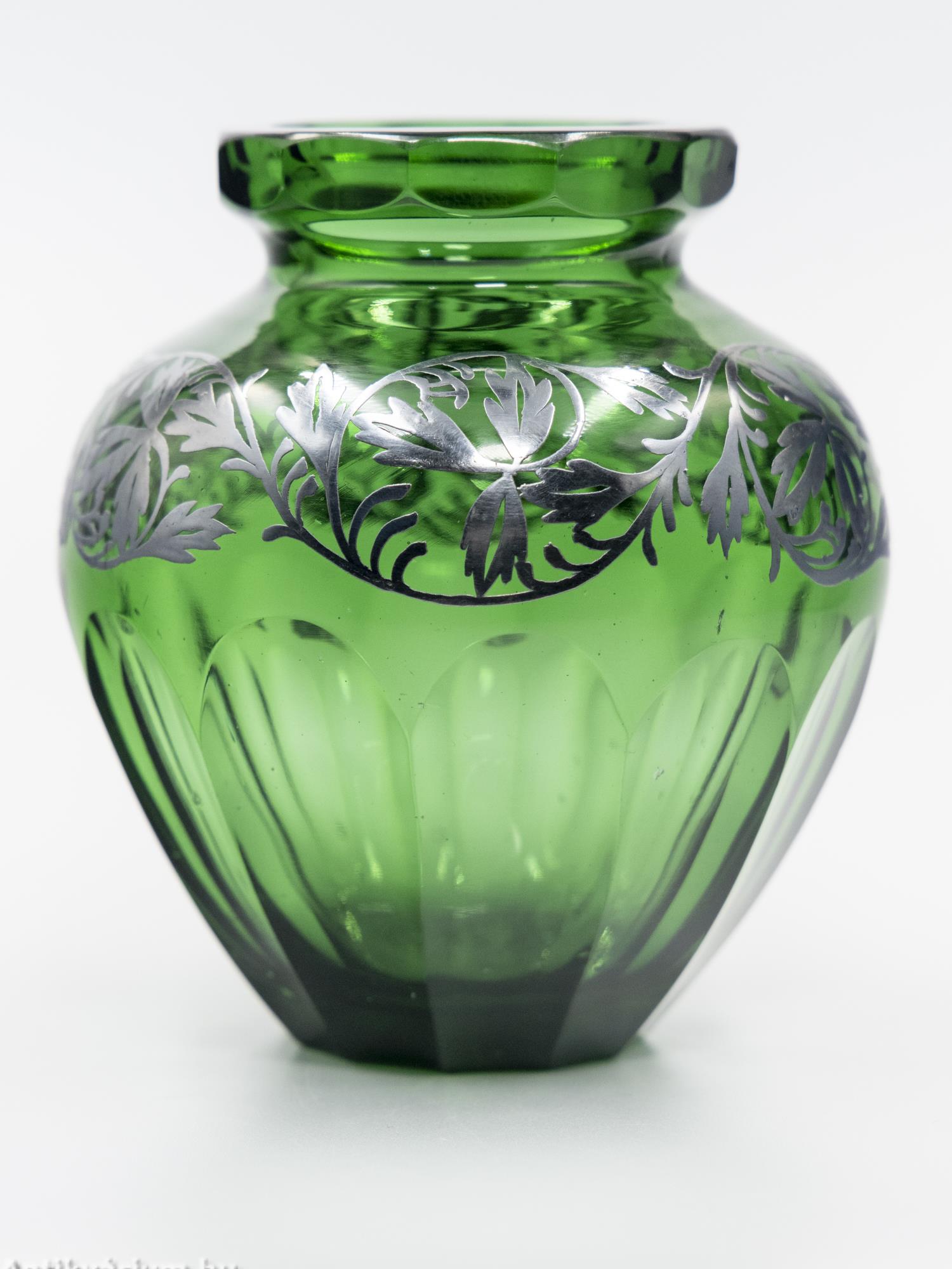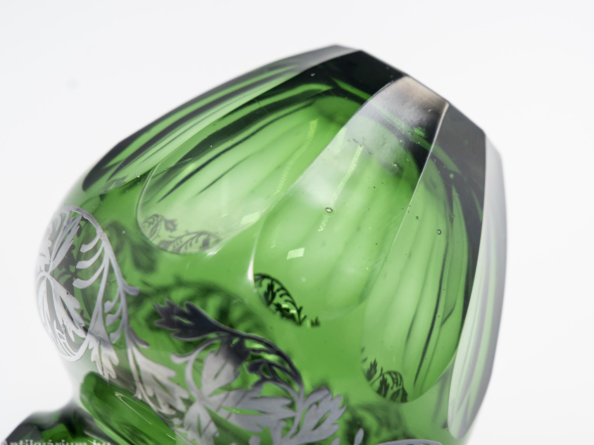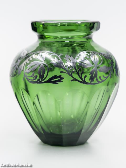 Hibátlan állapotú, fújt és kézzel formázott art deco smaragdzöld Moser üveg váza a 20. század első feléből. Vastag falú, hámozott, anyagában színezett, kiváló állapotú üveg váza, felső részén ezüst lemezből formára vágott applikációval díszített, amely részletgazdagon kidolgozott füzérszerű növény ornamentikát jelenít meg. A váza alsó része és pereme ovális formában simára csiszolt. Talpa lapra csiszolt.