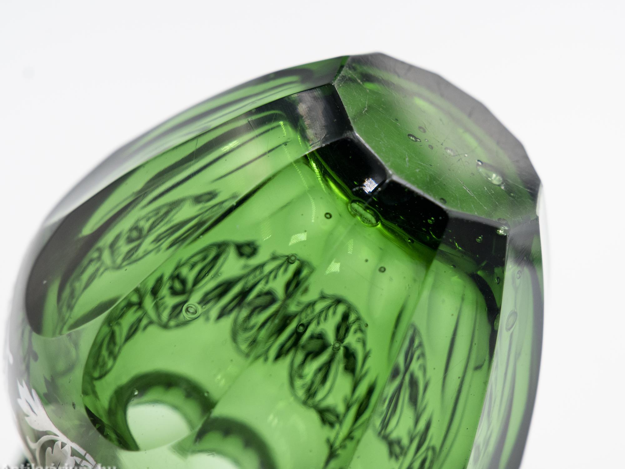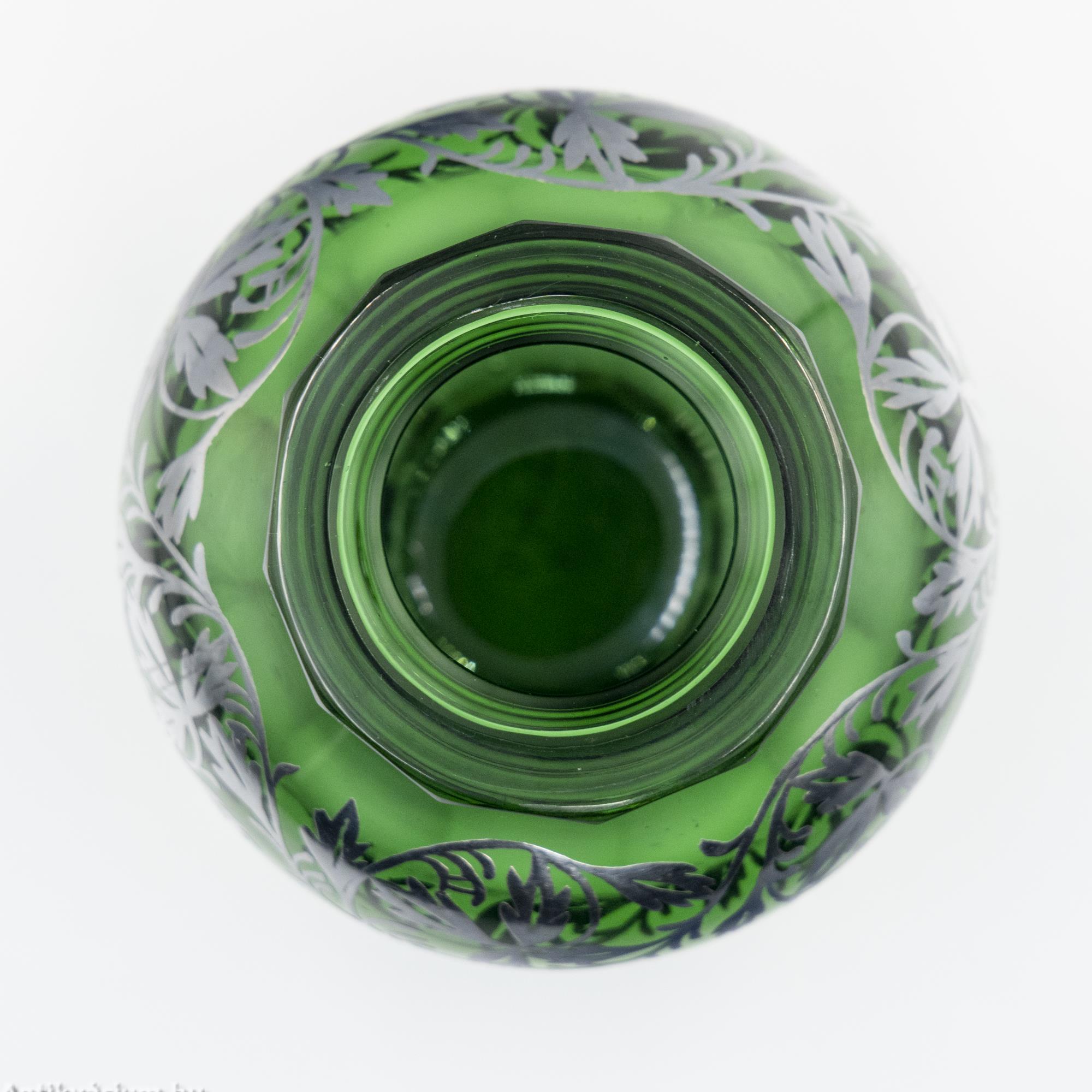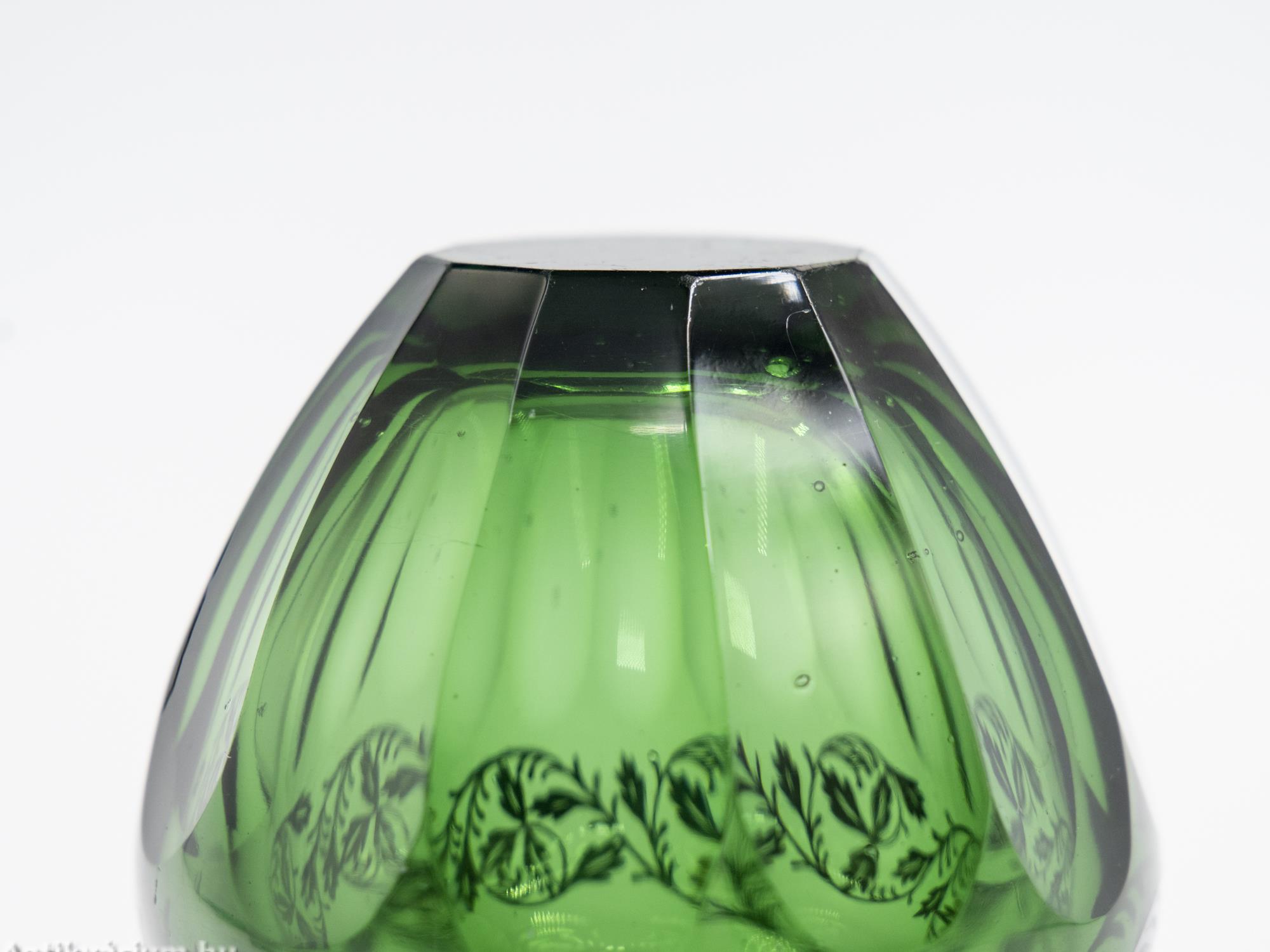 Hibátlan állapotú, fújt és kézzel formázott art deco smaragdzöld Moser üveg váza a 20. század első feléből. Vastag falú, hámozott, anyagában színezett, kiváló állapotú üveg váza, felső részén ezüst lemezből formára vágott applikációval díszített, amely részletgazdagon kidolgozott füzérszerű növény ornamentikát jelenít meg. A váza alsó része és pereme ovális formában simára csiszolt. Talpa lapra csiszolt.