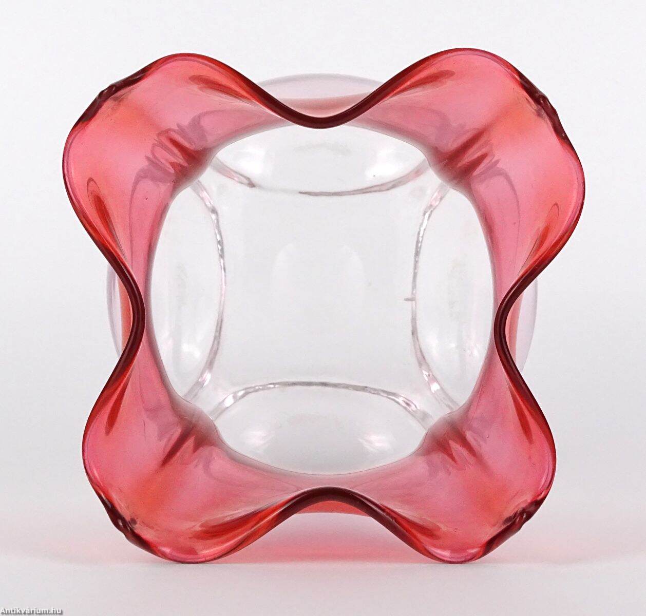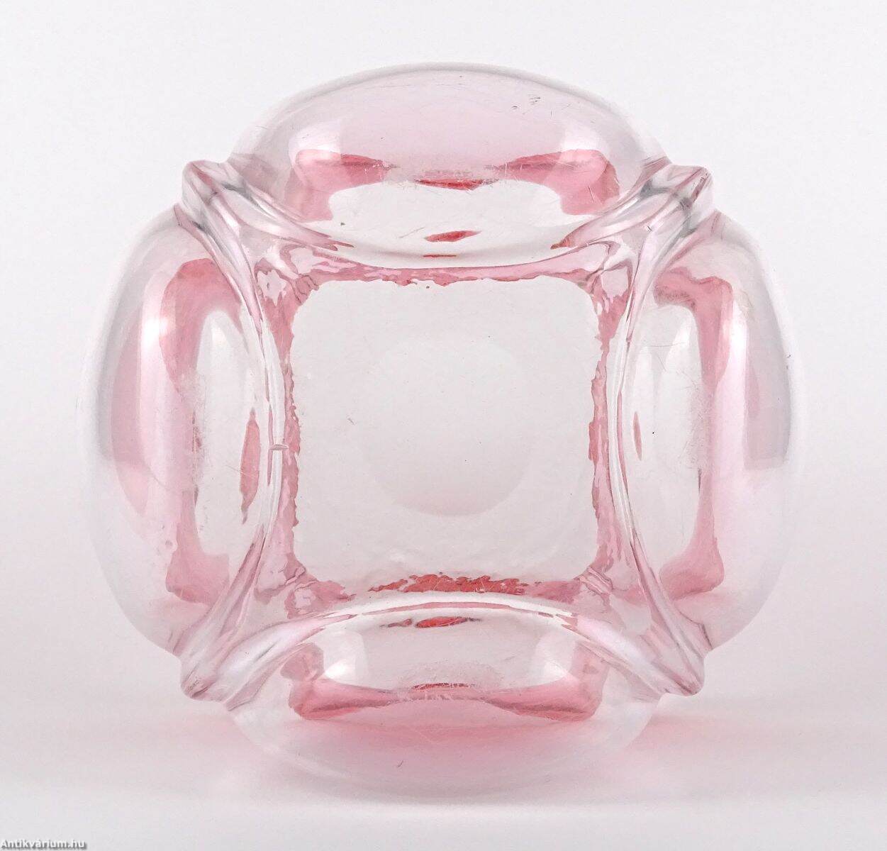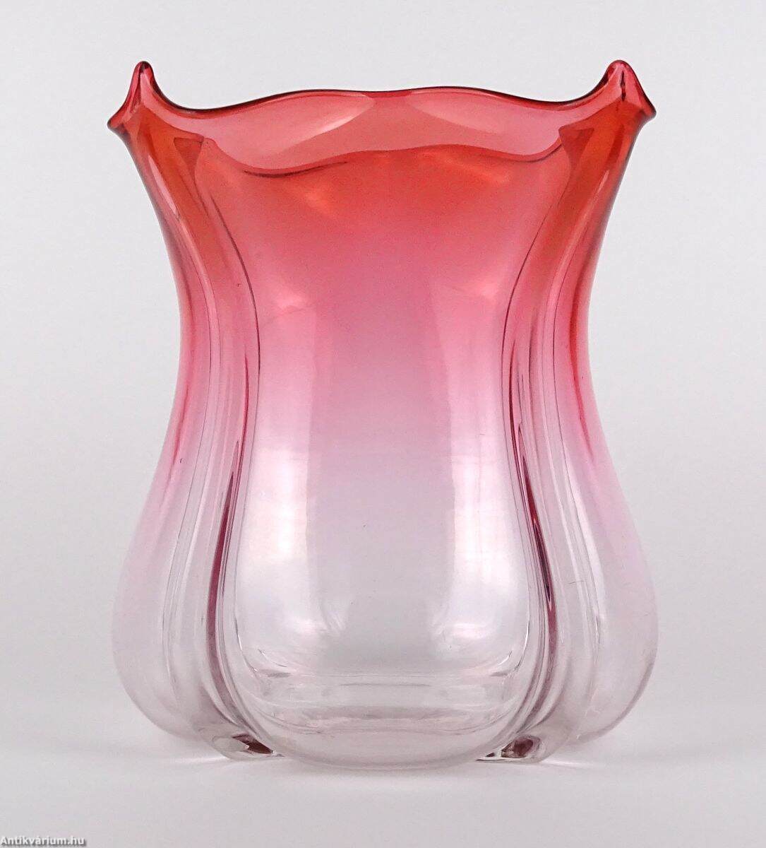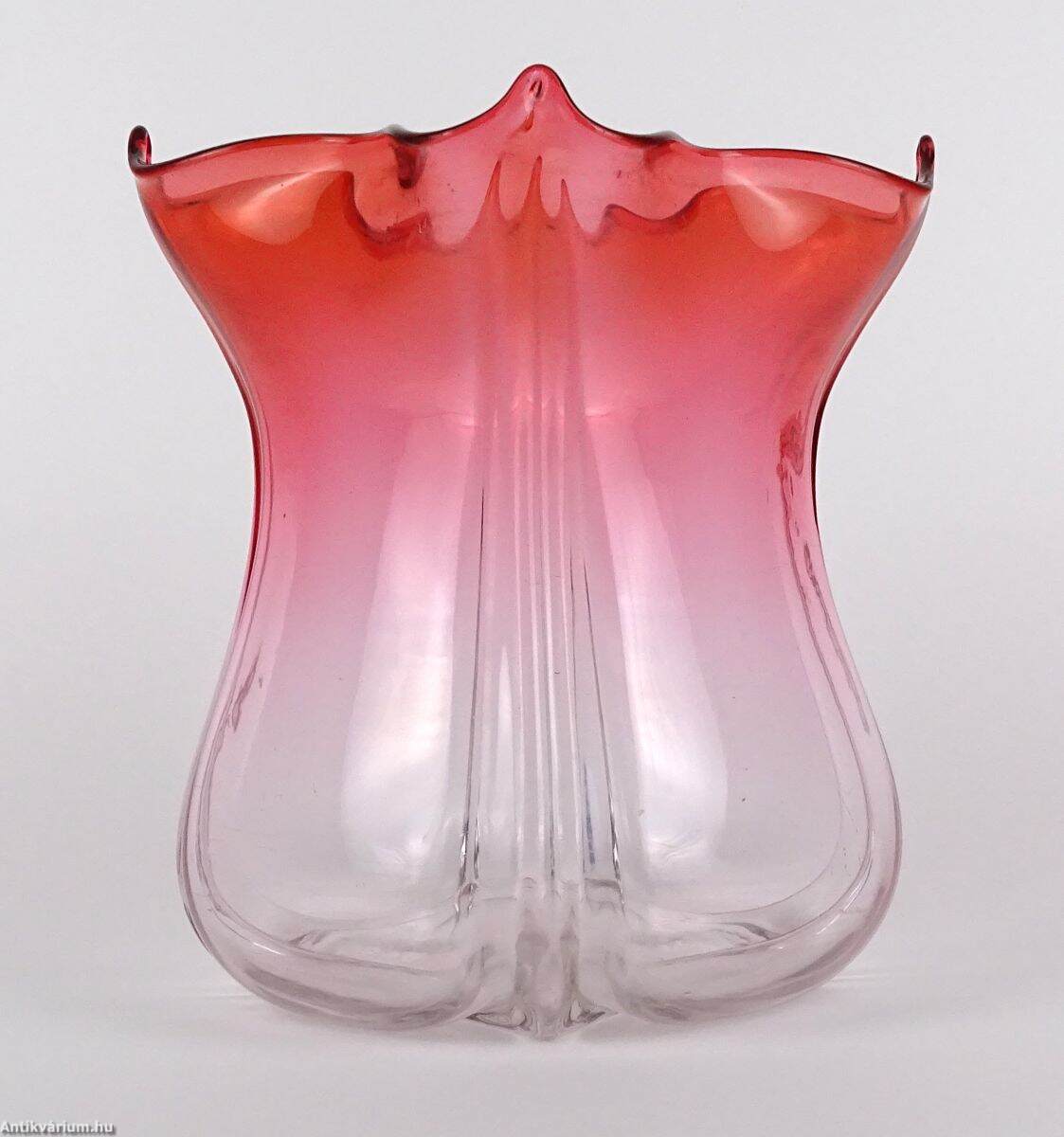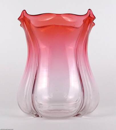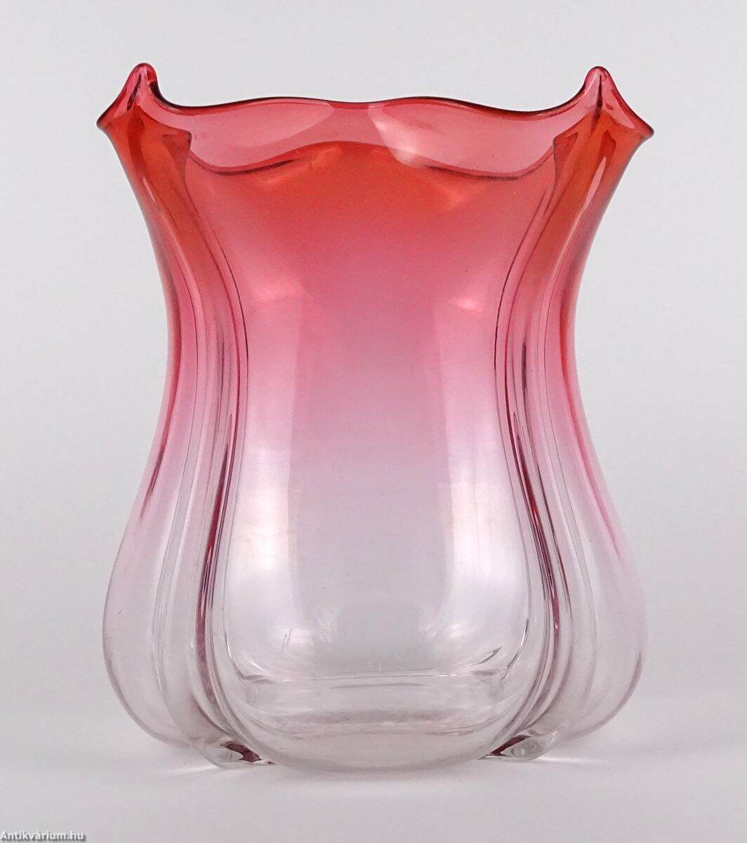Hibátlan állapotú, fújt és kézzel formázott szecessziós, rózsaszín - piros színátmenetes üveg váza, amely a 20 század elején készült. A talpán a csiszolás helye ( köldök ) körkörösen kicsiszolva. Oldala osztott, fölső részén finoman ívelt hajlítások láthatóak. Tervezője Frederick Carder, készült a Steuben Üvegmanufaktúrában, 1900 - 1930 között. A Steuben Glass egy amerikai műüveggyártó cég, amelyet 1903 nyarán Frederick Carder és Thomas G. Hawkes alapított a New York állambeli Corningben , amely Steuben megyében található , ahonnan a cégnév is származik. Frederick Carder (1863–1963) üvegkészítő, üvegtervező és üvegművész volt, aki Angliában és az Egyesült Államokban egyaránt az üvegiparban tevékenykedett, nevezetesen a Stevens & Williamsnél , illetve a Steubennél. A formákkal és színekkel végzett kísérleteiről ismert Carder munkái népszerűek a gyűjtők körében és számos múzeumi gyűjteményben megtalálhatók, köztük a Corning Museum of Glass-ben.
