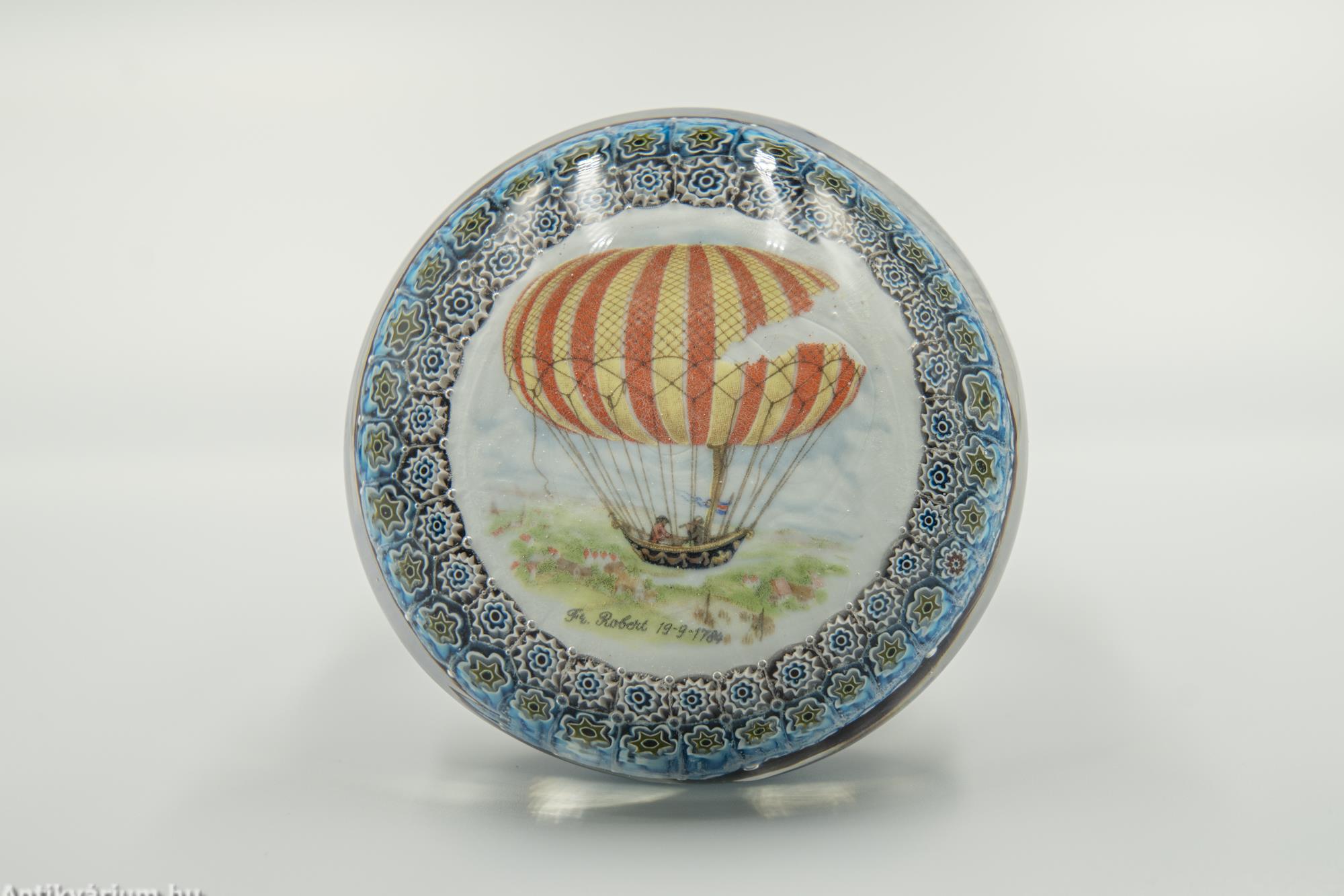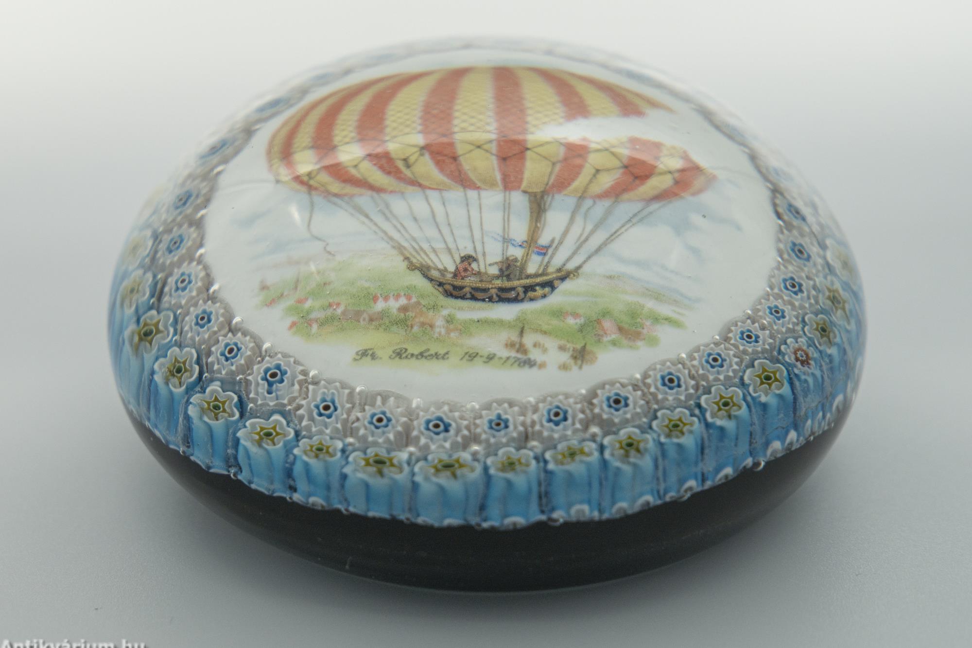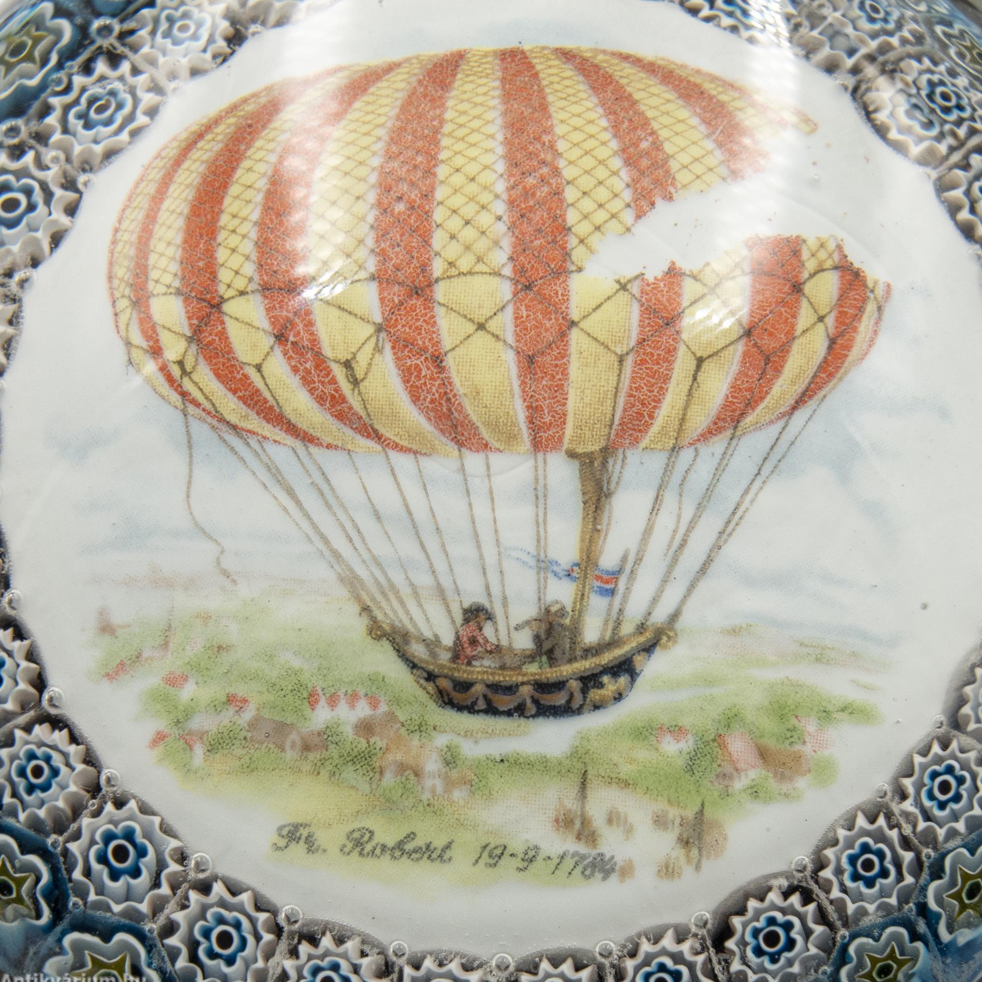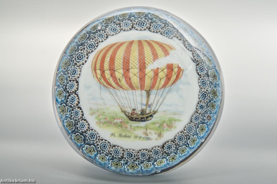 Hibátlan állapotú "Millefiori" (ezervirág) technikával készült levélnehezék, amelyben egy légballon ábrázolás látható. Alatta felirat és évszám olvasható, amely a légballonozásnak állít emléket. Készítésének ideje a 20. század második fele. Az ábrázolás mellett körben, két sorban "Millefiori" technikával készített virágornamentika látható. Talprésze lapra csiszolt. A millefiori üvegtípusa mozaik üvegáru, amelyet virágszerű mintázat jellemez. Úgy állítják elő, hogy először egy köteg vékony, különböző színű üvegrudat hevítenek addig, amíg a rudak összeolvadnak. A köteget vékonyra húzzák, lehűtik és keresztmetszetben felszeletelik, így kis, virágszerű mintázatú korongokat kapnak. Ezeket a korongokat melegen fújt üvegtárgyakra, például vázára vagy tálra helyezik, majd felmelegítik és másodszor is fújják. Az eredményül kapott termék egy ragyogó színű üvegáru bonyolult, fakulásálló díszítőmintával.