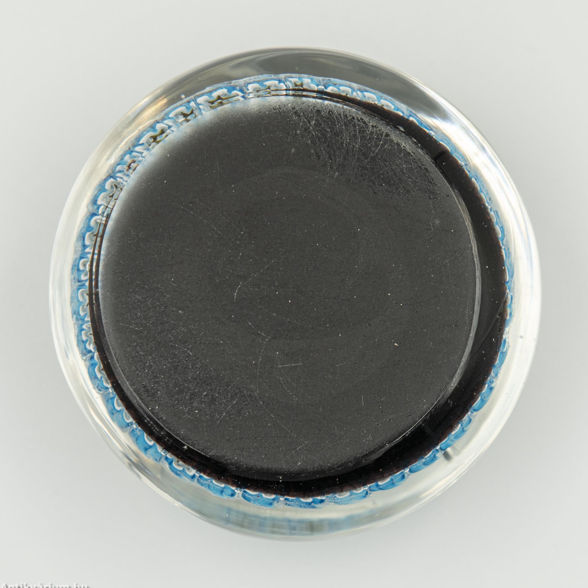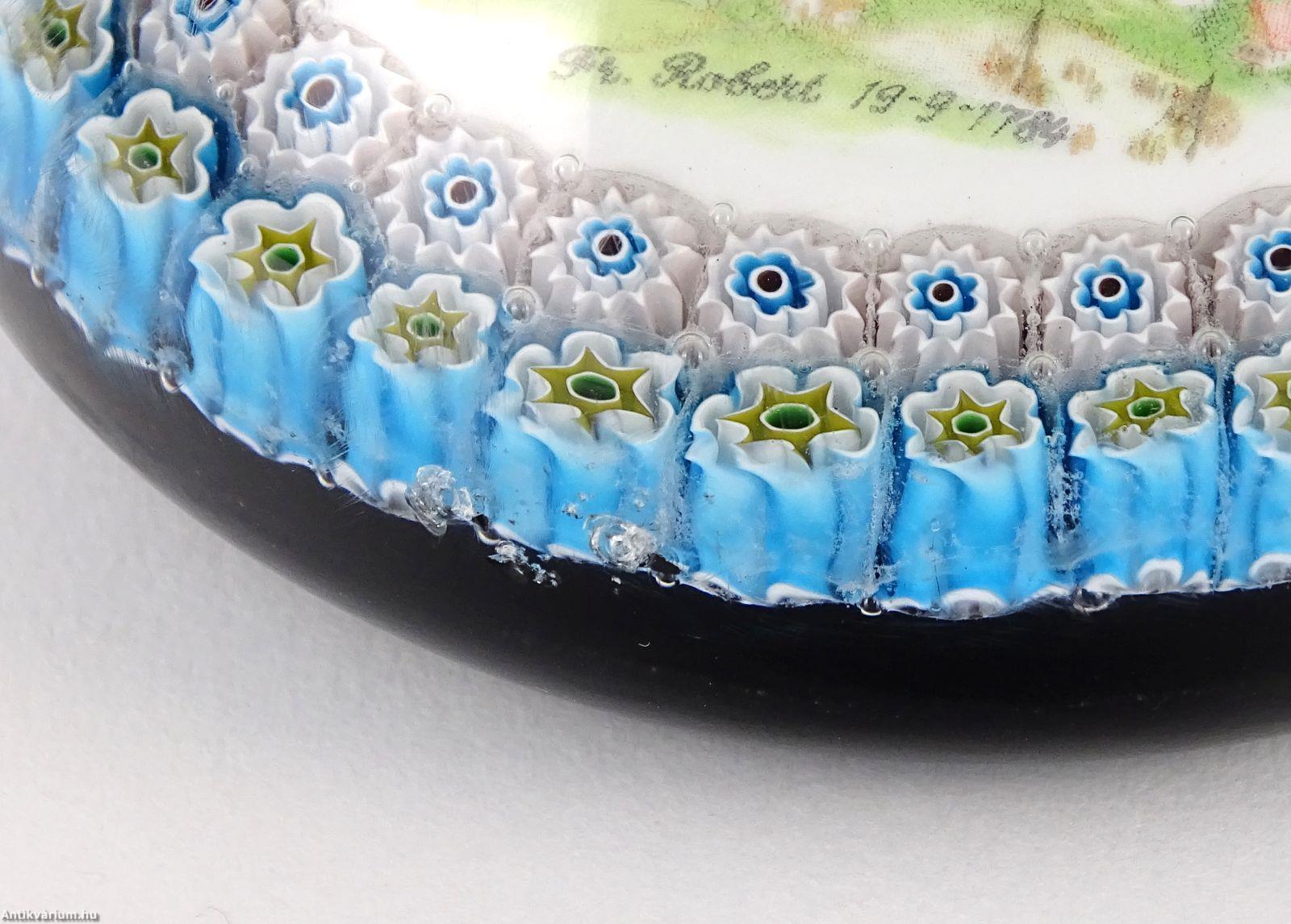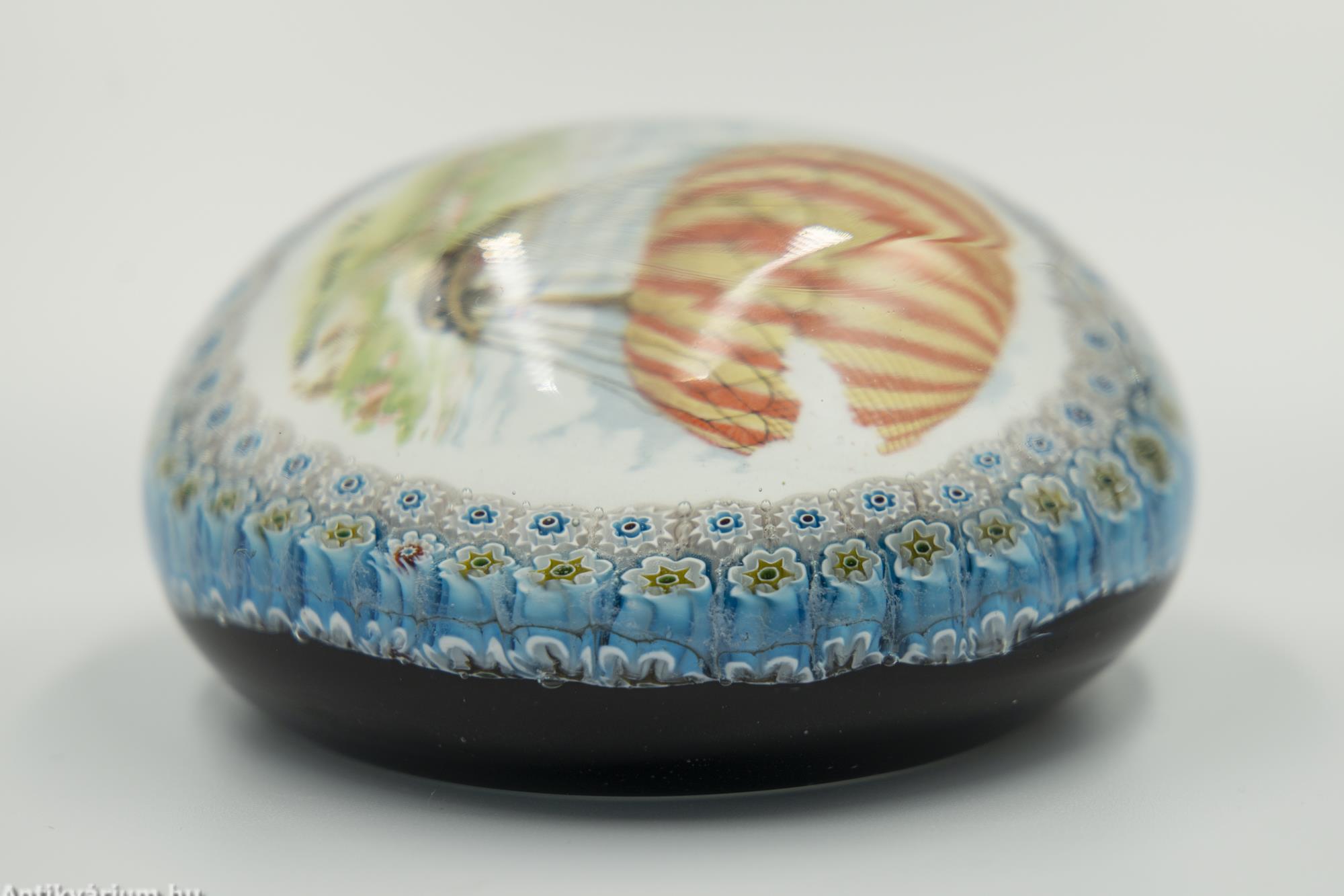Hibátlan állapotú "Millefiori" (ezervirág) technikával készült levélnehezék, amelyben egy légballon ábrázolás látható. Alatta felirat és évszám olvasható, amely a légballonozásnak állít emléket. Készítésének ideje a 20. század második fele. Az ábrázolás mellett körben, két sorban "Millefiori" technikával készített virágornamentika látható. Talprésze lapra csiszolt. A millefiori üvegtípusa mozaik üvegáru, amelyet virágszerű mintázat jellemez. Úgy állítják elő, hogy először egy köteg vékony, különböző színű üvegrudat hevítenek addig, amíg a rudak összeolvadnak. A köteget vékonyra húzzák, lehűtik és keresztmetszetben felszeletelik, így kis, virágszerű mintázatú korongokat kapnak. Ezeket a korongokat melegen fújt üvegtárgyakra, például vázára vagy tálra helyezik, majd felmelegítik és másodszor is fújják. Az eredményül kapott termék egy ragyogó színű üvegáru bonyolult, fakulásálló díszítőmintával.