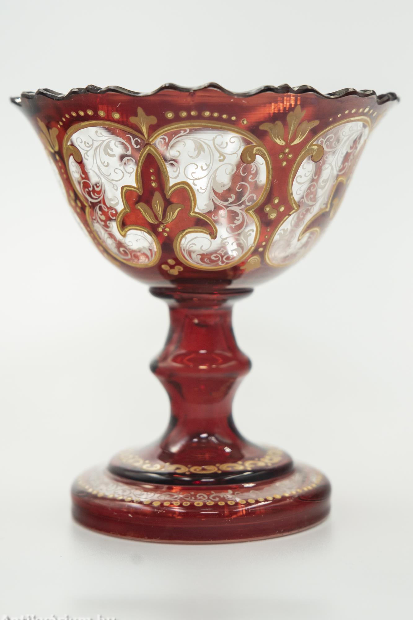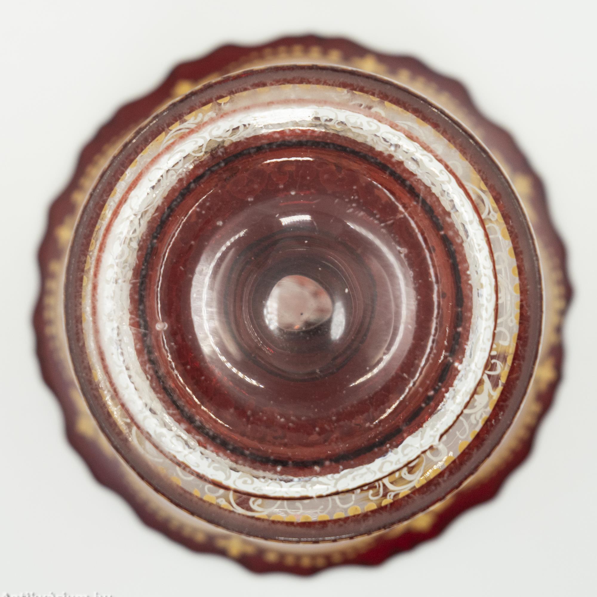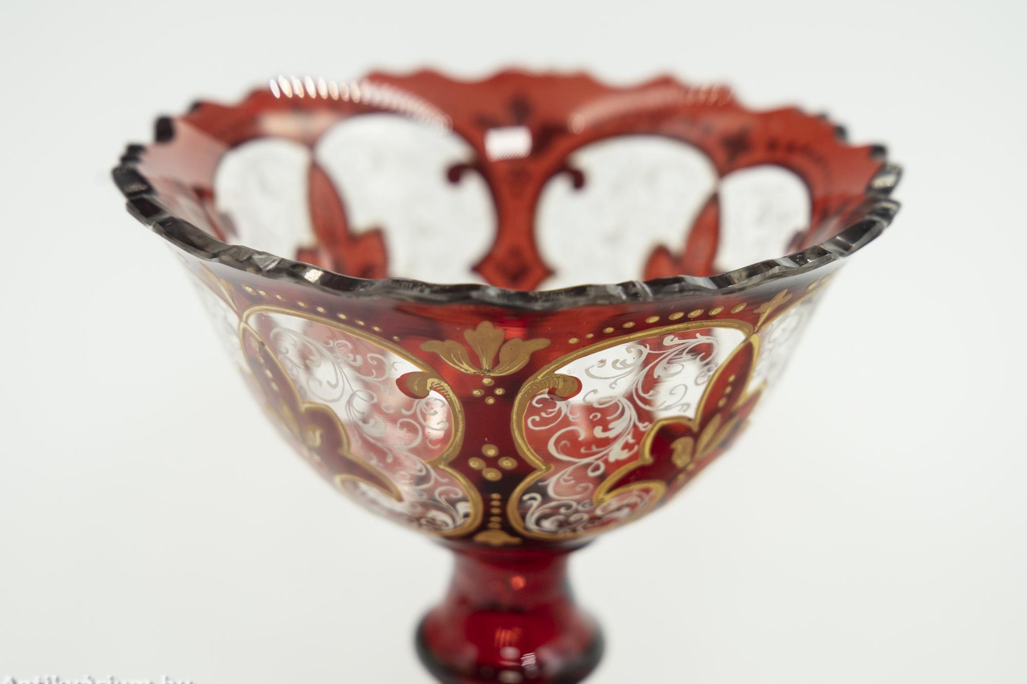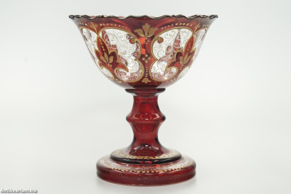 Hibátlan állapotú, fújt és kézzel formázott bordó parádi biedermeier üveg kehely a 19. század közepéről. A többtagolású formai megjelenését a kézzel festett arany színű festés teszi igazán korra jellemző dísztárggyá. A teljes felületen megjelenő gazdag virágmotívum és növényornamentika festés a biedermeier tárgyak látványos díszei voltak. Hazai és történeti értéke miatt különösen becses számunkra ez a magyar üveg dísztárgy.