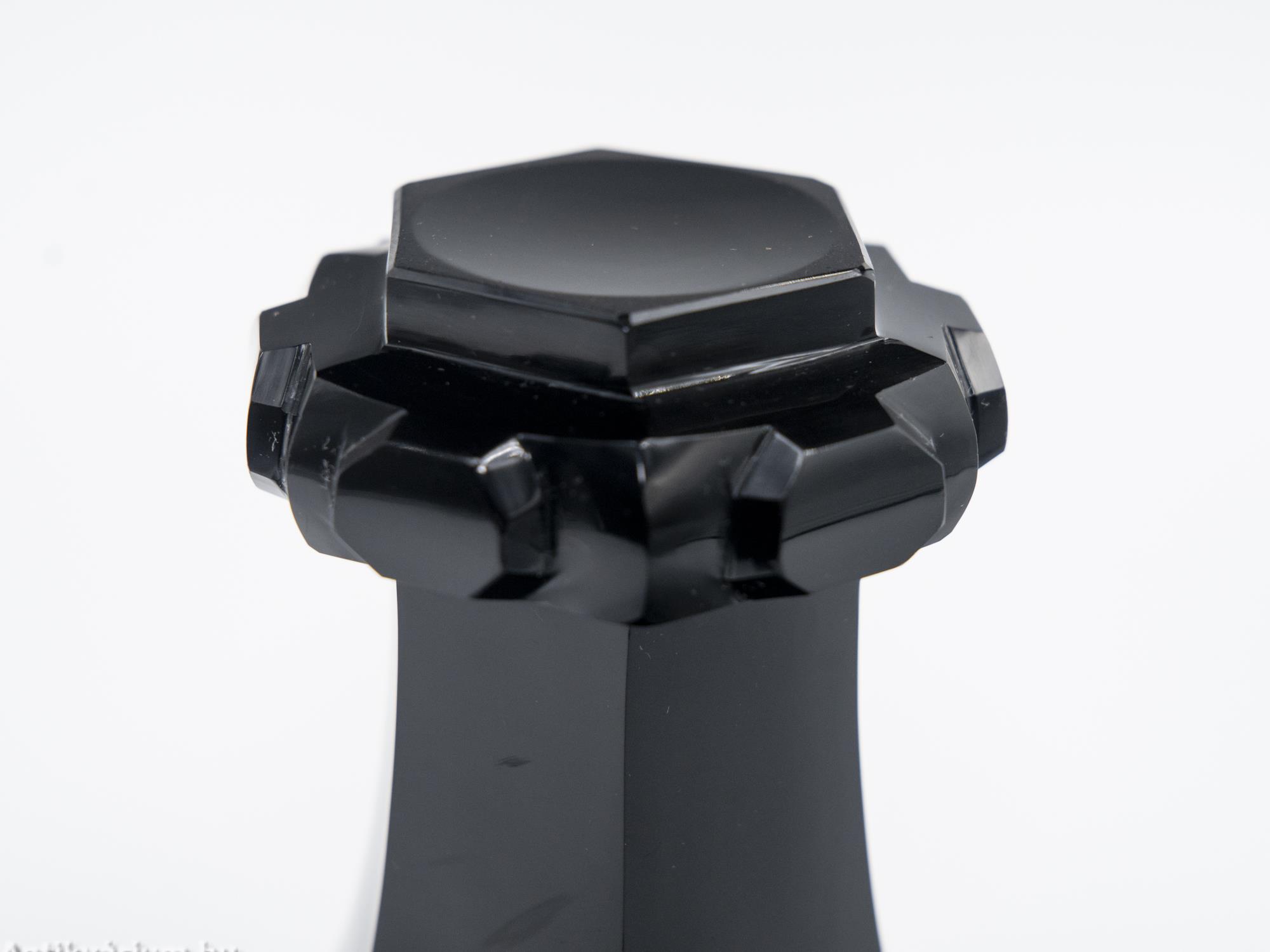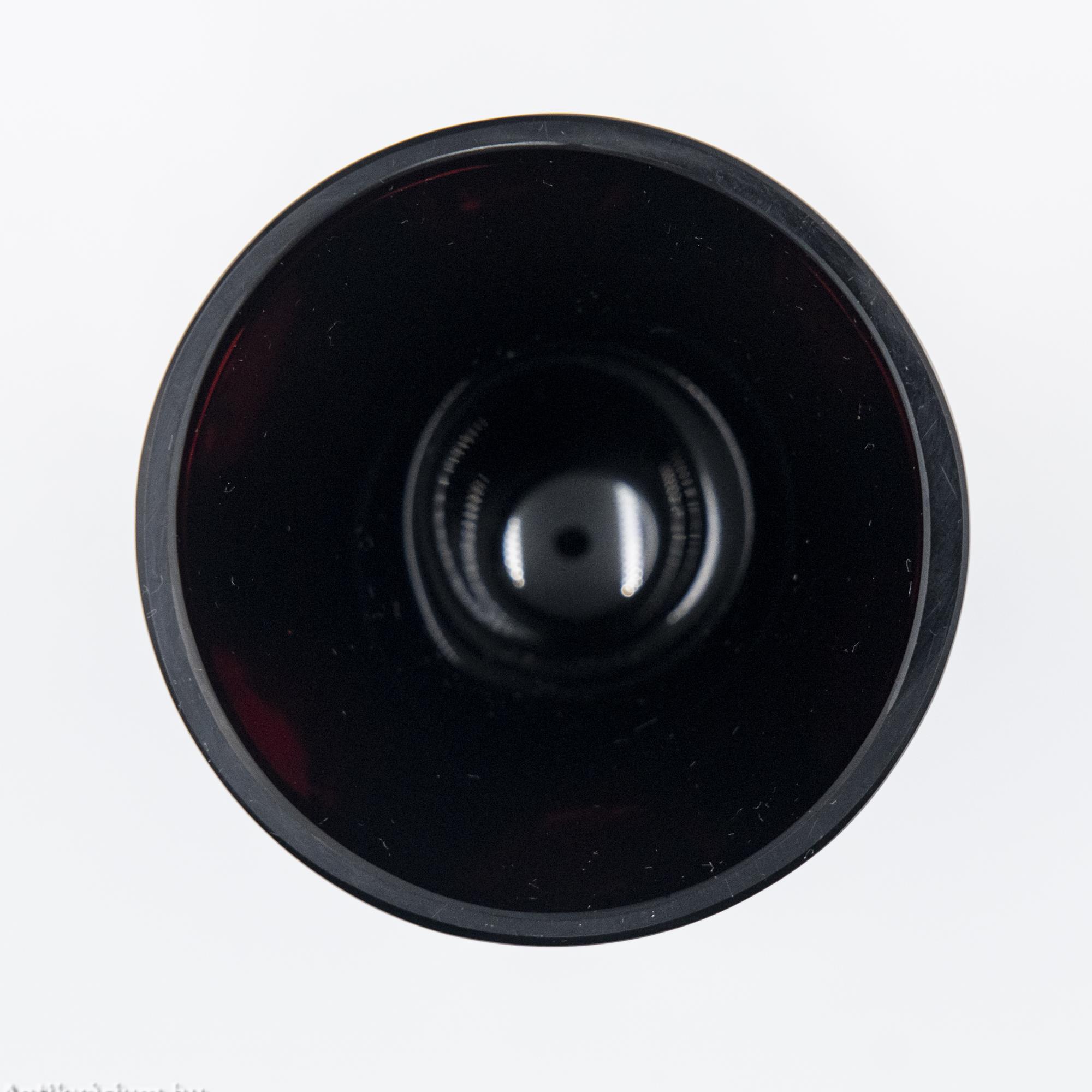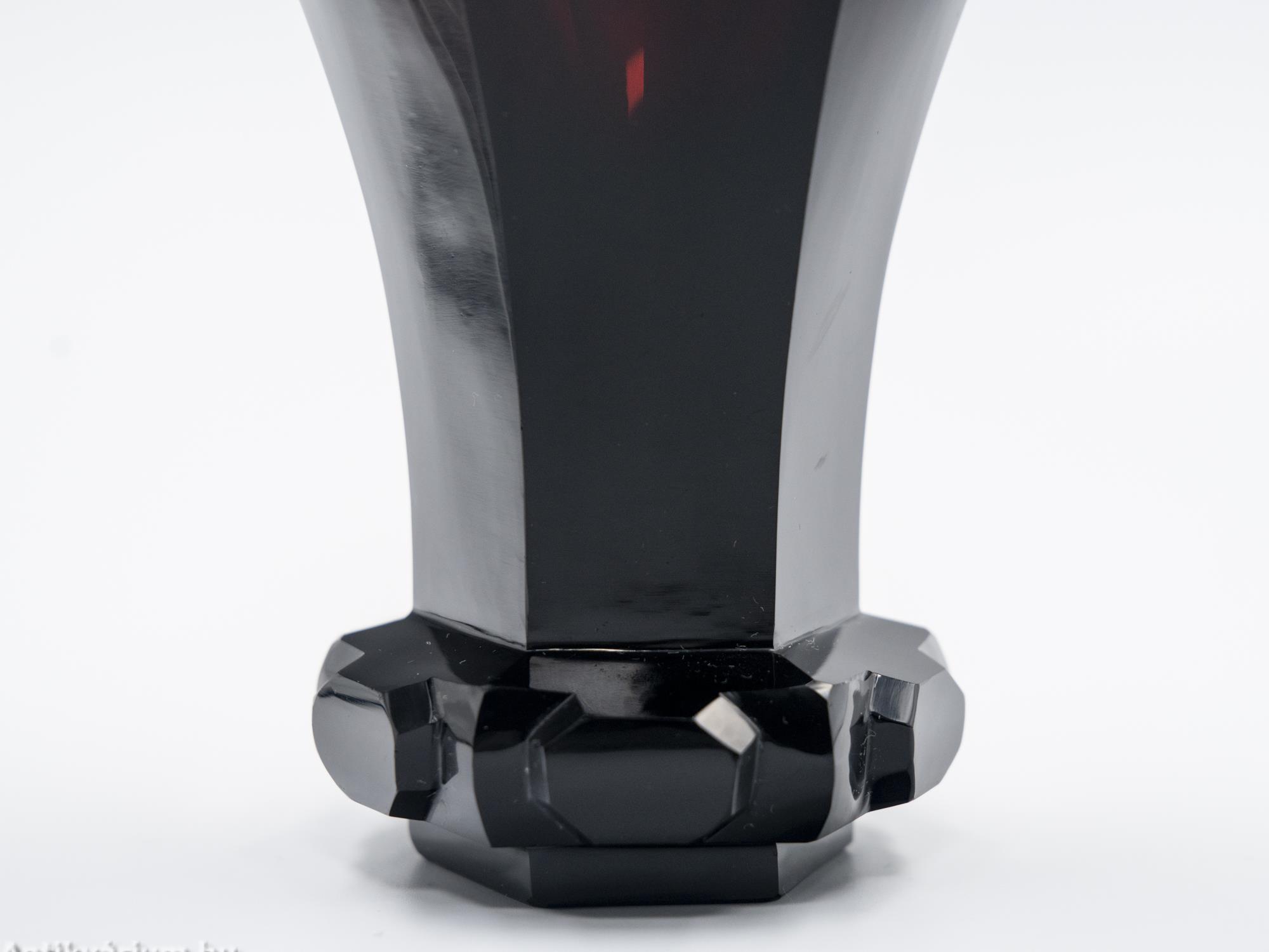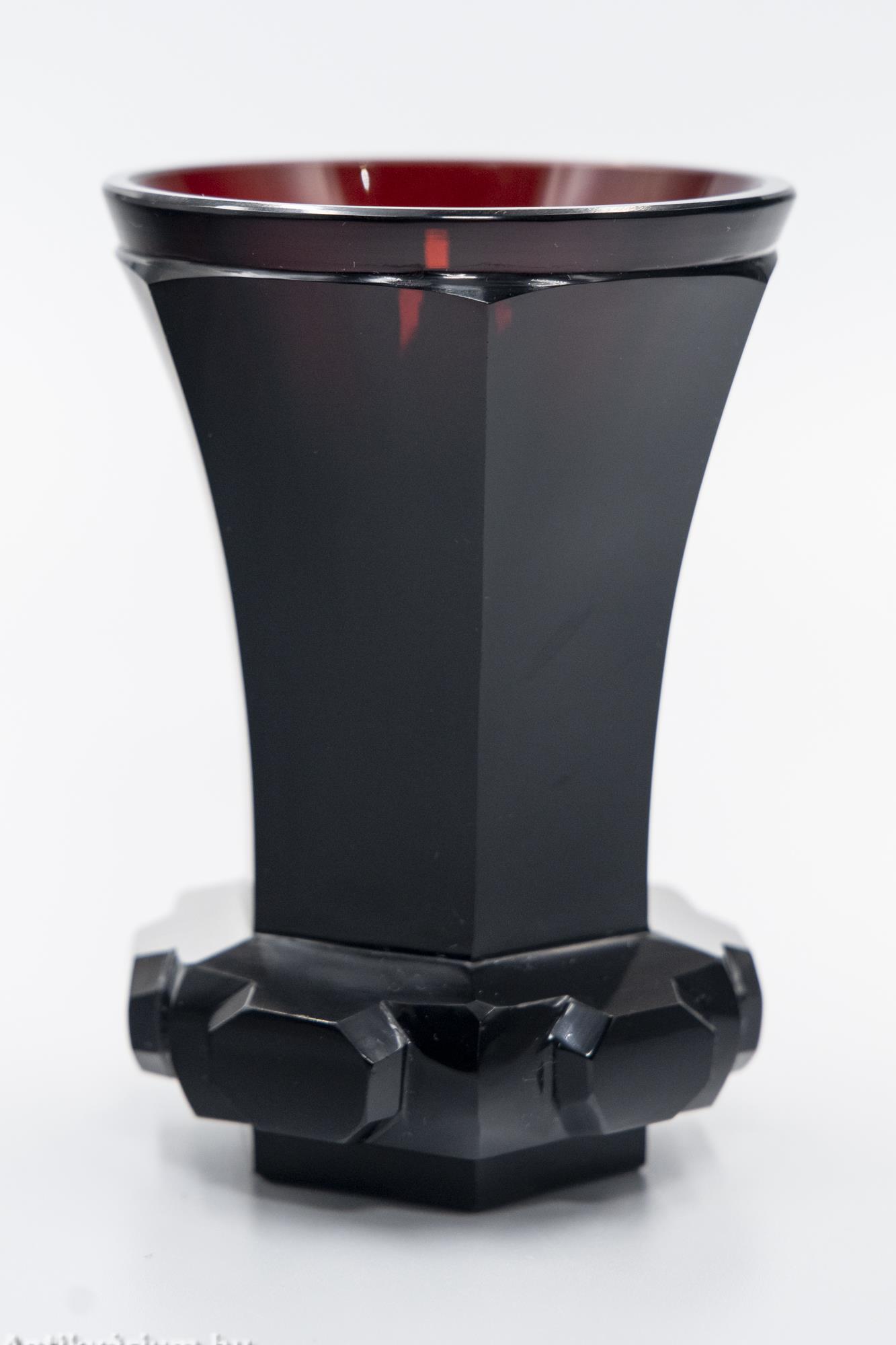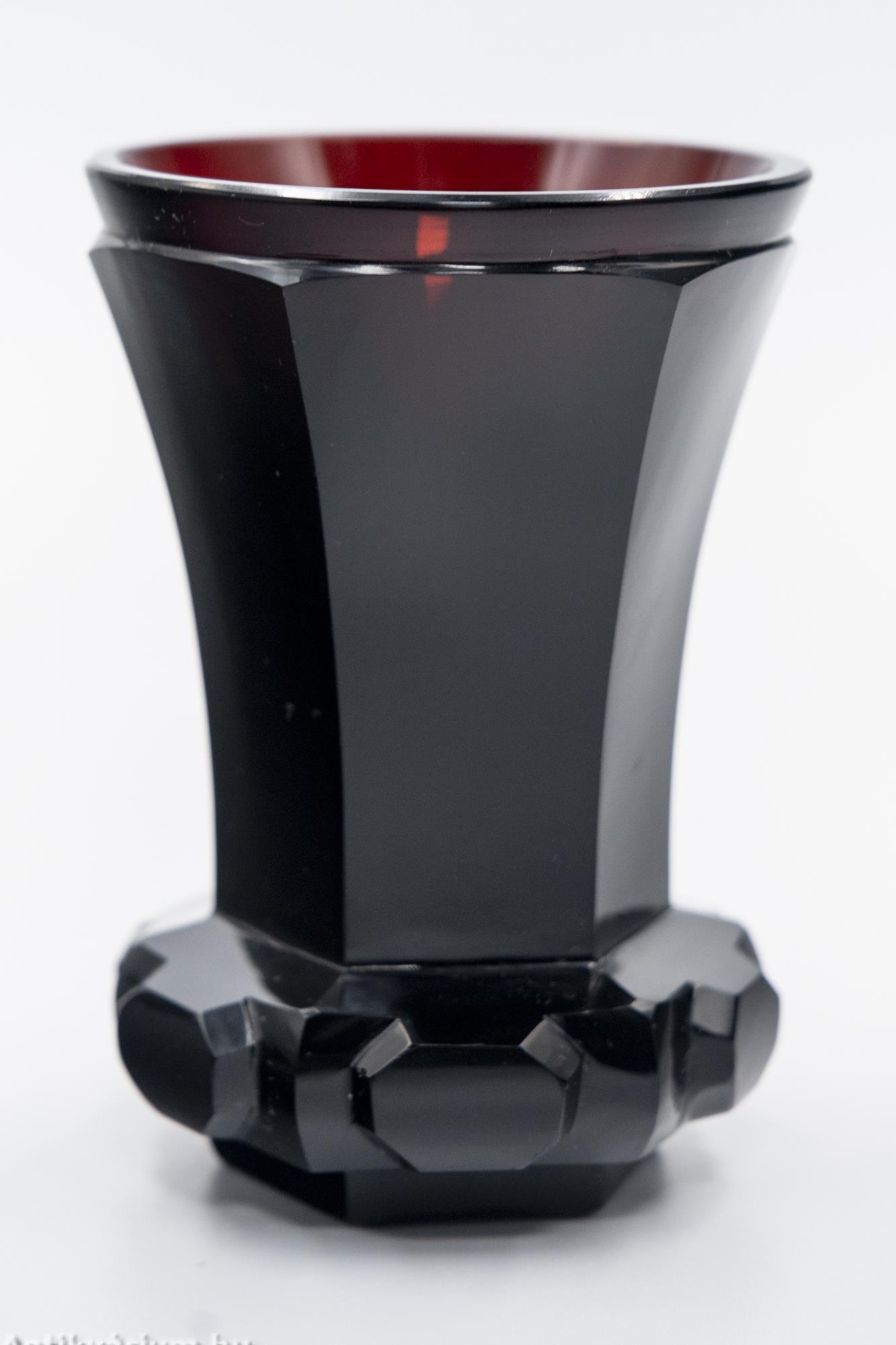 Hibátlan állapotú, fújt és kézzel formázott, az Egermann Üvegmanufaktúrában készített biedermeier rubin talpas üveg pohár a 19. század első feléből. Alsó részét erősen domború, geometriai formájú csiszolás díszíti, felső része lapra csiszolt felületű, hat osztásos tagoltságát az üveg poháron végigfutó összes csiszolás követi. Elegáns darab, amely különleges megjelenésével illeszkedhet be egy hasonló korú pohárgyűjteménybe. A biedermeier korszak idején (1820-1860) a csiszolt, vésett, gazdagon megmunkált vastagfalú kristálypoharak, néha festéssel és aranyozással is díszítve nagy sikert arattak. A biedermeier enteriőrök látványos díszei voltak a tarka, változatos emlékpoharak, palackos fürdőkúra ivókészletek. Az Egermann üvegáru a mai napig a hagyományos cseh technikával készül. Minden váza egyedi termék Friedrich Egermann nagymester hagyományai szerint, fújt és kézzel formázott, kézi festéssel és visszacsiszolással. Az Egermann Vállalat kézzel díszített üvegekre specializálódott, amelyek mindegyike dekoratív és erősen művészet-orientált karaktert kölcsönöz. Egermann fő hírneve az, hogy 1832-ben feltalálta a „vörös festésnek” nevezett eljárást, melynek során az egyes darabok felületén a sötét rubinvörös színezést barokk minták díszítik vágási és gravírozási eljárásokkal. Az Egermann a "vörös festési" eljárás világelső gyártója.