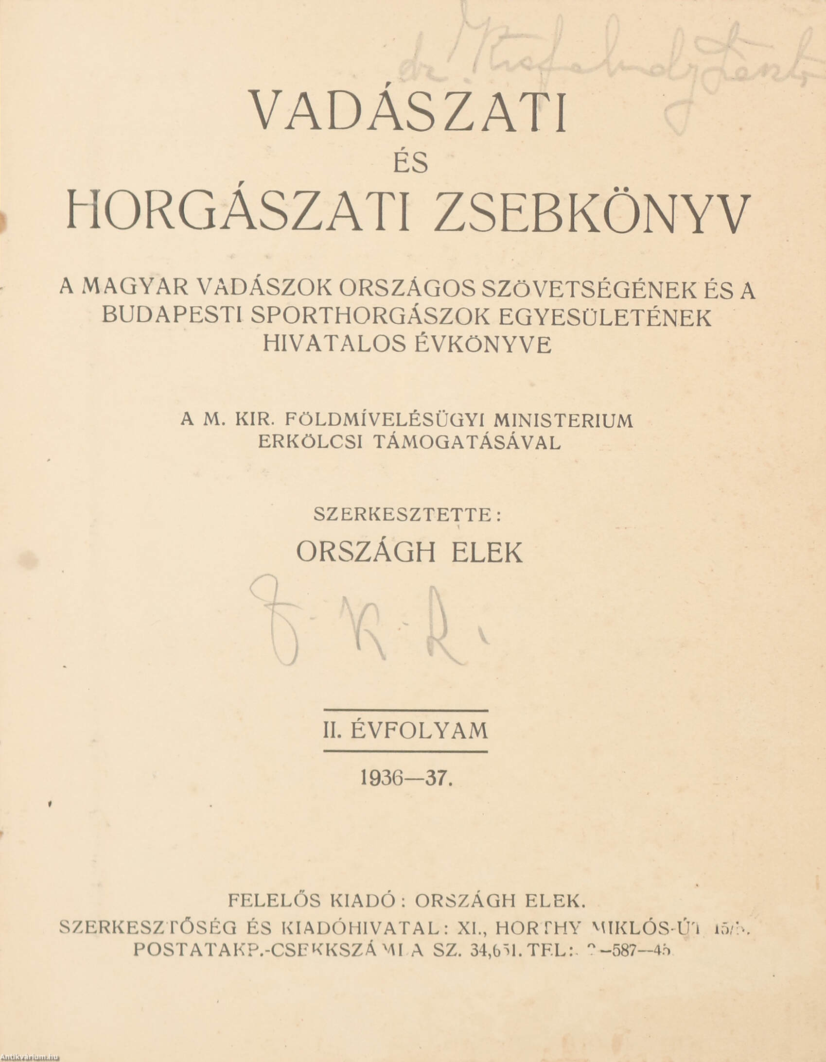 Vadászati és horgászati zsebkönyv. II. évfolyam. 1936-1937. A Magyar Vadászok Országos Szövetségének és a Budapesti Sporthorgászok Egyesületének Hivatalos Évkönyve. Szerkesztette: Országh Elek.