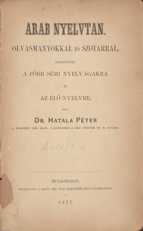 Első kiadás. Arab nyelvtan olvasmányokkal és szótárral, tekintettel a főbb sémi nyelvágakra és az elő nyelvre. Írta: Dr. Hatala Péter a Budapesti Kir. Magy. T.-egyetemen a sémi nyelvek ny. r. tanára.