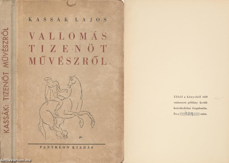 Első, számozott, bibliofil kiadás. Vallomások tizenöt művészről. Írta: Kassák Lajos.