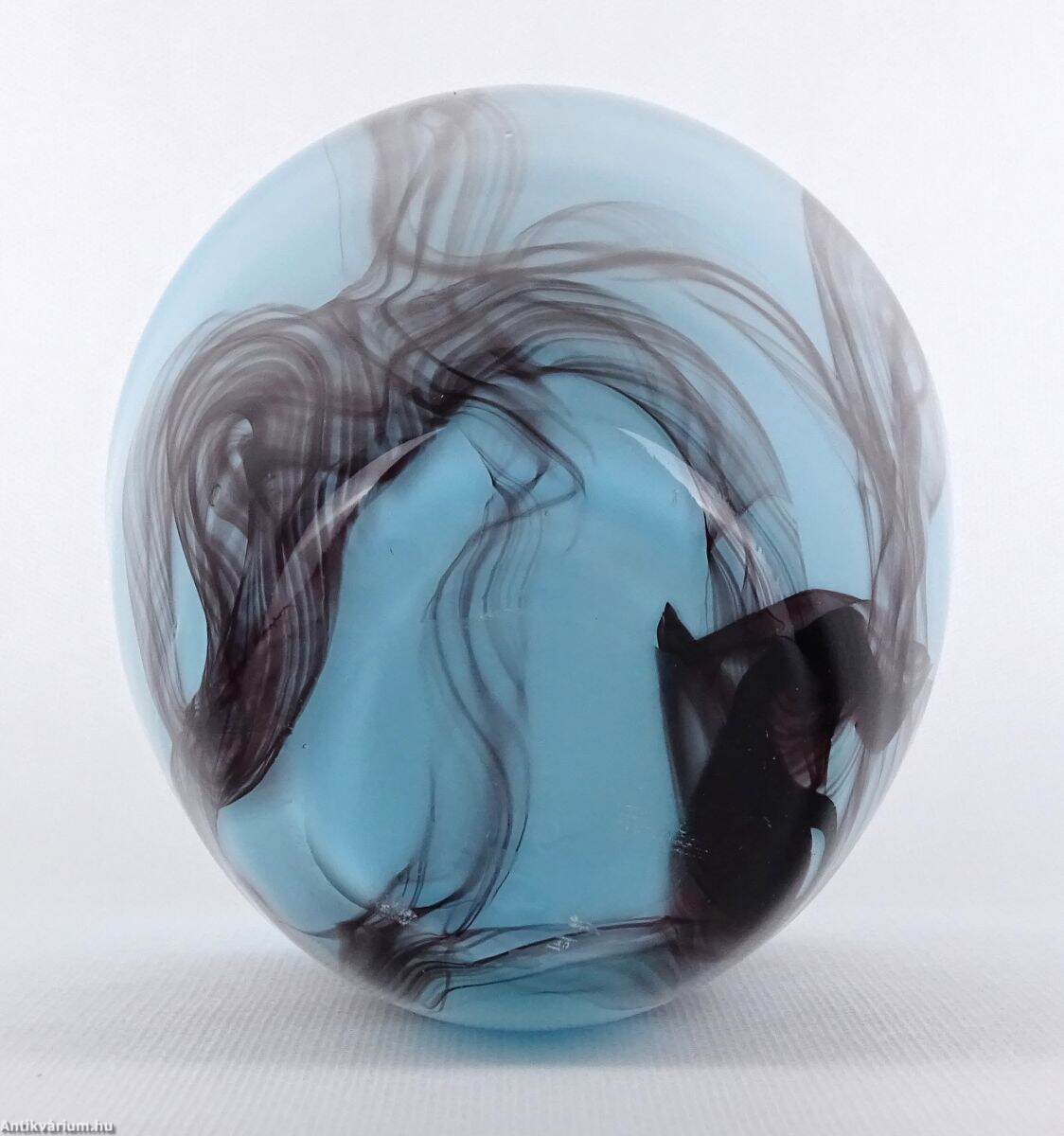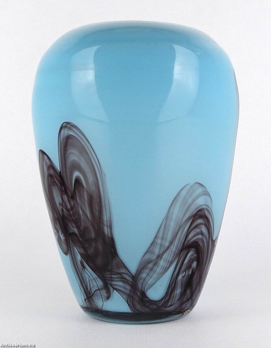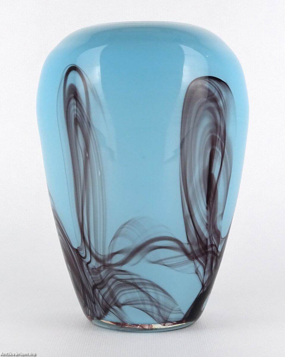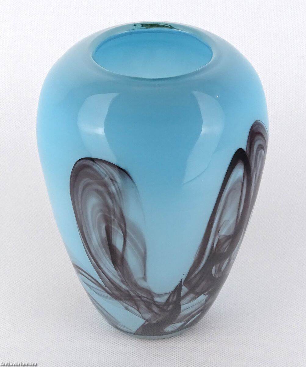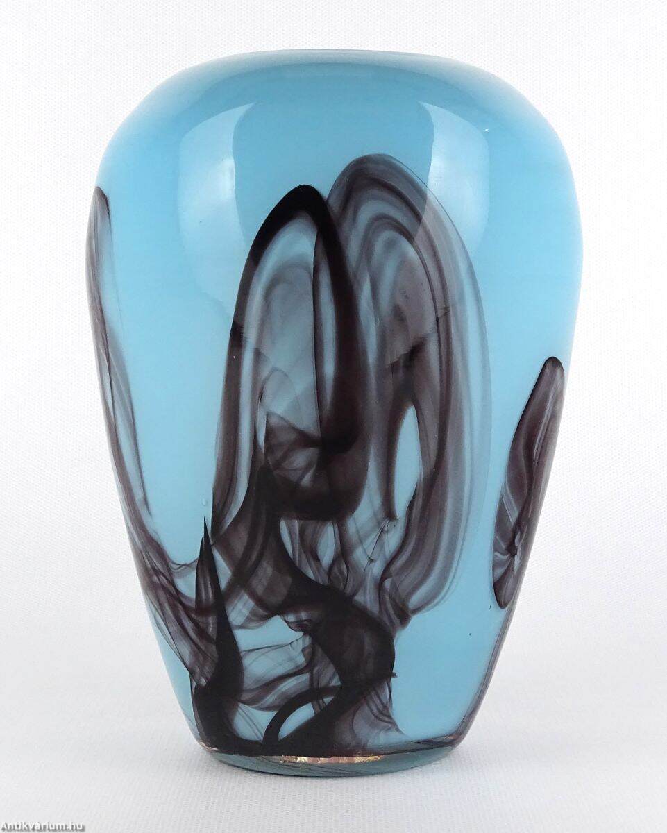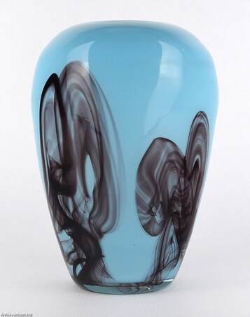 Hibátlan állapotú muranoi üveg váza a 20. század közepéről. Kézzel fújt és formázott, több rétegű váza, égszínkék-fekete színben, belehúzott kavargó - füst mintával. A fújás hely (köldök) helye a talpán körkörösen kicsiszolt.
