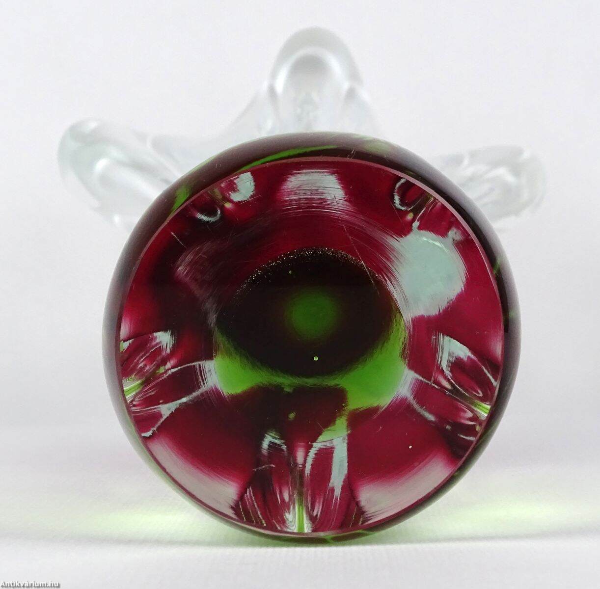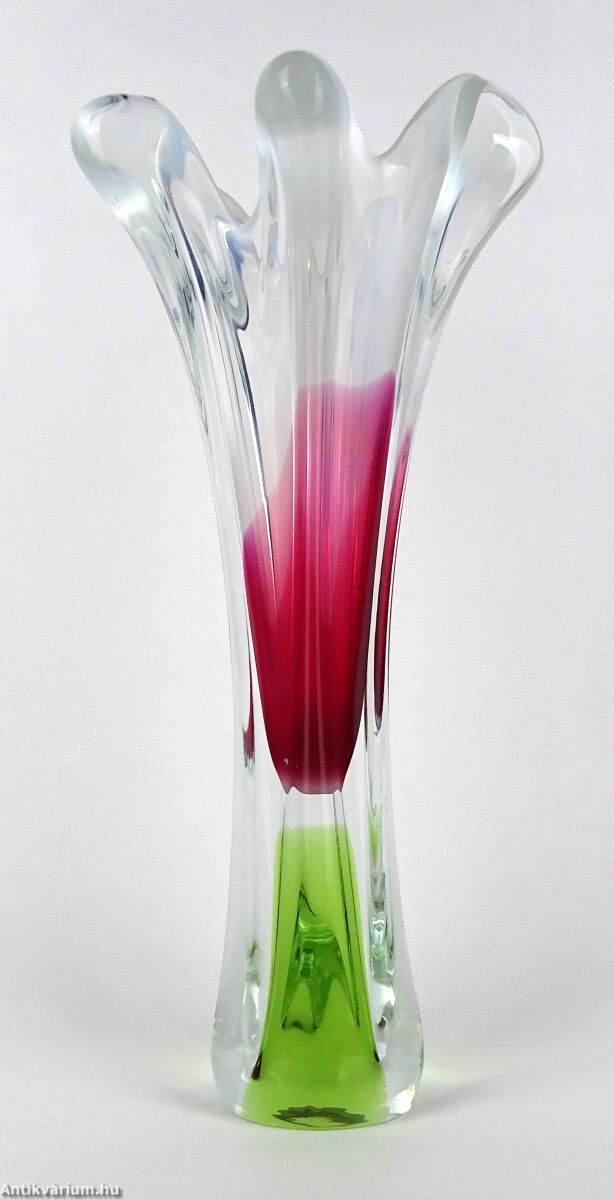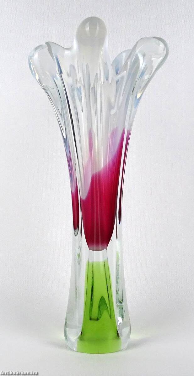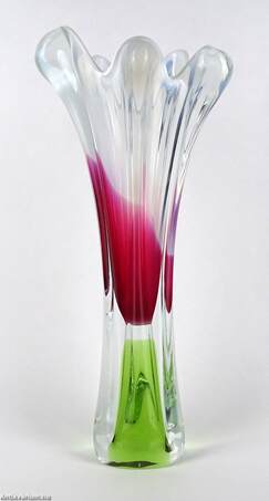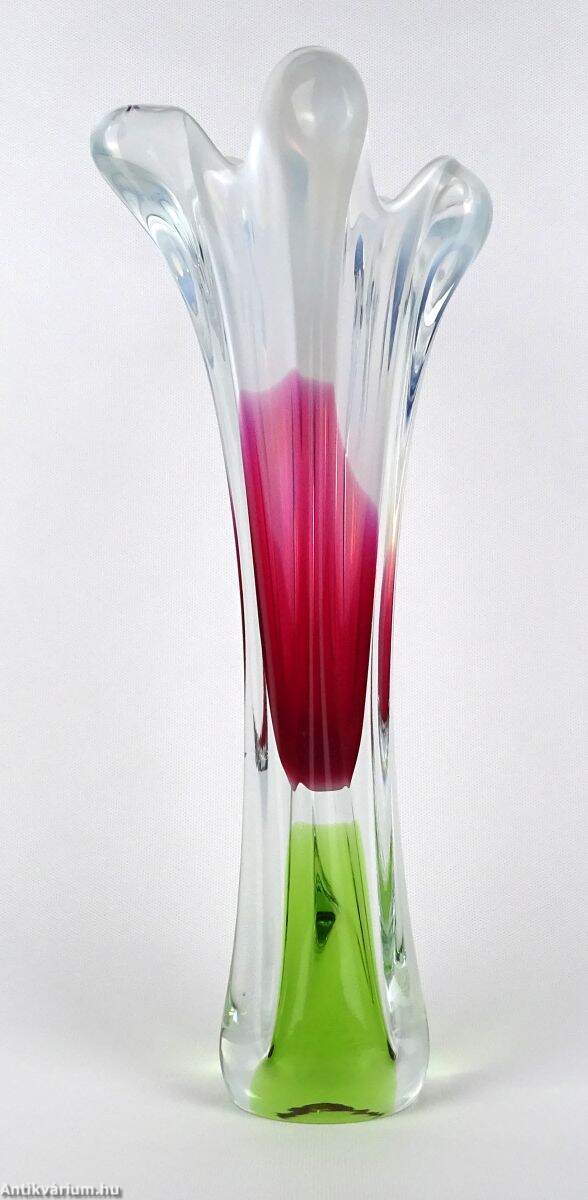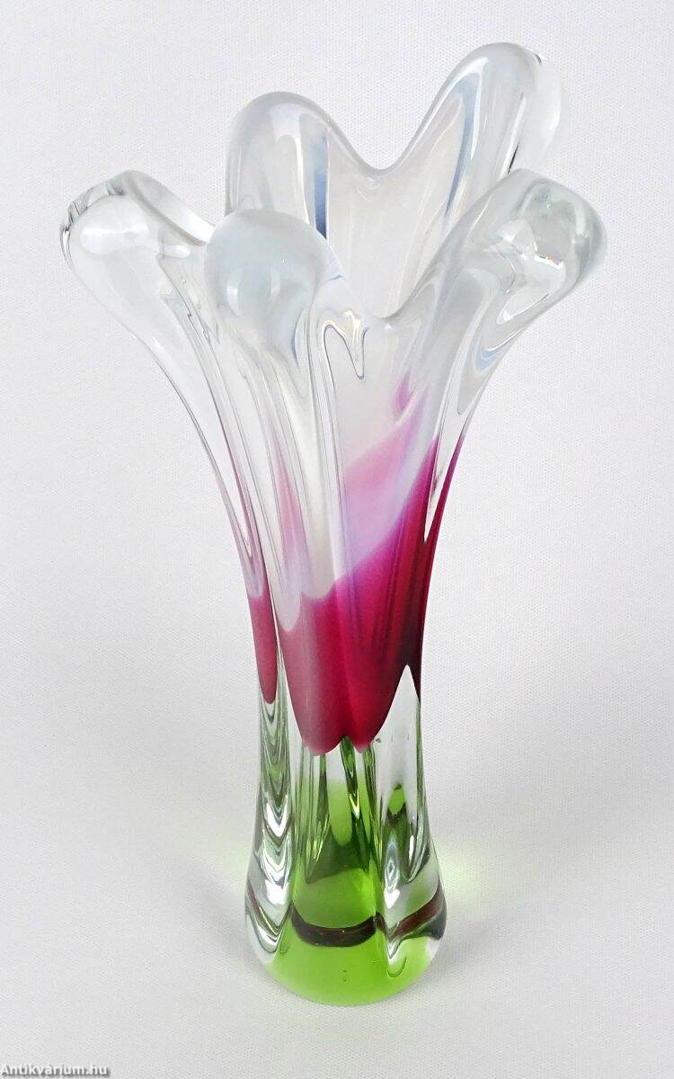 Hibátlan állapotú, Prof. Josef Hospodka által tervezett üveg váza. Kézzel fújt és formázott, zöld és ciklámen belső színezéssel. Fölső kiszélesedő peremén hullámszerű, tejüveg díszítéssel. Talpa simára csiszolva. A Chřibská üveggyárat, teljes nevén Sklarna Chřibská 1414-ben alapították Chřibská városában, amely eredetileg Csehországhoz tartozott, majd 1919-ben Csehszlovákia része lett. A gyárat bezárásáig Európa legrégebbi üveggyáraként ismerték. Josef Hospodka az 1950-es években csatlakozott a gyárhoz, eleinte a chřibskái üvegipari iskolát vezette, majd 1958-1970 között a Chřibská vezető tervezője lett egészen 1989-ben bekövetkezett haláláig. Ebben az időszakban számos organikus, szoborszerű fúvott üvegtervet készített, amelyek nagyon népszerűnek bizonyultak.