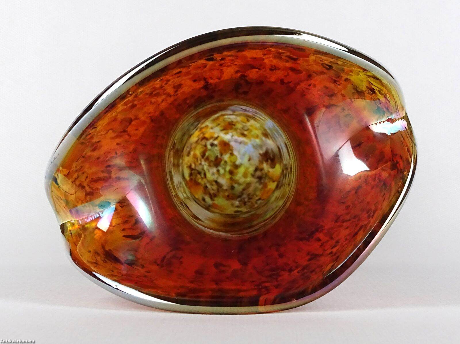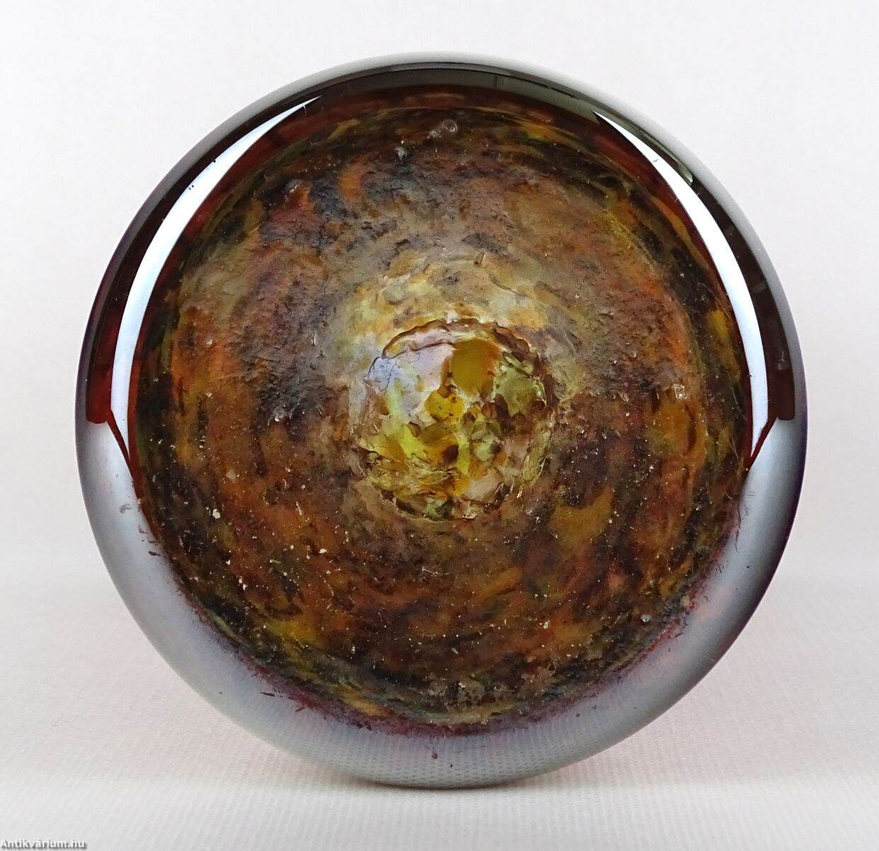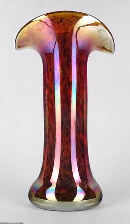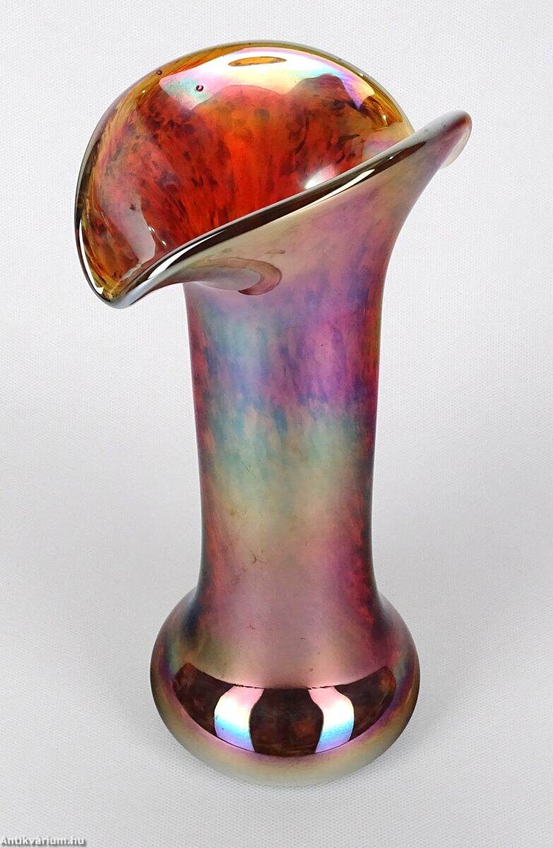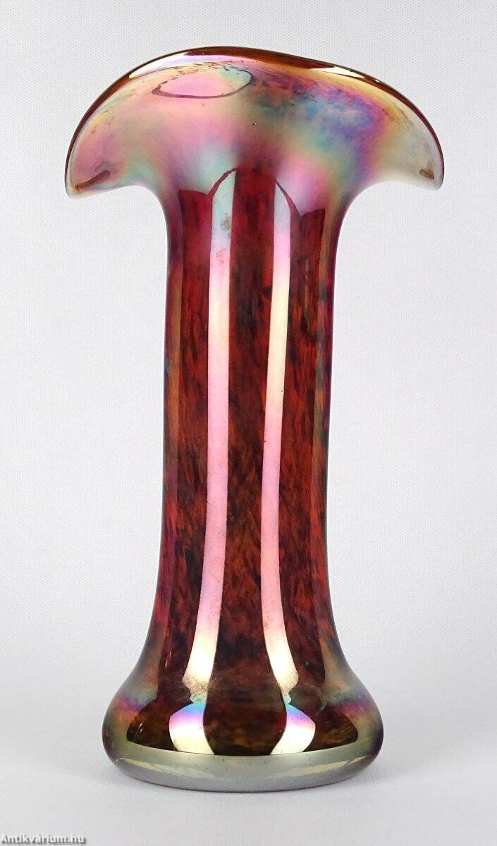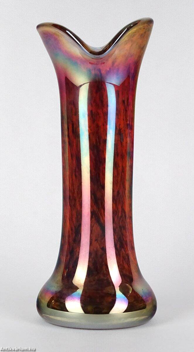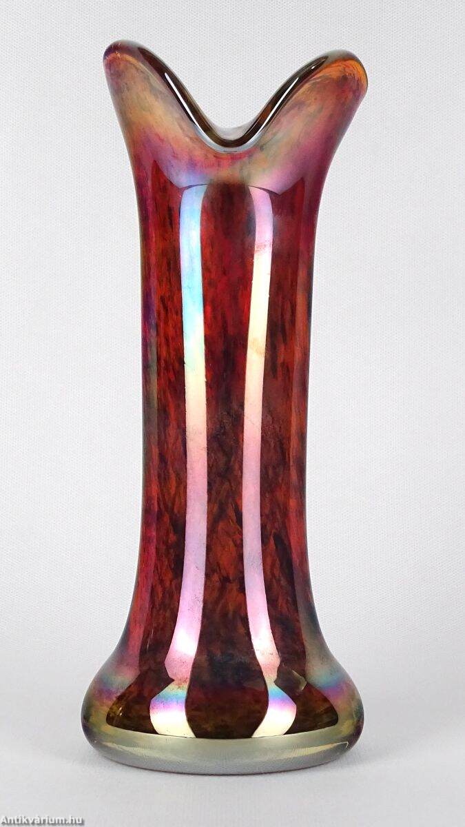 Hibátlan állapotú, lüszteres studio váza, talpán a fújás helye ( köldök ) látható. Kézzel fújt és formázott. A nehézfémoxidos variáció többszínű piros, irizáló árnyalatokat hoz létre. Alkotás ideje 20. század második fele. Studio üveg, azaz az üveg modern felhasználása művészi szobrok vagy háromdimenziós műalkotások készítésére. Az így elkészített üvegtárgyak szobrászati vagy dekoratív megjelenést kölcsönöznek. Elkészítésük kis műhelyekre korlátozódik, jellemzően a darabot tervező művész személyes közreműködésével. Ez ellentétben áll a műüveggel, amelyet gyári kézművesek készítettek, és az üvegművészettel, amely a történelem során készített művészi érdeklődésű üvegek teljes skáláját lefedi. A "stúdióüveg" kifejezést leginkább az 1960-as években készült munkákra használják, amikor a művészi üveggyártás iránti érdeklődés nagymértékben feléledt. A darabok gyakran egyediek, vagy kis limitált példányszámban készülnek.