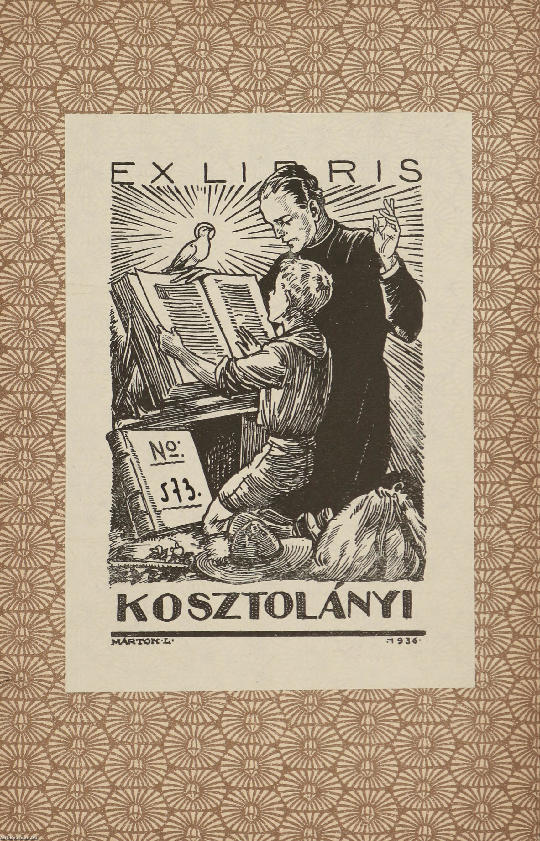 A címlapon Kosztolányi István (1903-1977) esztergomi kanonok tulajdonosi bejegyzése, valamint a címfedél belső oldalán fekete-fehér illusztrációval ellátott, 8,5 cm x 12 cm nagyságú Ex-libris címkéje látható. Az Ex-libris címkét Márton Lajos festőművész, grafikus készítette.