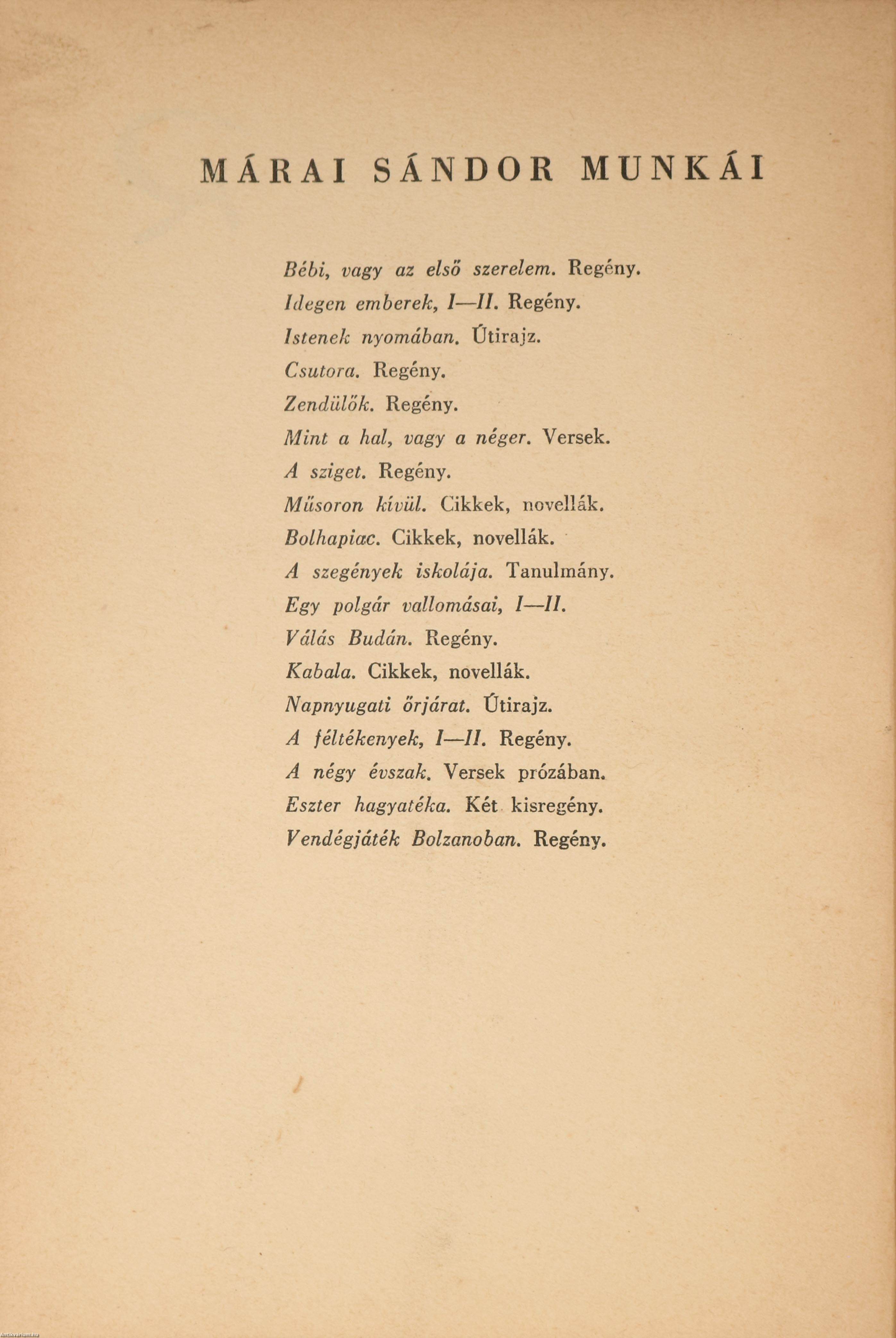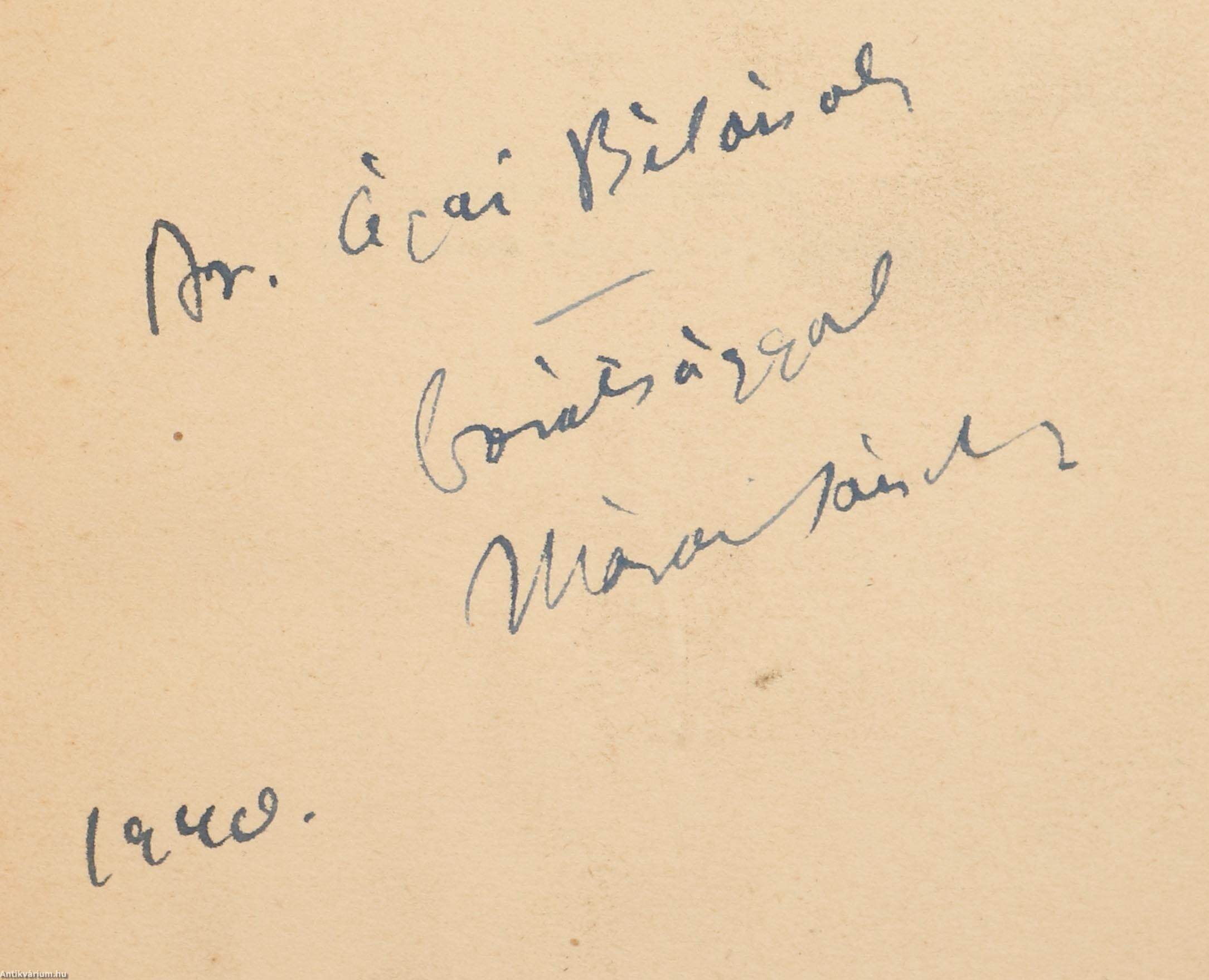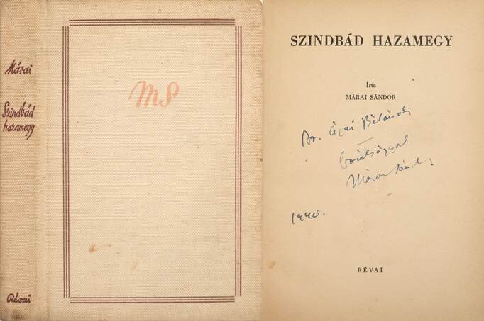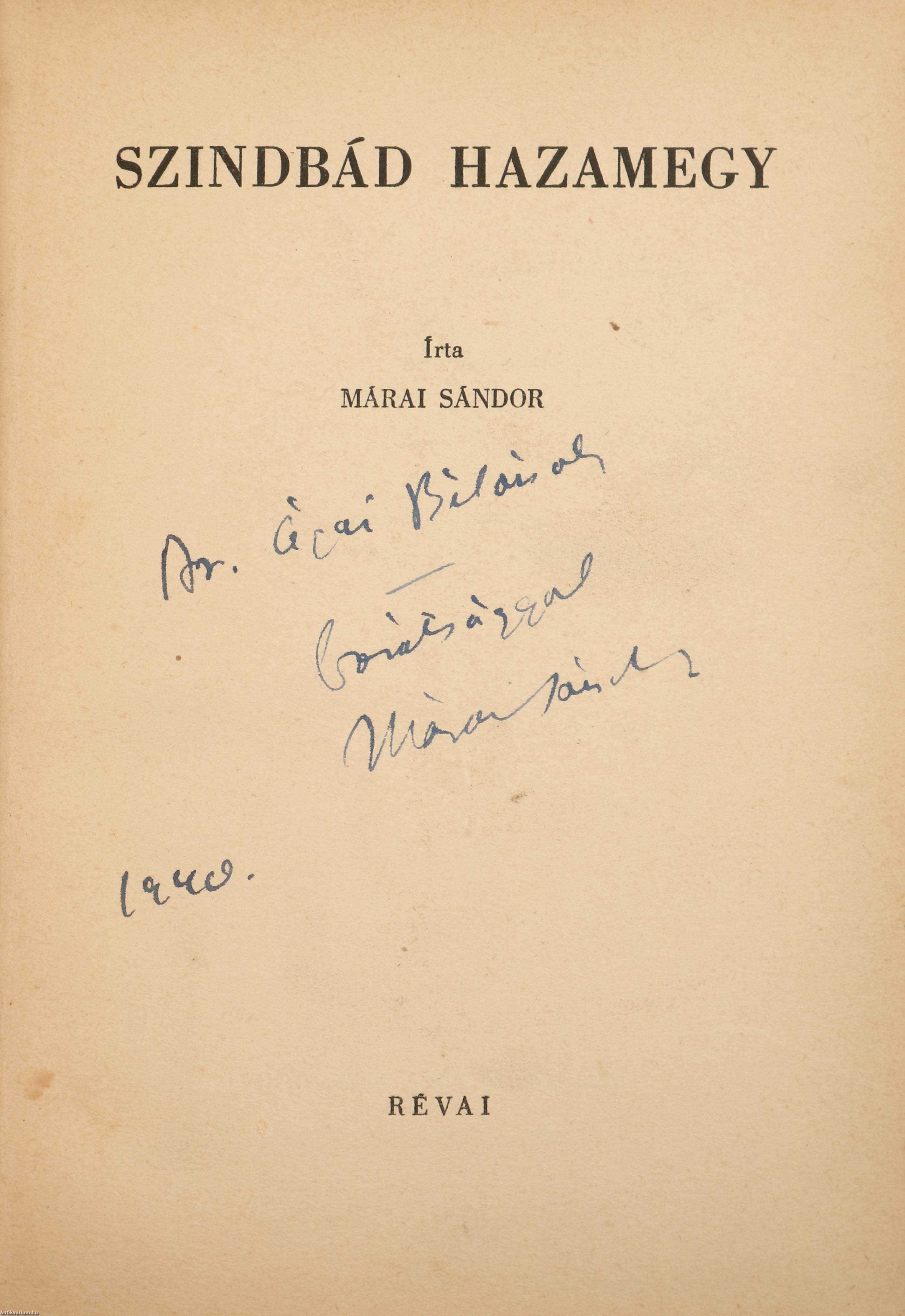 Szerző által dedikált példány.Első kiadás. Szinbád hazamegy. Írta: Márai Sándor. A címlapon a szerző, Márai Sándor tollal beírt, névre szóló dedikációja olvasható: "Dr. Ágai Bélának barátsággal Márai Sándor 1940." A dedikáció címzettje: Ágai Béla [született: Schäffer] (1871-1944) orvos, újságíró, lapszerkesztő. Ágai 1925-től az Ujság című, Márai Sándor írásait rendszeresen közlő folyóirat felelős szerkesztője, 1939-42-ig a lapot kiadó részvénytársaság vezérigazgatója volt. Nyomtatta a Révai Nyomda, Budapesten. Kiadói egészvászon sorozatkötéseben lévő példány a szerző színes monogramjával díszített címfedéllel, feliratos könyvgerinccel, néhány foltos lappal, hiánytalan állapotban. A kötet szerzője Márai Sándor (Kassa, 1900. április 11. – San Diego /USA/ 1989. február 21.) író, költő, újságíró. A polgári világ és a polgári regény magyar nagymestere, a polgárság érzésvilágának, "külső és belső életének, reményeinek és reményvesztéseinek, bonyolult lelki tükrének" emlékezetes megszólaltatója. Termékeny, kiforrott stílusú szerző. Gazdag életműve egyéni tragédiája és kényszerű vándorlásai ellenére is teljesnek mondható. Sikeres, örökzöld regényei ma is elevennek és időtállónak bizonyulnak.